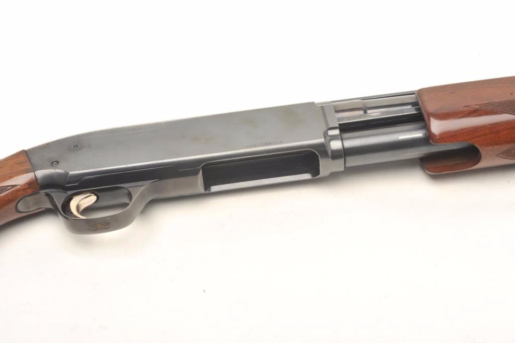 Browning BPS pump shotgun, #3297YMM121. 20 Gauge, 22" high-ribbed Bbl., with screw-in chokes; shotgun is in fine to excellent used condition. Finish is 90-95% with some thinning on the right side of thereceiverwhere some aggressive cleaning was done. Est. $200-400. (Modern)
