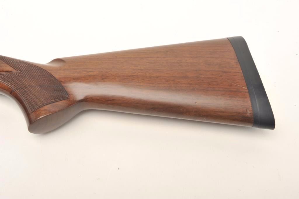 Browning BPS pump shotgun, #3297YMM121. 20 Gauge, 22" high-ribbed Bbl., with screw-in chokes; shotgun is in fine to excellent used condition. Finish is 90-95% with some thinning on the right side of the receiverwhere some aggressive cleaning was done. Est. $300-600. (Modern)