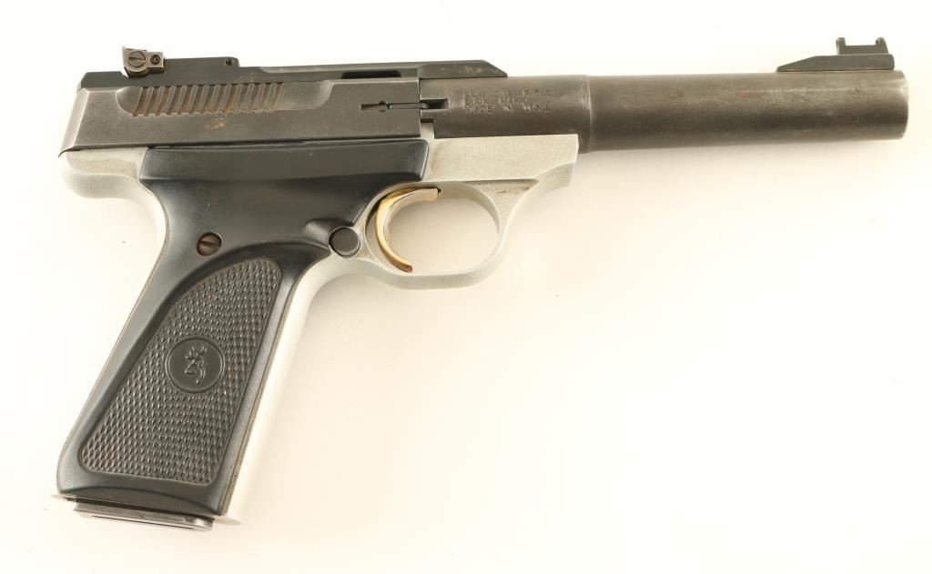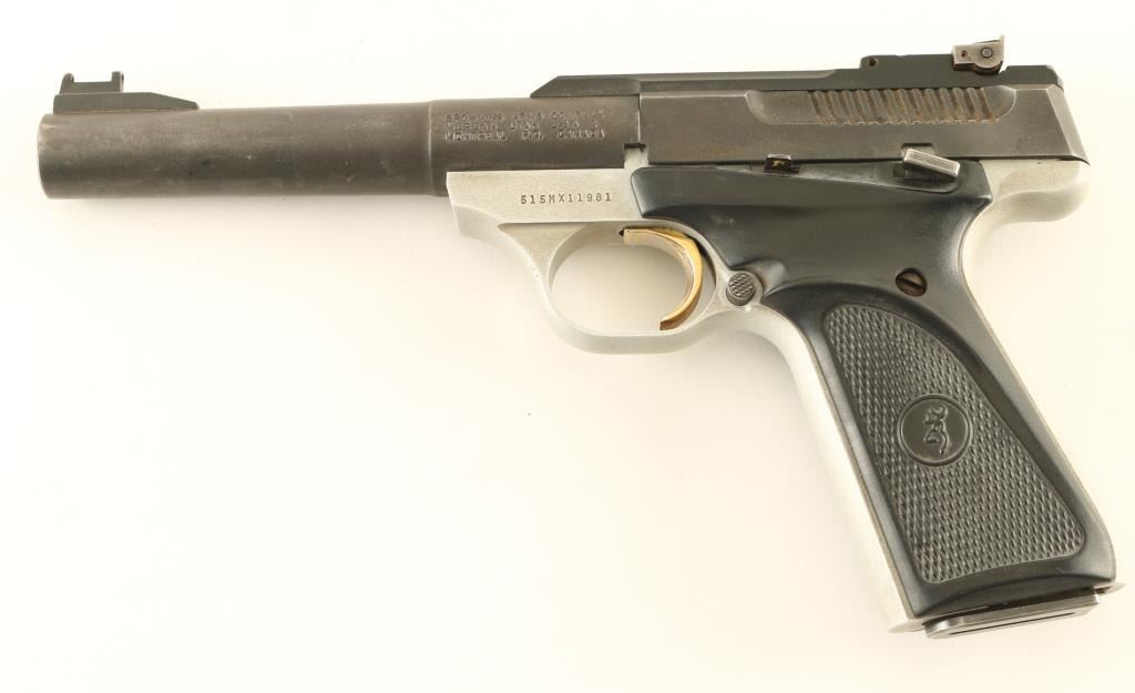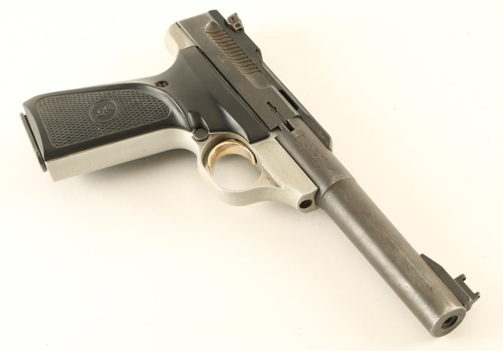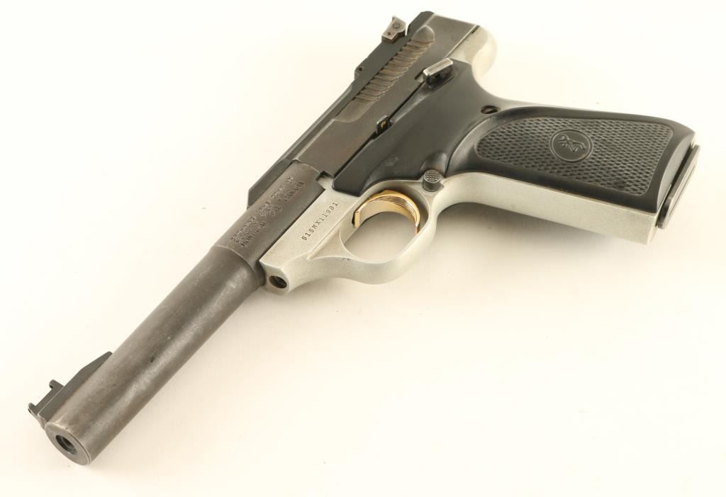 Semiautomatic pistol features 5.5" bull barrel, adjustable rear sight, ramp front sight (missing the fiber optic insert), two tone finish (matte blue top, light gray frame) with gold accent trigger, manual safety, push button magazine release. Bore is very good condition. Retains 70% matte blue finish on barrel and slide, turning dull thin gray with bare metal showing on edges, near muzzle, rear of slide. Frame color is light gray, appears to have traces of a darker color in pores of metal, possibly cleaned with a solvent that removed the original color. Slide lock button is missing the larger tab, still useable but the control surface is small and a bit sharp. Good condition grips have checkered panels, thumb rest ridges, slightly rubbery feel. Grip screws have surface rust. Includes one magazine. Condition is NRA Good *** Modern Firearm ***