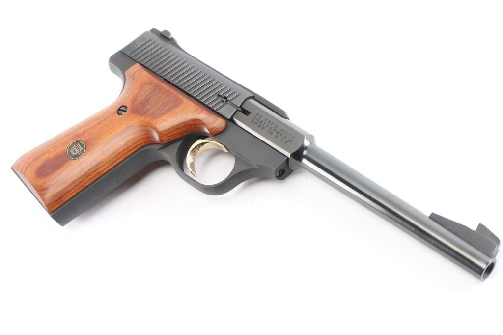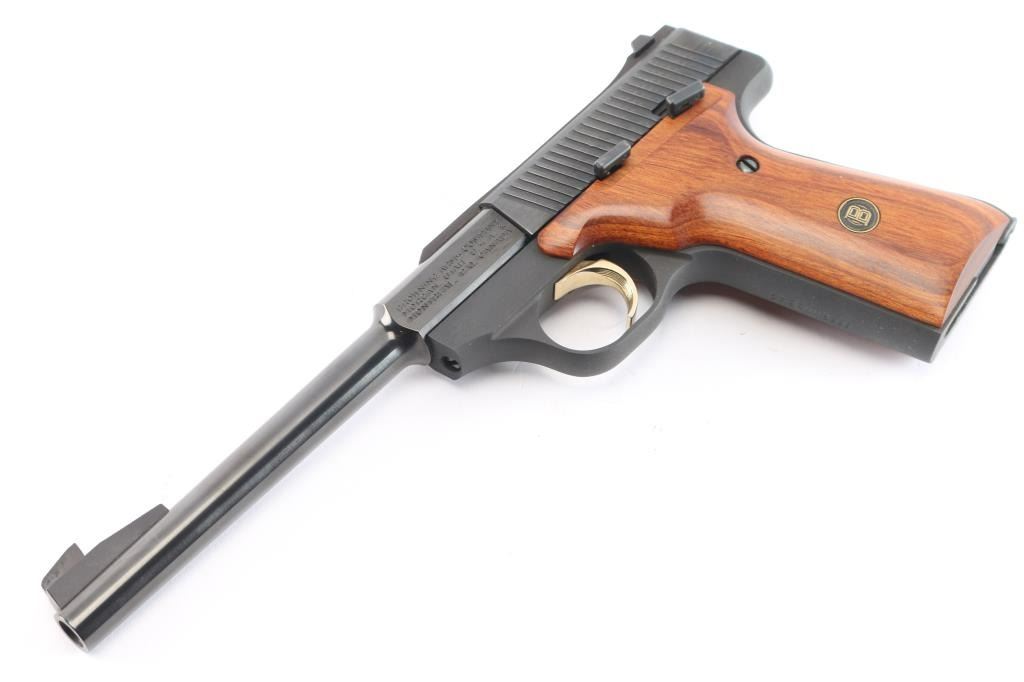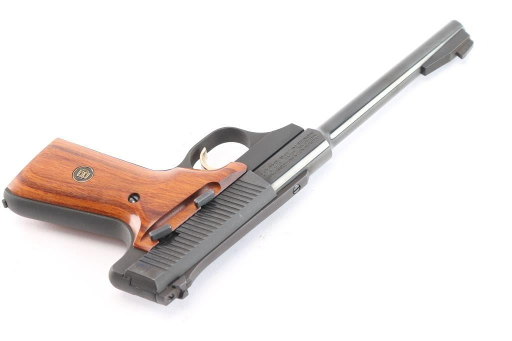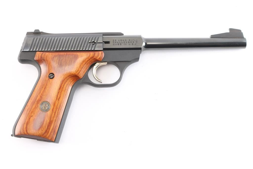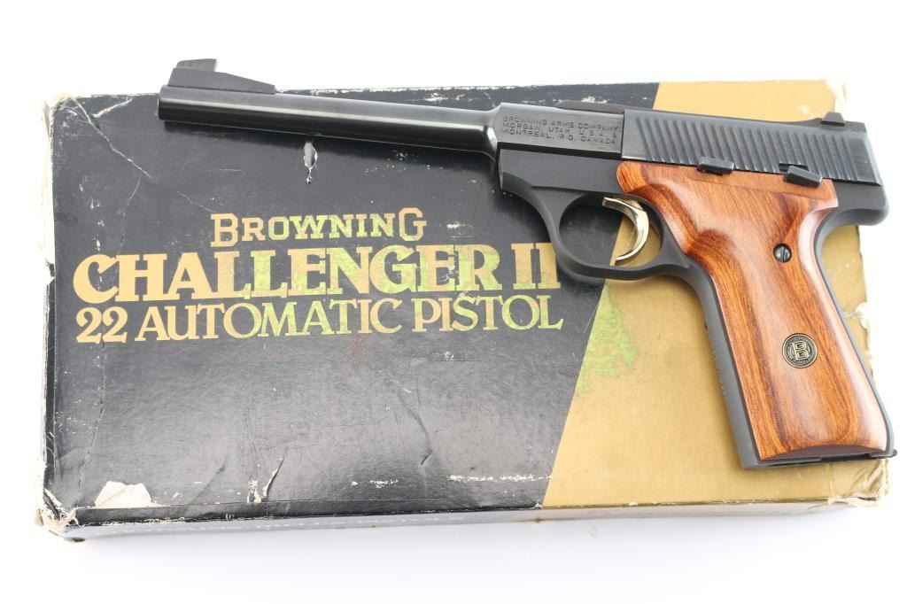 1980 Browning Challenger II, 22LR pistol made in the U.S. The Challenger was created in response to the Ruger Mark II. It features a rounded beavertail, curves cut in the slide with full-length serrations, a ramped blade front sight, dovetailed adjustable rear sight, smooth two piece hardwood grips with medallions, gold curved serrated trigger, frame mounted safety, heel magazine release, smooth front-strap and backstrap, and round barrel with a recessed crown. The blued finish is 99%, the grips are excellent, and the bore is excellent. It comes with original factory box and owners manual. Manufactured circa 1980 ('PM' date code).