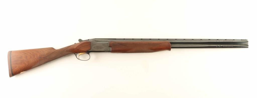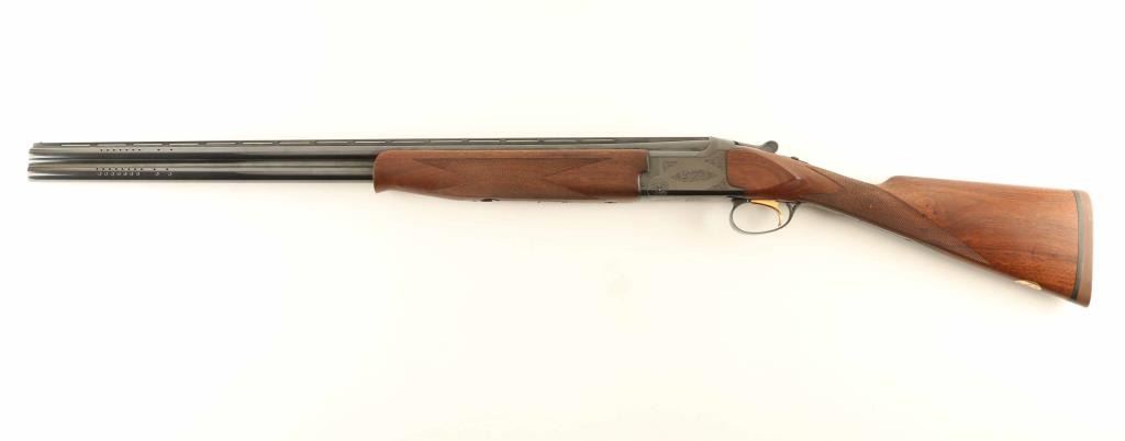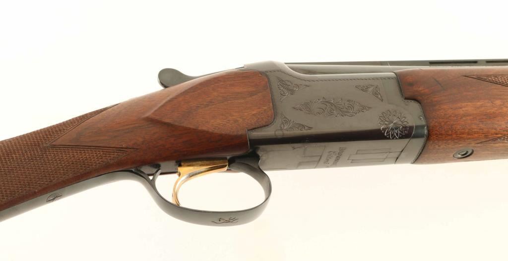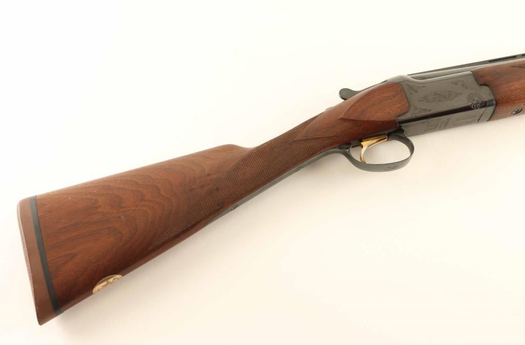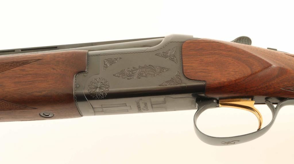 Japanese double barrel over-under shotgun imported by Browning Arms Co, Morgan UT. Takes up to 2-3/4" shells. Fixed chokes measure IC over CYL. Features blued finish, 26" ported barrels with ventilated rib, brass front bead, tang safety / barrel selector, single inertia trigger with gold accent, limited floral scroll engraving on receiver, English style straight grip stock, schnabel forend tip, checkering at wrist and forend, solid rubber butt pad. Bores are excellent condition. Retains 90% blue with few signs of handling or use. Wood is excellent condition with few small dents. Has oval brass monogram disc on bottom of stock, with initials "SPS". Approx stock measurements: 12-1/4" Length of Pull, 1-1/2" Drop at Comb, 2-1/4" Drop at Heel. Condition is NRA Excellent *** Modern Firearm ***