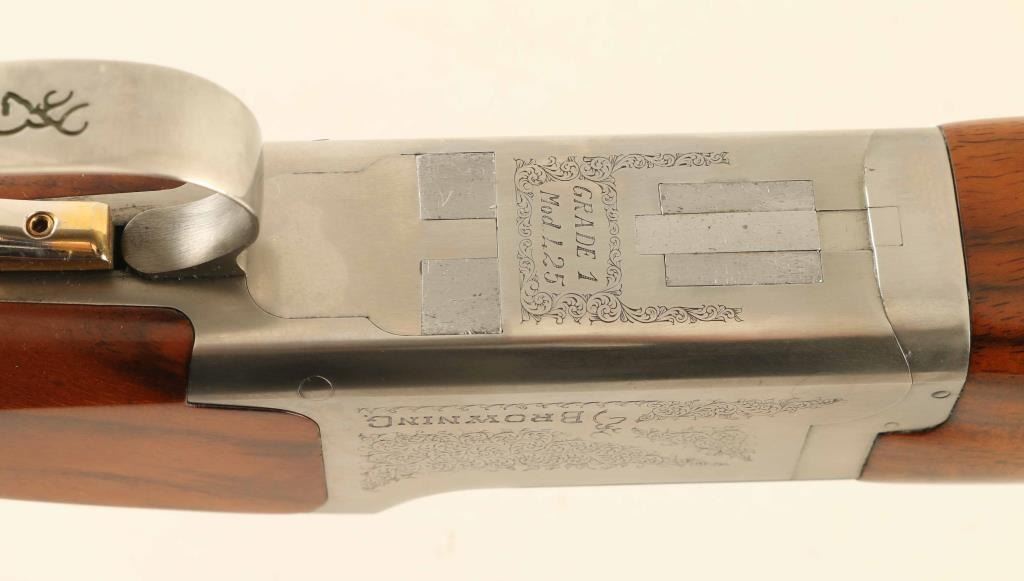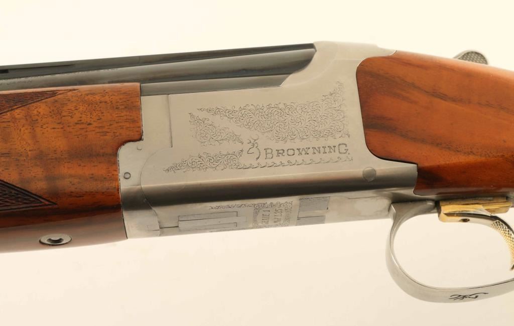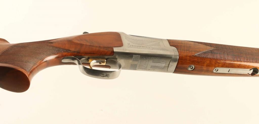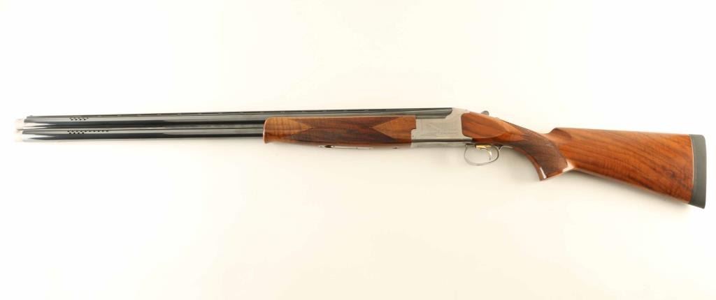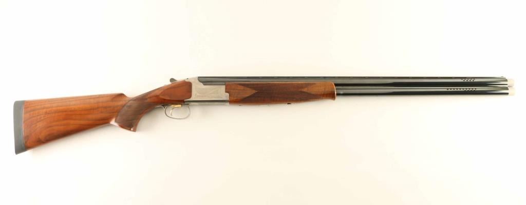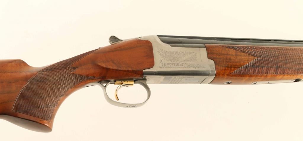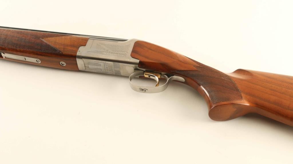 'Grade 1' Over/Under shotgun made in Japan for Browning Arms Co, Morgan UT. Accepts 2-3/4" shells. Features high polished blue finish, engraved coin finished receiver, fancy figured walnut butt & forend, checkering at wrist & forend, 30" ported vent rib barrel, screw-in chokes (extended SK/SK installed), white polymer Bradley type front bead, white polymer mid bead, solid rubber "KICK-EEZ" recoil pad, selective ejectors. Single inertia trigger (wide, checkered, gold accent) is selectable at tang safety. Bores are very good condition. Metal retains 95% finish with scratches & scuffs, some loss of gold wash on trigger. Wood is excellent condition with few observed small creases. Approx stock measurements: 15" Length of Pull, 1-1/2" Drop at Comb, 2-1/4" Drop at Heel. Includes Browning belt case for choke tubes, with extended M & IM, (2) internal MOD tubes. Condition is NRA Excellent *** Modern Firearm ***