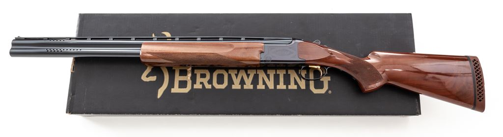 Browning Citori Grade 1 High Rib Over/Under Skeet Gun, #05976NW1B3. 26'' 12 ga. barrels feature a ventilated rib with target beads, 2-3/4'' chambers, are ported and fitted for Browning Invector Plus choke tubes (SK/SK installed). Wood is standard Field Grade with high gloss finish, and includes full beavertail forend, pistol-grip buttstock without grip cap, and original Browning butt pad. Action features single selective trigger, auto ejectors and non-auto safety. In original box with matching end label and owner's manual. Mfg'd 1994. Condition is 90%-95%, with few handling marks to buttstock. Action is tight, trigger pull is crisp, and ejectors function correctly. Est.: $800-$1,000. (Modern)