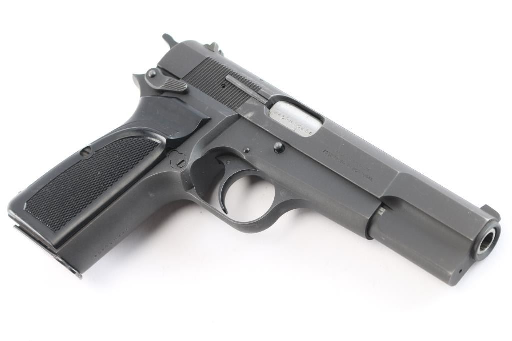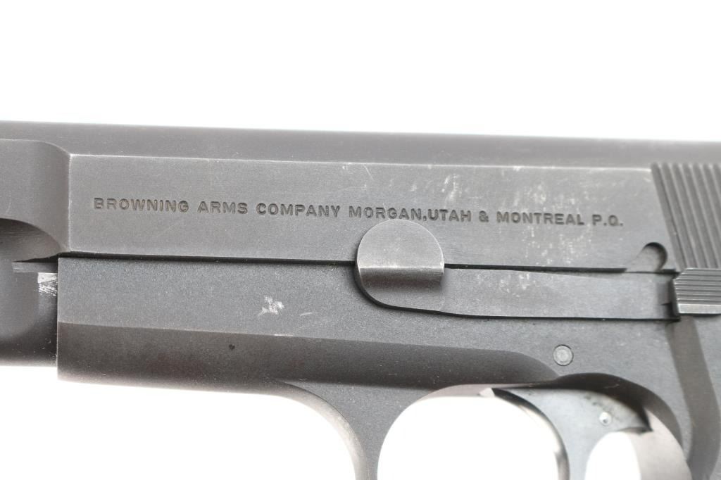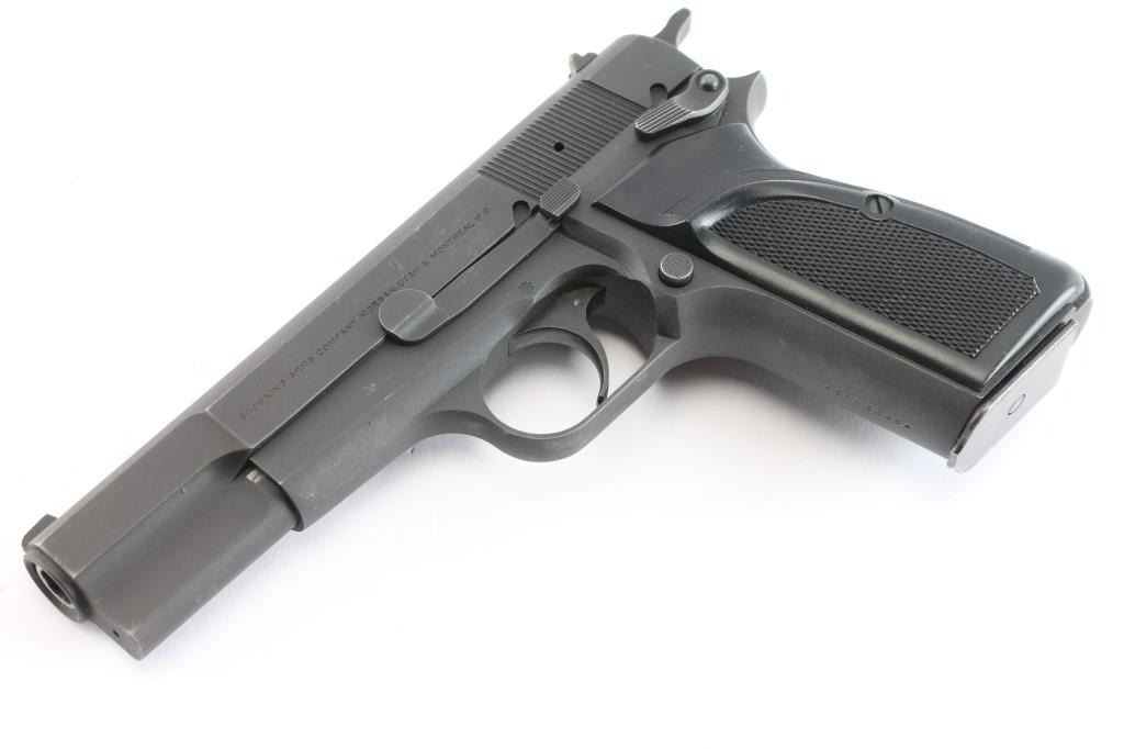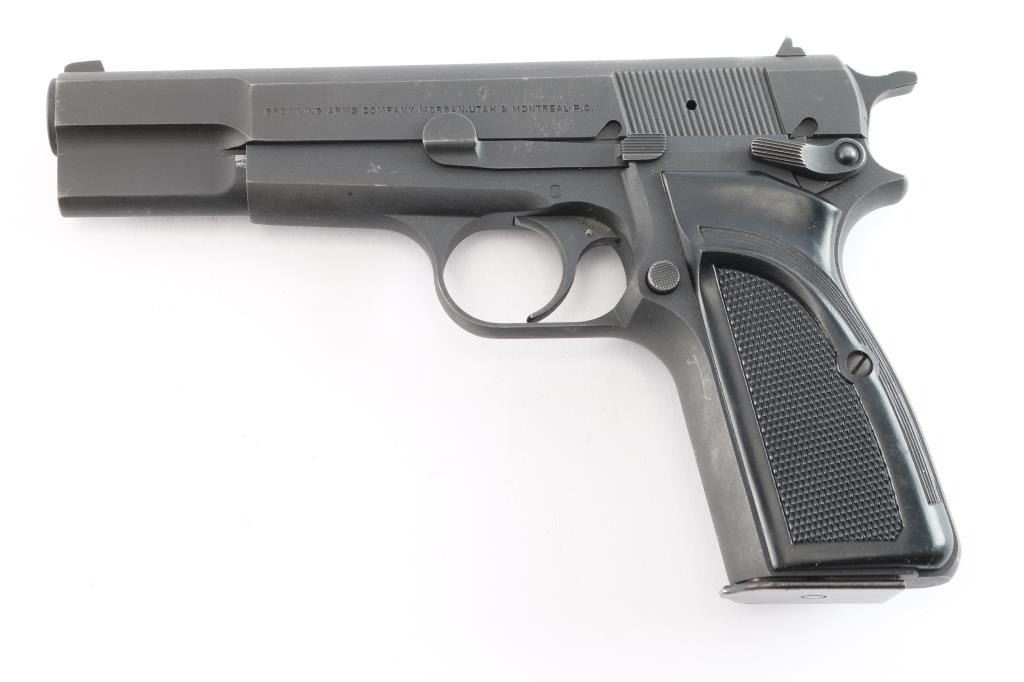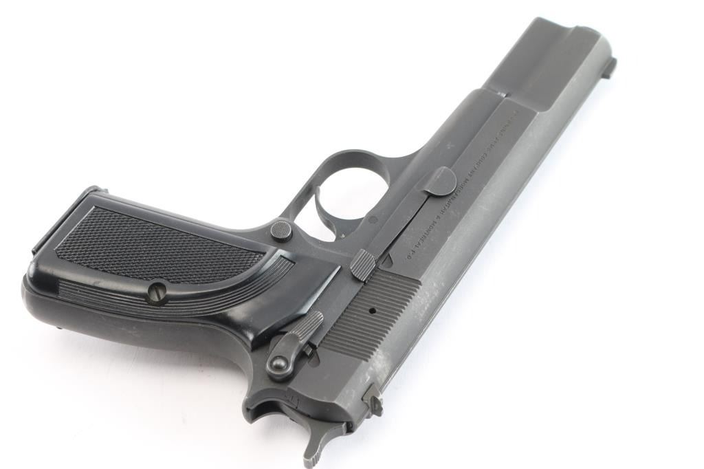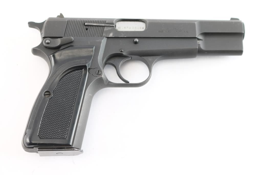 Mk II' Belgian single action semi-automatic pistol, Parts made in Belgium assembled in Portugal circa 1989, imported by Browning Arms, Morgan UT. Features matte black finish, 4.6" barrel, low profile blade front sight & square notch rear sight in dovetails, smooth trigger, serrated hammer spur, frame mounted manual safety, magazine disconnect safety, push button magazine release, black plastic checkered grips. Has the water drain hole below the muzzle on the forward face of the slide. Bore is excellent/bright. Overall excellent with some slight edge wear, friction wear to the finish.