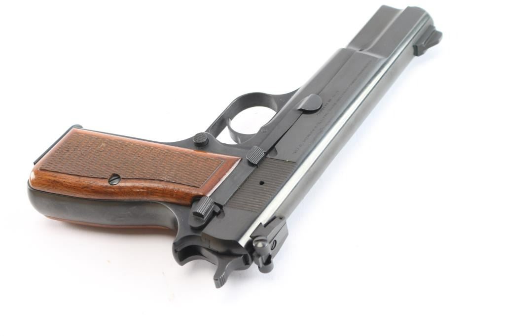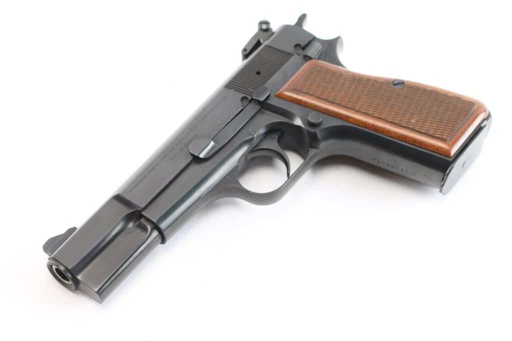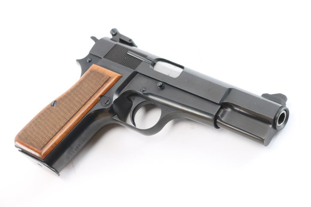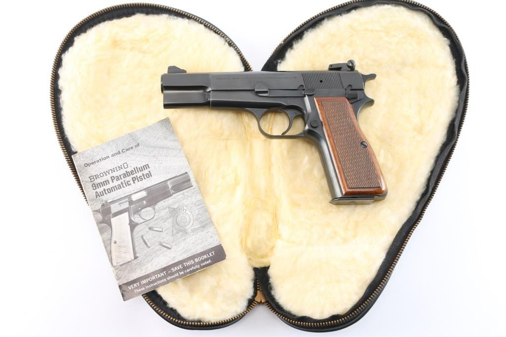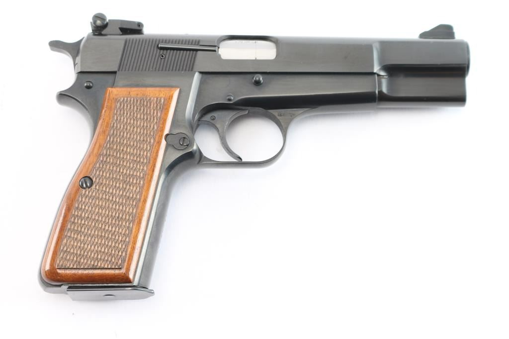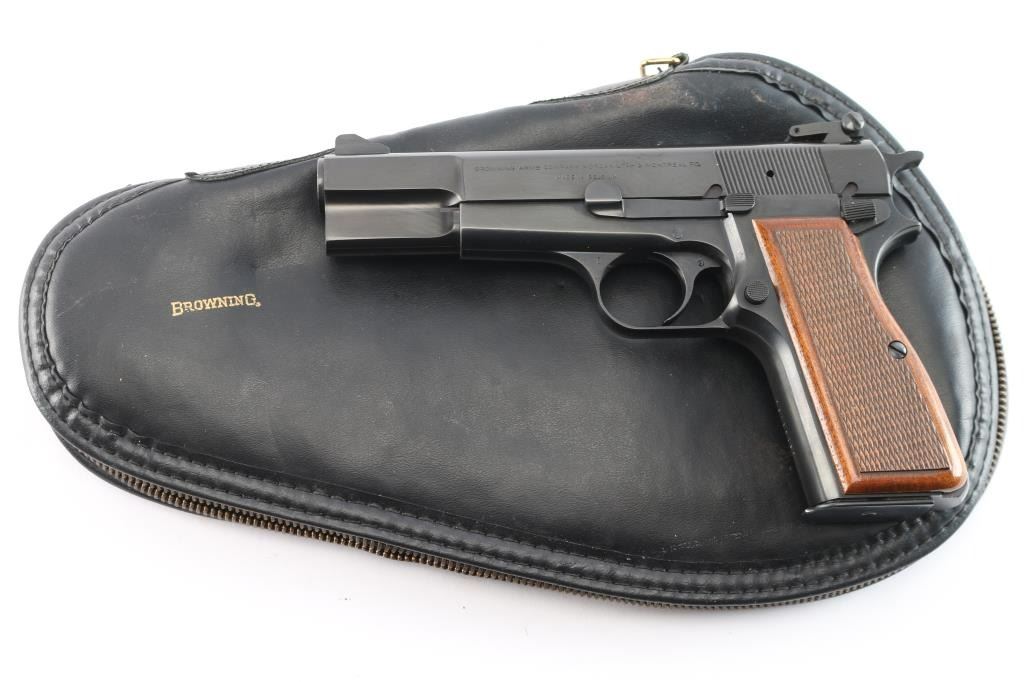 Desirable single action semi-automatic pistol chambered in 9x19mm, manufactured in Belgium by Fabrique Nationale circa 1976. This auction has another Hi-Power with a consecutive serial number of '76C88038'. This features a blued finish, 4.75" barrel, internal extractor, raised ramped blade front sight, dovetailed adjustable 'beer-can' rear sight, smooth curved trigger, serrated hammer spur, manual safety/slide catch on the left side of the frame, checkered push button magazine release, 13 round magazine, steel frame and two-piece checkered walnut grips. Pistol retains approximately 99% of its original finish. Action is smooth, the bore is excellent/bright and the grips are excellent. Comes with original manual. In soft case.