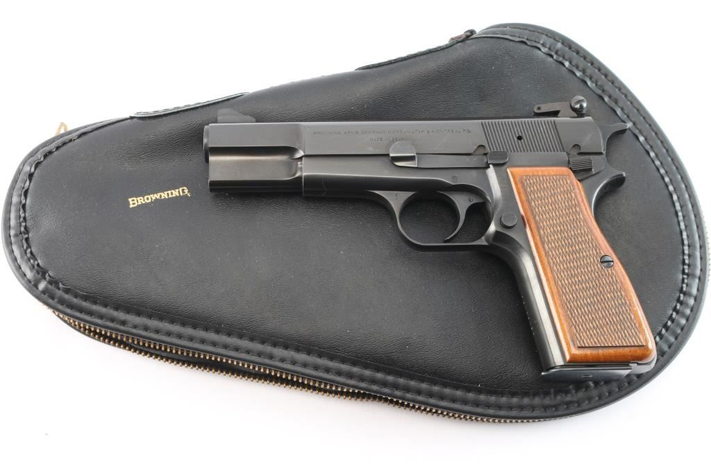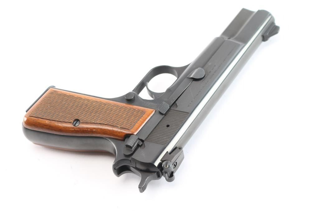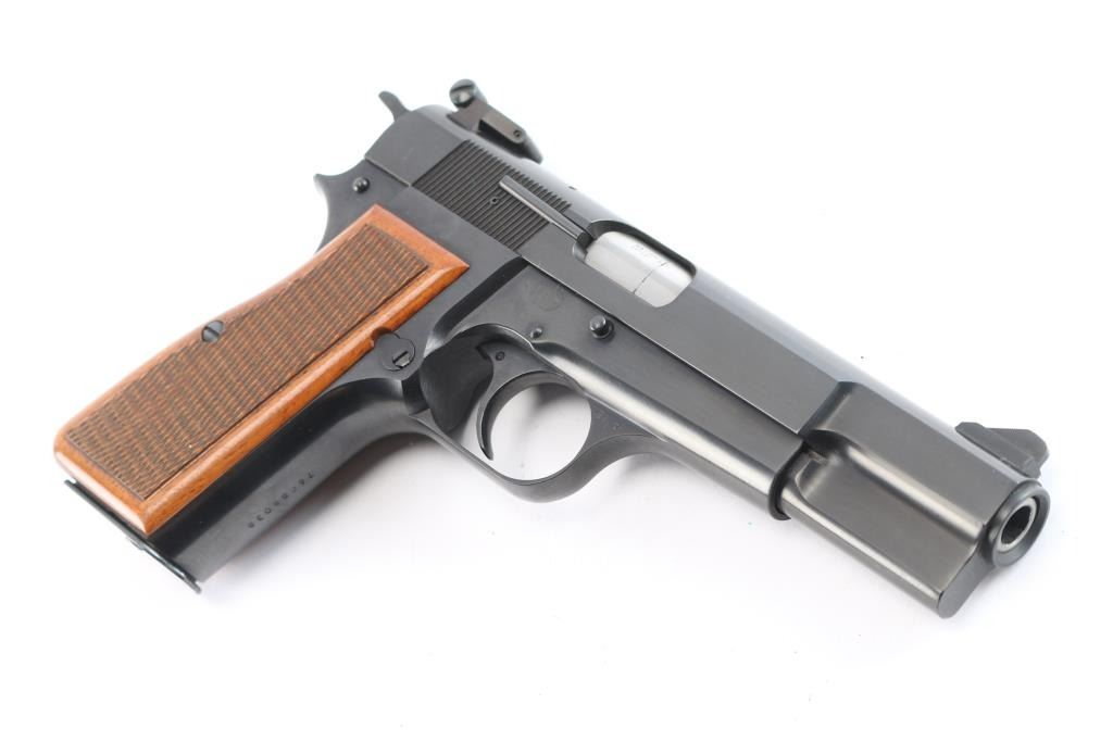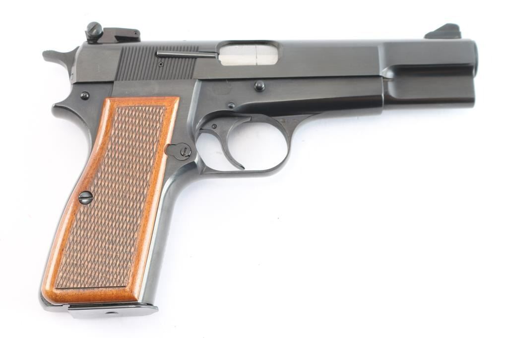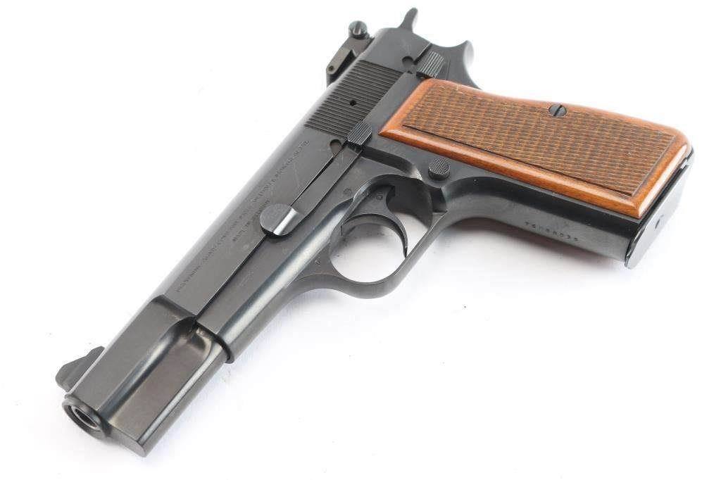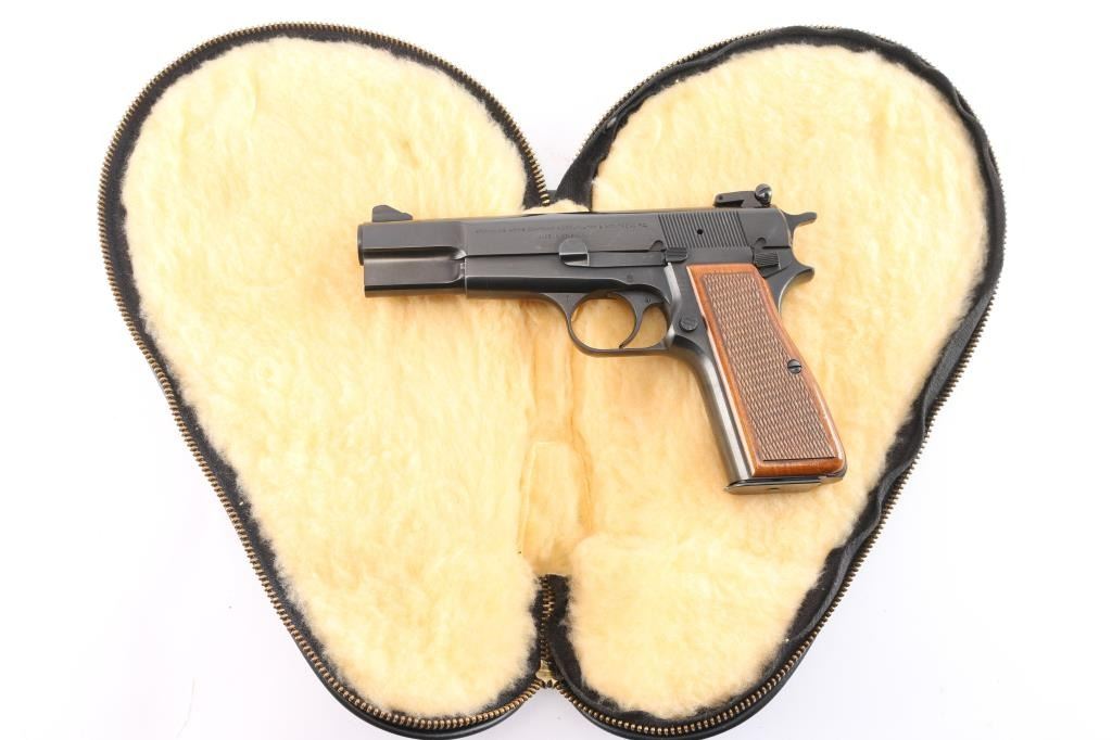 Desirable single action semi-automatic pistol chambered in 9x19mm, manufactured in Belgium by Fabrique Nationale circa 1976. This auction has another Hi-Power with a consecutive serial number of '76C88037'. This features a blued finish, 4.75" barrel, internal extractor, raised ramped blade front sight, dovetailed adjustable 'beer-can' rear sight, smooth curved trigger, serrated hammer spur, manual safety/slide catch on the left side of the frame, checkered push button magazine release, 13 round magazine, steel frame and two-piece checkered walnut grips. Pistol retains approximately 99% of its original finish. Action is smooth, the bore is excellent/bright and the grips are excellent. Comes in original soft case.