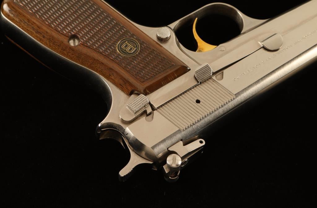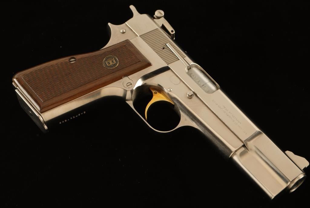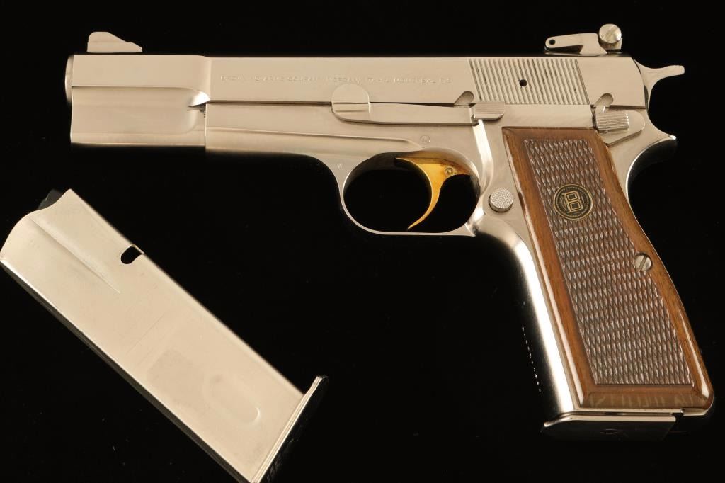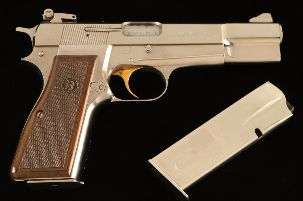 Belgium made single action semi-automatic pistol chambered in 9x19mm, circa 1981. Features a brushed nicked plated finish, 4.75" barrel, ramp front sight, adjustable rear window sight, smooth gold trigger, serrated hammer spur, push button magazine release, 13 round magazine and two-piece checkered wood grips with brass Browning medallions. Includes a Browning padded soft case with manual and spare magazine. Pistol exhibits very little wear with only a few light superficial scratches observed. Action is strong, bore is pristine and wood grips are fine. Condition is near new. ***Modern Firearm***