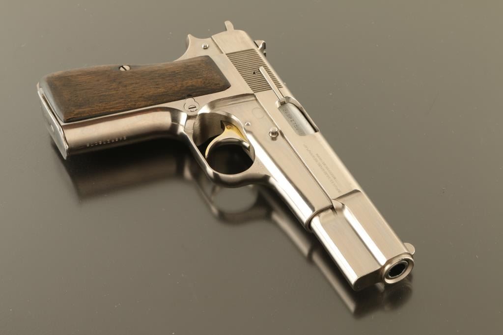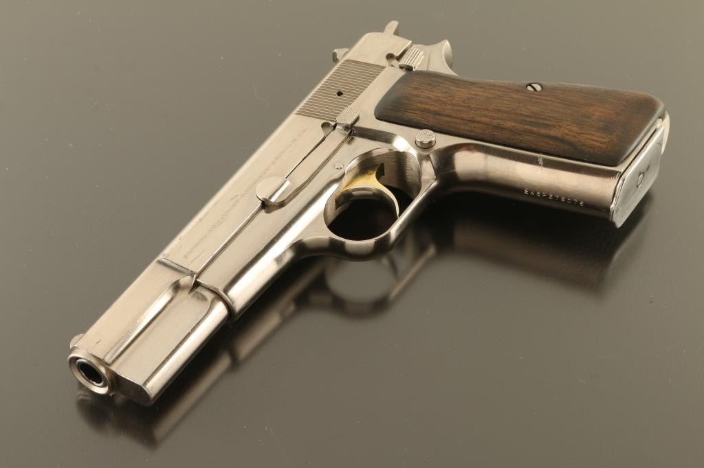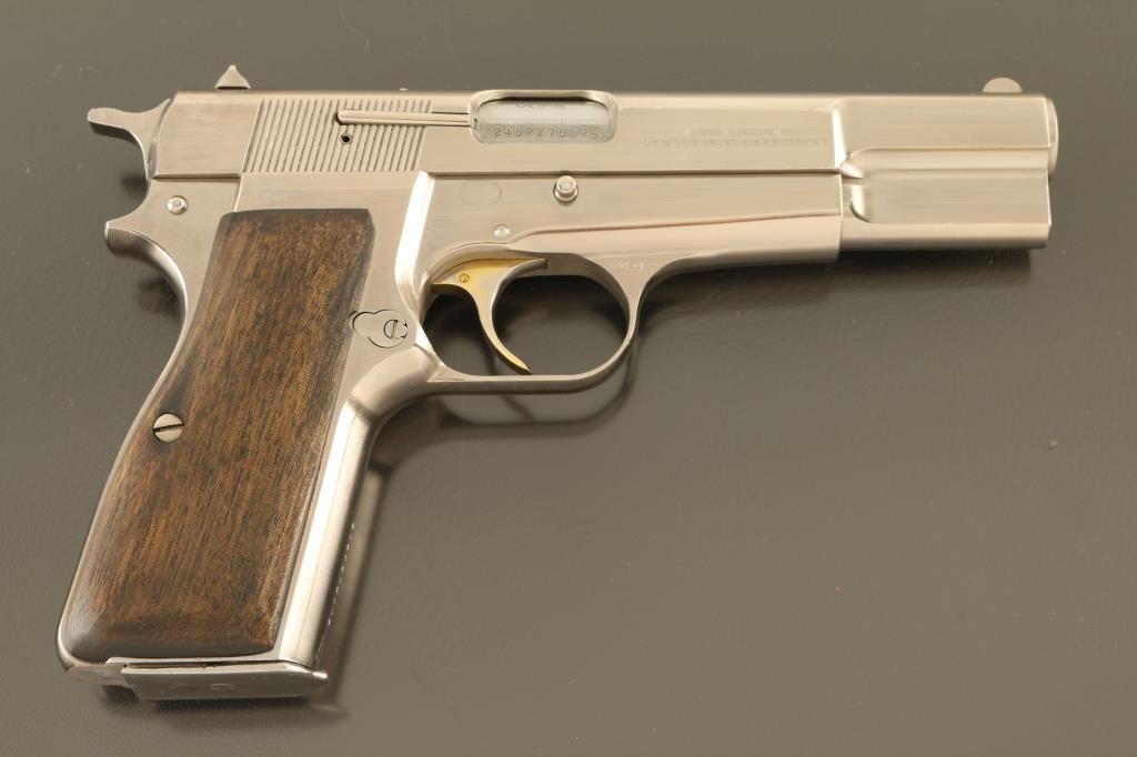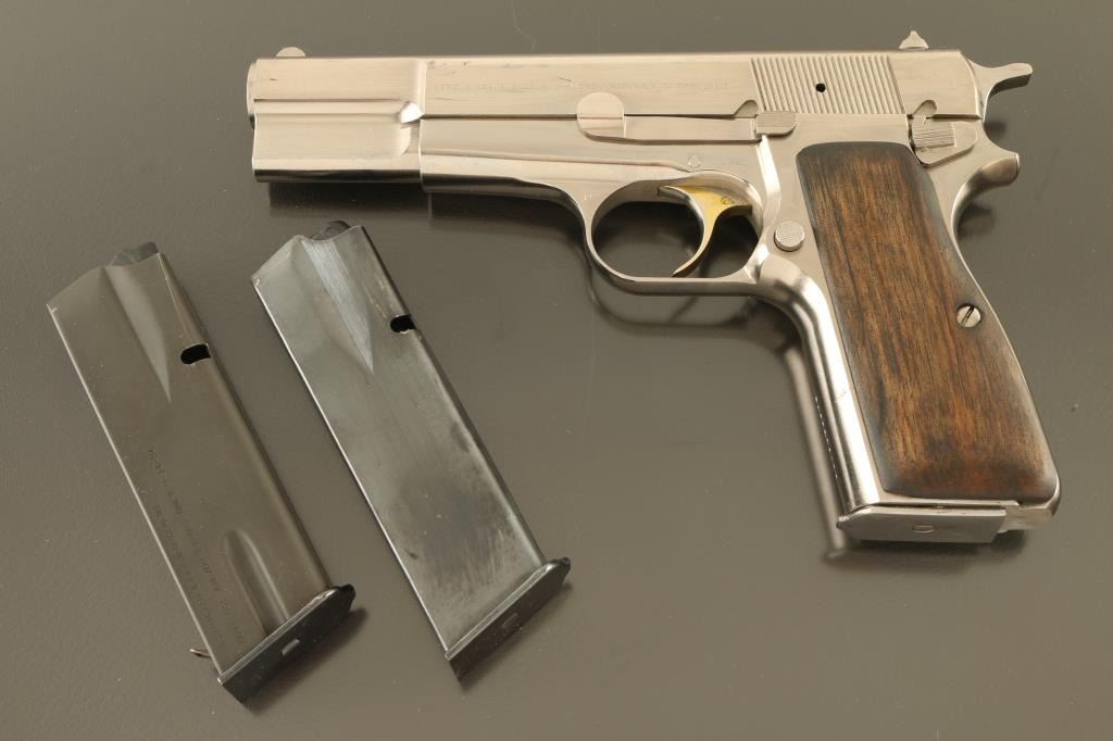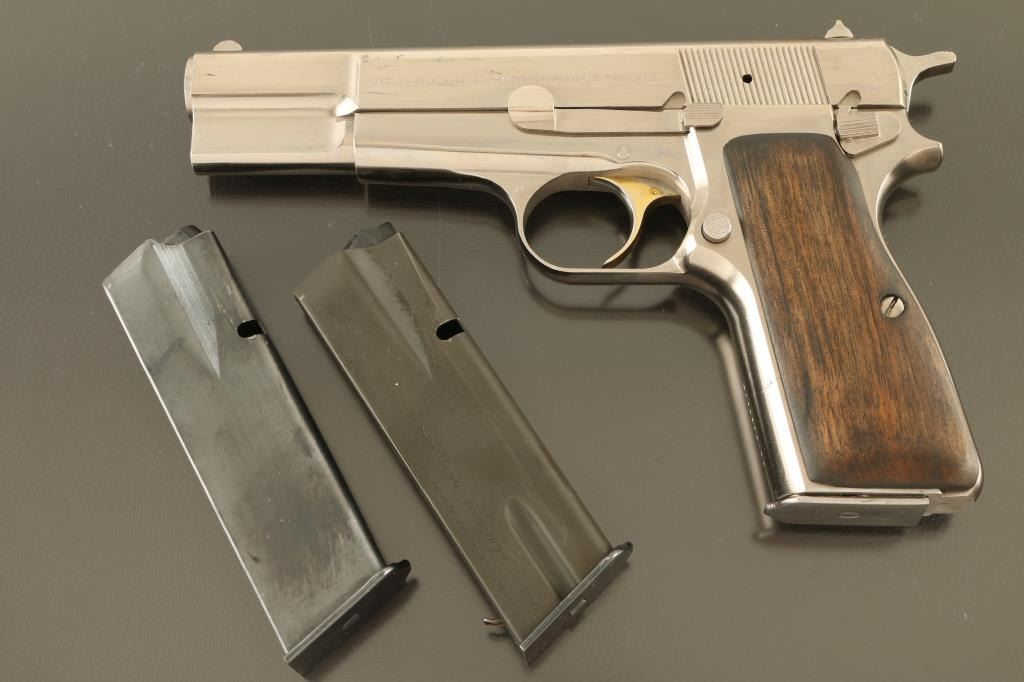 Belgian single action semi-automatic pistol manufactured circa 1981, imported by Browning Arms, Morgan UT. Features a polished nickel finish, 4 5/8" barrel, fixed blade front sight, square notch rear sight in dovetail, smooth gold color accent trigger, serrated hammer spur, frame mounted manual safety, magazine disconnect safety, push button magazine release, two-piece smooth walnut grips. Bore is very good condition. Nickel finish is very good condition, many small scratches with no visible flaking or peeling. Trigger retains majority of gold color, with rubbing wear. Grips are very good. Includes (3) magazines. Condition is NRA Very Good++ *** Modern Firearm ***
