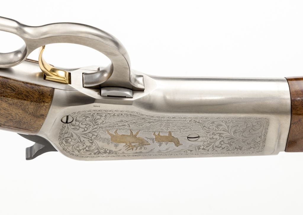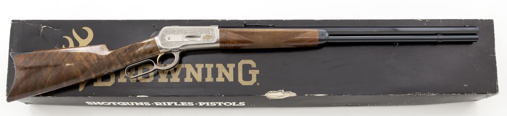 Browning Model 1886 Limited Edition High Grade Lever Action Rifle, #02802PT697, .45-70 cal., 26'' octagon barrel with high polish blue finish, engraved coin-finished frame and lever, gold-plated trigger and animal scenes to receiver flat, with fancy checkered straight grip walnut stock. Top of barrel is marked ''1 OF 3000''. Engraving is signed ''T. Naka''. In original box with matching end label and owner's manual. Condition is excellent. Metal surfaces appear as new with all of the original factory finishes. Forend with a few shallow pressure dents in front of the checkering and bottom edge of buttstock with a half dozen small impressions and scratches; checkering is clean and unmarred. Action is smooth and crisp with an excellent bright bore. Box shows storage wear. Est.: $1,400-$1,800. (Modern)