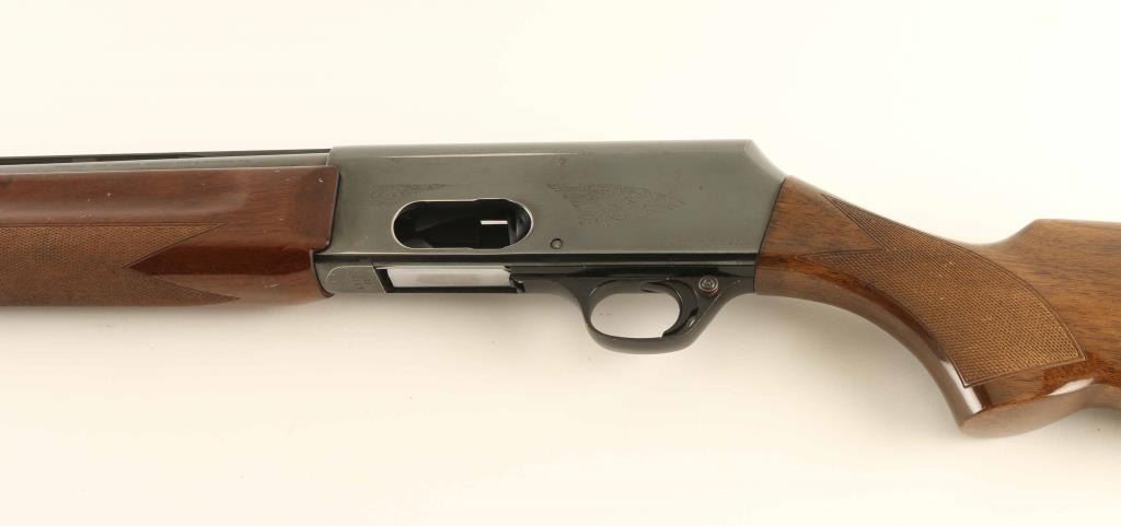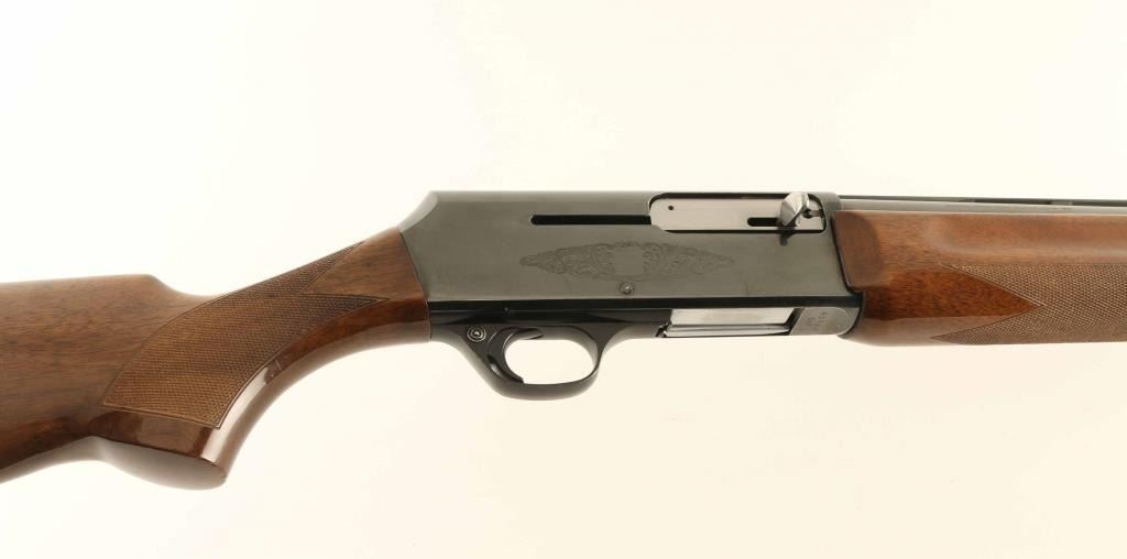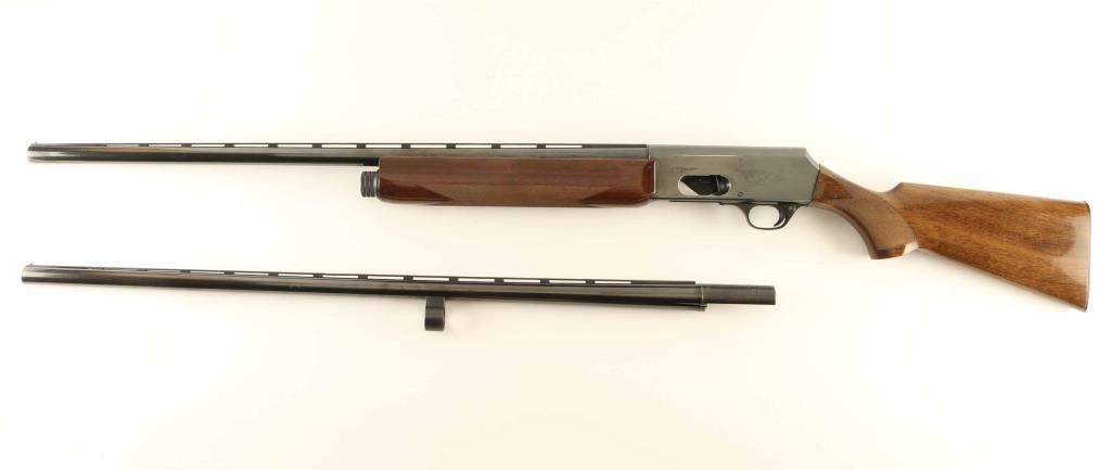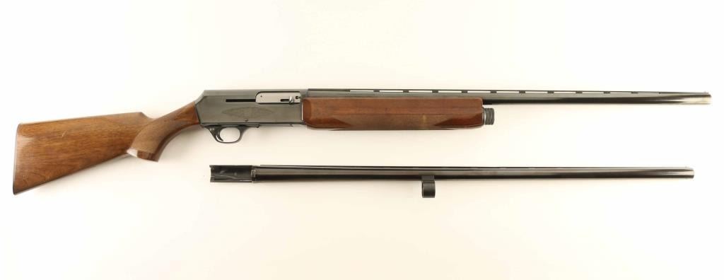 Belgian semiautomatic shotgun imported by Browning Arms Co, Morgan UT. Takes 2-3/4" shells. Features blued finish, limited areas of scroll engraving on receiver, urethane finish on wood, checkered forend, checkered wrist at pistol grip, plastic butt plate, 28" vent rib barrel (fixed choke measures MOD), steel front bead, manual safety. Included extra barrel is 30" vent rib, fixed FULL choke, steel front bead. Bores on both barrels are excellent. Retains 85% blue, thinning a bit on receiver, with small scratches, handling wear to sharp edges and near loading port. Spare barrel retains 80% blue with several small areas of cleaned patina or light pitting. Wood is very good overall with scratches and small dents at butt. 14-1/4" Length of Pull, 1-1/2" Drop at Comb, 2-1/8" Drop at Heel. Condition is NRA Very Good *** Modern Firearm ***