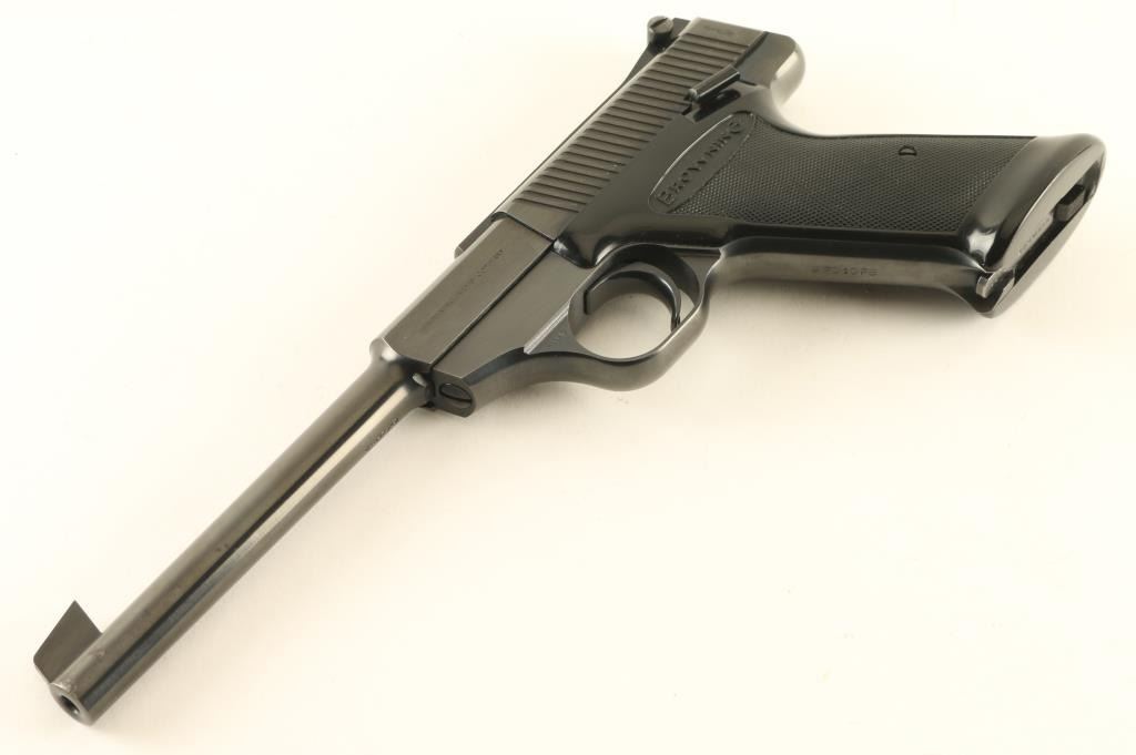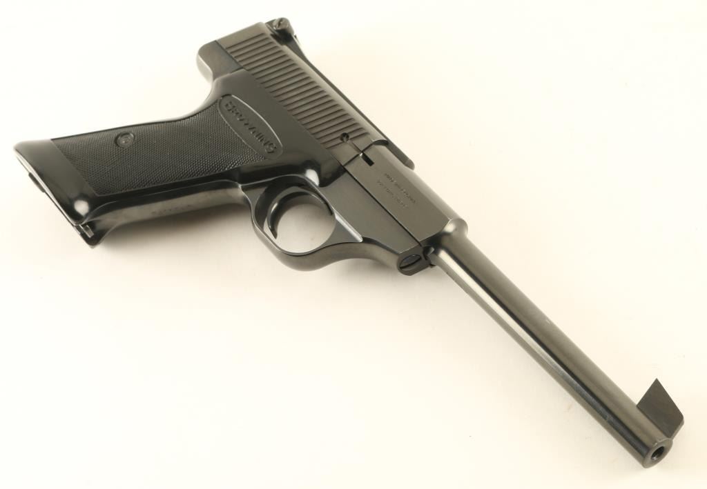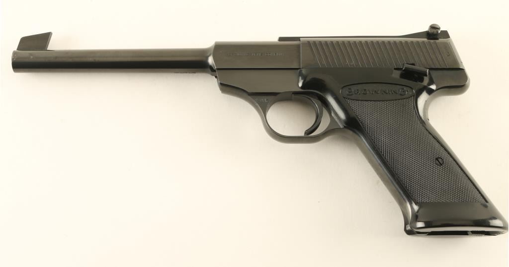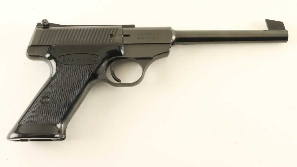 Belgian semiautomatic rimfire pistol manufactured circa 1968, imported by Browning Arms Co. Features blued finish, checkered black plastic "BROWNING" logo grips, 6.75" barrel, adjustable sights, heel magazine release, manual safety. Bore is excellent. Retains 85% dark bluing with small area of pitting of left side of barrel, scuff mark on top of barrel, other signs of handling. Grips are very good or better. Includes (1) magazine. Condition is NRA Very Good ++ *** C&R Firearm ***