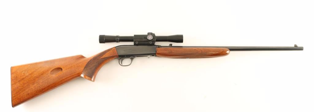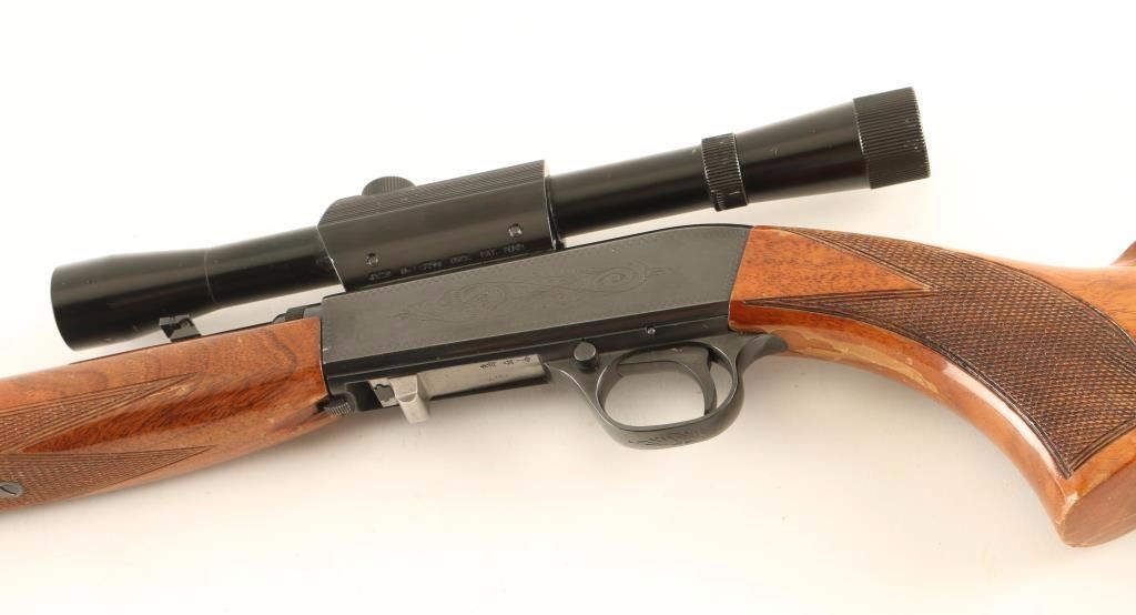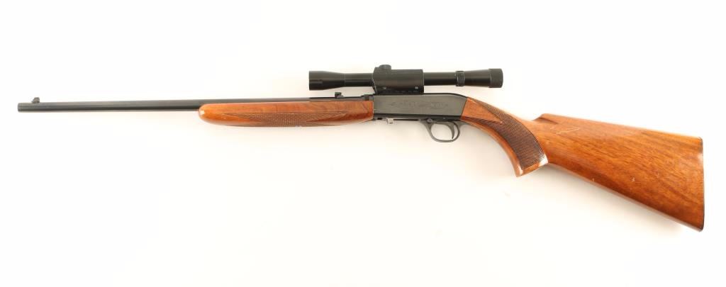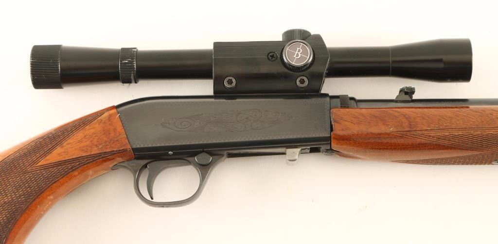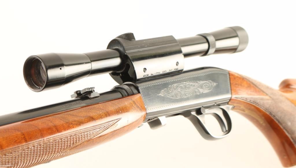 'Grade I" Vintage Belgium made tube fed semi-automatic sporting rifle chambered in .22 Long Rifle, circa 1961. Features a blued finish, 19.25" take-down barrel, dovetailed blade front sight with brass bead, adjustable flip-up rear sight, Bushnell Scopechief 4x scope, light coverage floral scroll engraved steel receiver, 11 round tubular magazine, push button safety, smooth trigger, checkered walnut forend and pistol grip shoulder stock with serrated metal buttplate. Rifle retains approximately 94% of it's original blued finish showing light muzzle wear, few scattered handling marks and finish loss along the scope rail cuts on the receiver. Action is smooth, bore is excellent, markings are crisp, and wood stocks are good with a 1" crack at the bottom of the wrist, small loss on the right side of the forend, flaking varnish & moderate blemishes. Condition is good to very good. ***C&R Firearm*** ***Modern Firearm***
