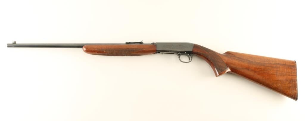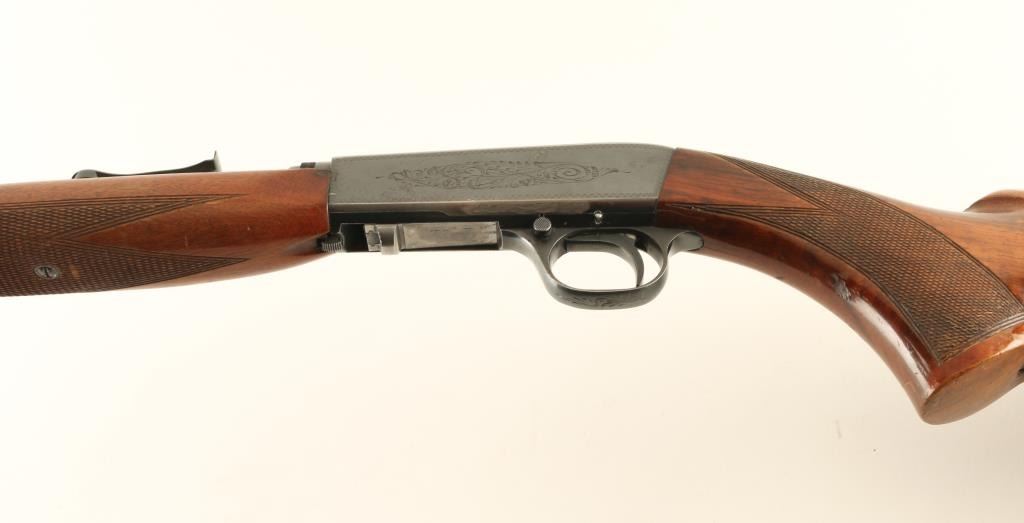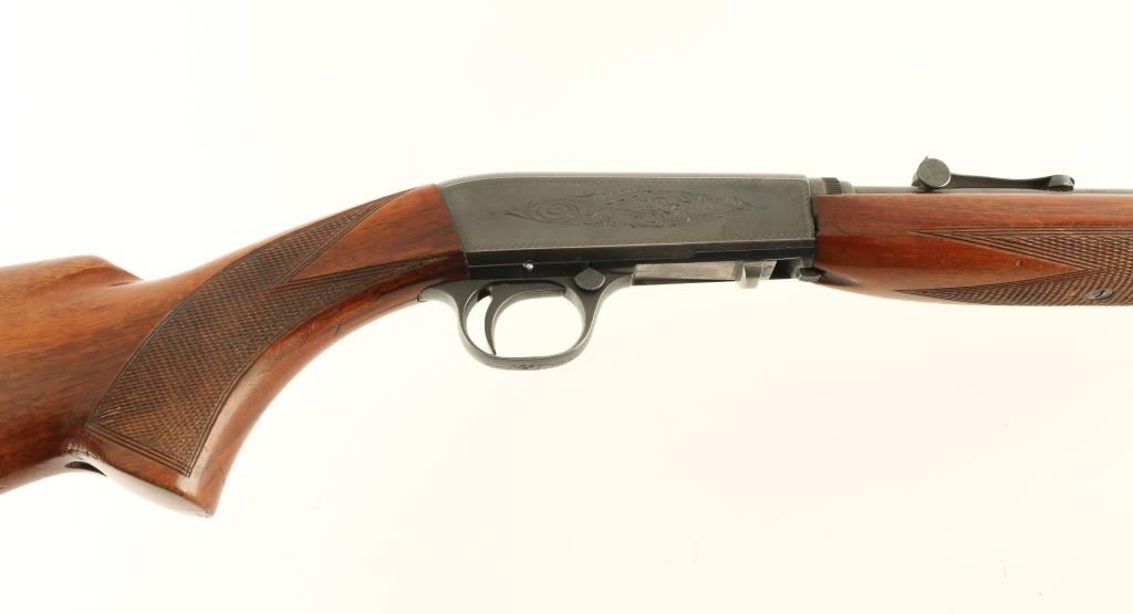 Rifle. Semi-Automatic. Takedown. Belgium made, and imported by Browning. 1914-Present. 19.25" round barrel with adjustable notch sights. Fed from a 11 rd. tube magazine located in the stock. 37" overall. Checkered pistol grip stock, and forearm. Top of receiver grooved for scope mount. Push safety on triggerguard. Downward ejection. Wood is in good shape with some minor sctraches/dings. Blued finish is about 90% with wear to the edges. Loss to the lower left receiver. Someone has electropenciled a SSN on the steel butt plate. Bore appears good, but dirty. NRA Condition-Very Good. Modern Firearm.