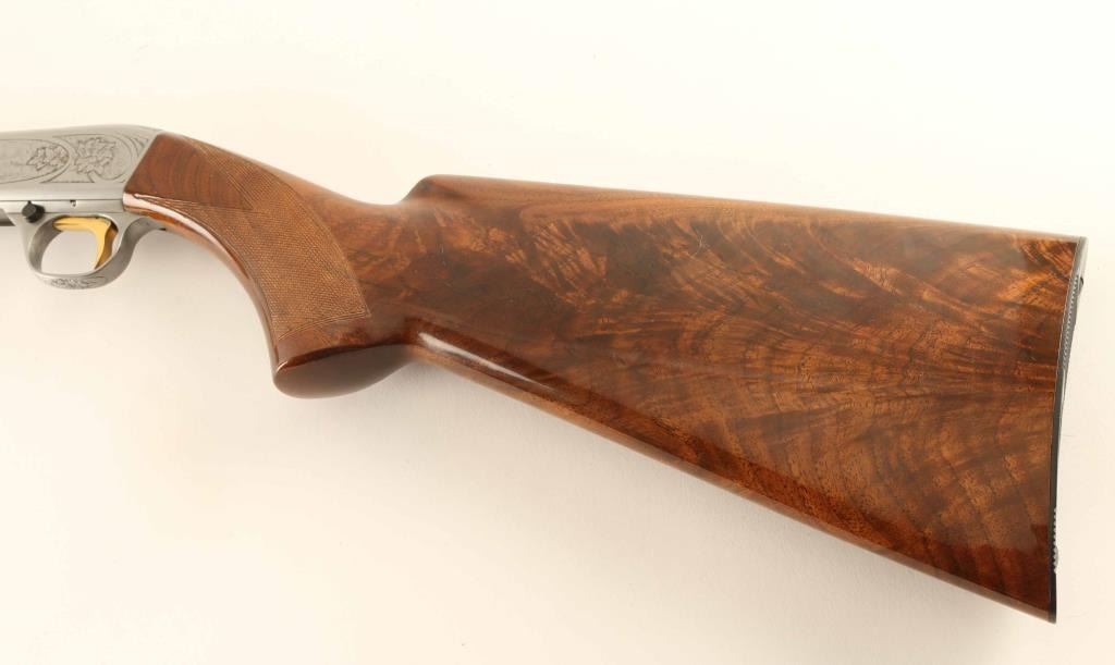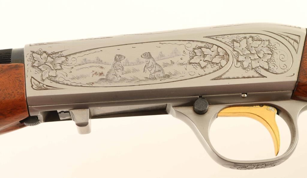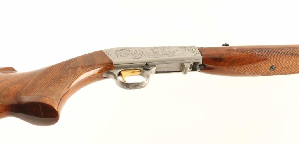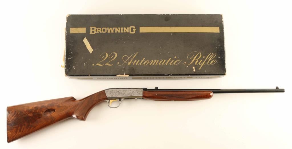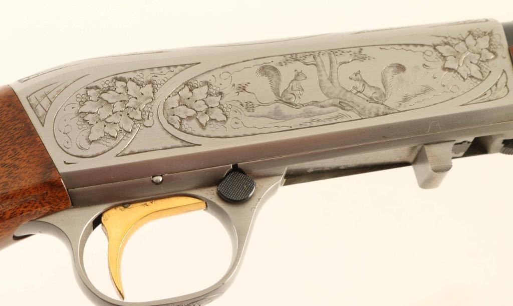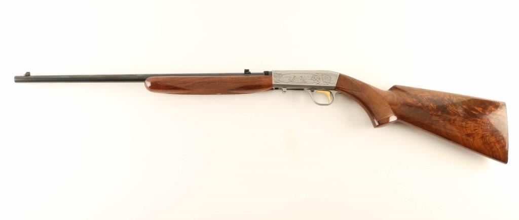 Belgian semiautomatic rimfire rifle imported by Browning Arms Co, St Louis MO. Manufactured circa 1968. Features engraved French Gray receiver & triggerguard, gold color accent trigger, blued finish barrel & sights, high grade fancy figured walnut, checkered forend, curved grip stock with checkered wrist, flat blued steel buttplate, 19" barrel, blade front sight, folding rear adjustable sight, tube magazine in butt, manual safety. Bore is excellent. Overall condition is like new with few signs of handling. Engraving consists of game scenes on receiver,with oval borders and surrounded by grape leaves. Left side features prairie dogs or chipmunks, top has a mallard duck in flight, right side shows squirrels on a tree branch. Includes factory cardboard box. Condition is NRA Excellent *** C&R Firearm ***