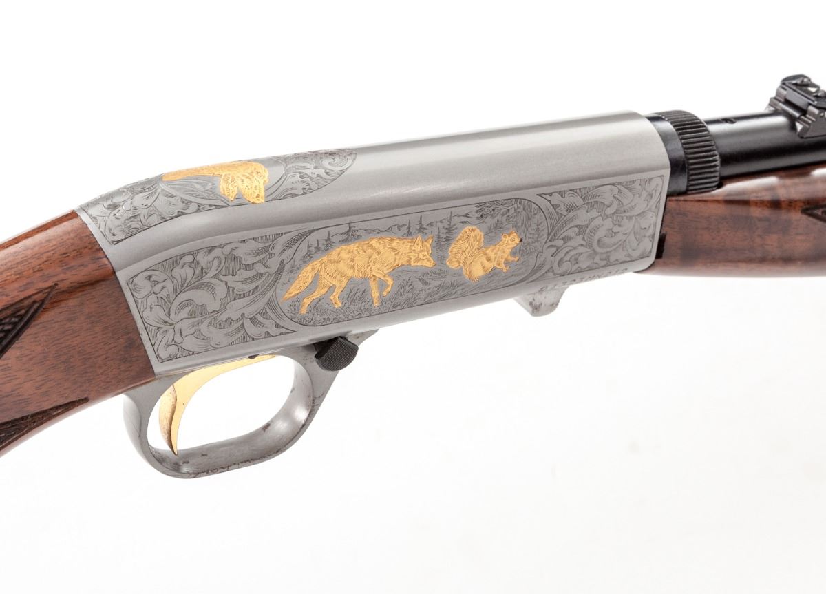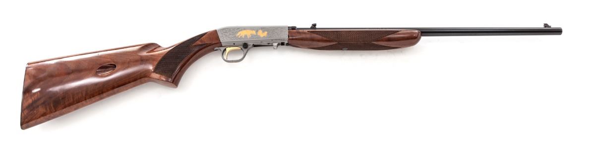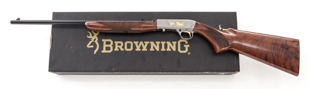 Browning SA-22 Grade VI Semi-Automatic Rifle, #01323MN212, .22 LR cal., 19-1/4'' blue finish barrel with folding leaf rear sight and gold front bead, drilled and tapped for scope mount; receiver has a satin-grey finish with floral scroll engraving bordering gold-applied game scenes and a gold-plated trigger with triggerguard mounted push-button safety; checkered pistol-grip stock and forend are dark figured walnut with a high-gloss finish. Mfg'd ca. 2009. Original box and safety lock are included. Condition is good as affected by damp storage. Receiver has scattered brown oxidation and crazing from below the finish; bolt has corrosion and pitting. Barrel has light oxidation. Wood has a few handling marks. Est.: $750-$1,000. (Modern)