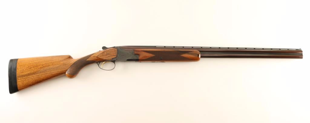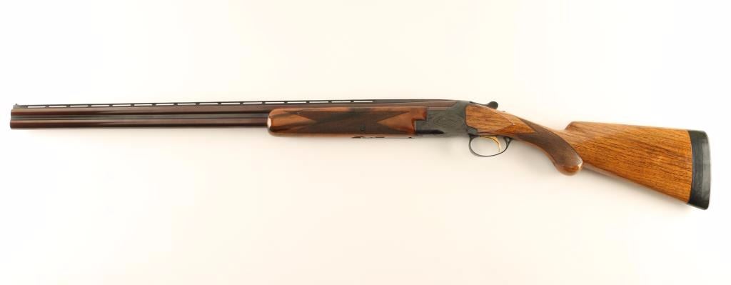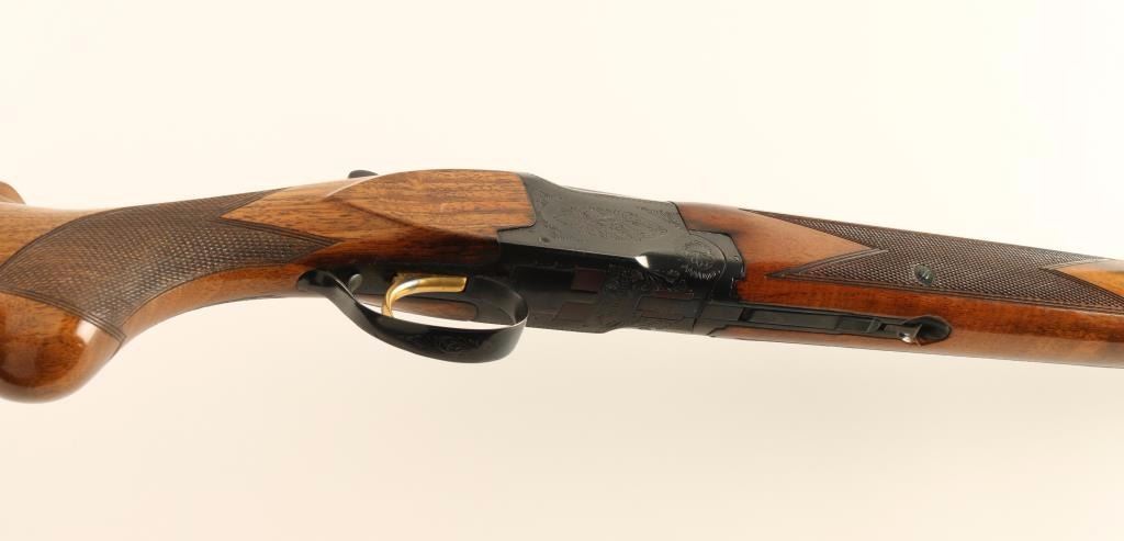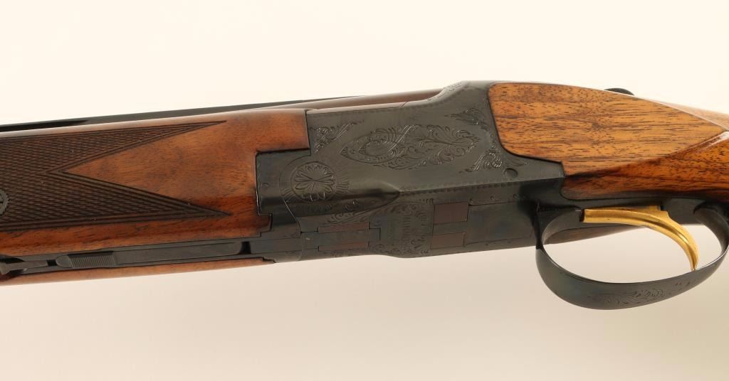 SN: 50533V8 'Grade 1' Engraved Belgium made under/over double barrel shotgun chambered for 2 3/4" or 3" 20 gauge shells, circa 1968. Features a reblued finish, 28" barrels with a ventilated sighting rib & modified/improved cylinder chokes, automatic ejectors, white bead sights, light coverage floral scroll engraved receiver, smooth single gold trigger, sliding tang safety/barrel selector, finely checkered walnut forend and pistol grip shoulder stock with round knob, extensions, Old English recoil pad & 14 1/8" LOP. Shotgun exhibits approximately 95% of it's blued refinish with the barrels turned plum and the receiver showing some old light pin prick pitting along the edges the meet the buttstock. Action is smooth, bores are excellent and wood stocks are good showing bearing an old refinish. Condition is very good as refinished. ***C&R Firearm*** ***Modern Firearm***