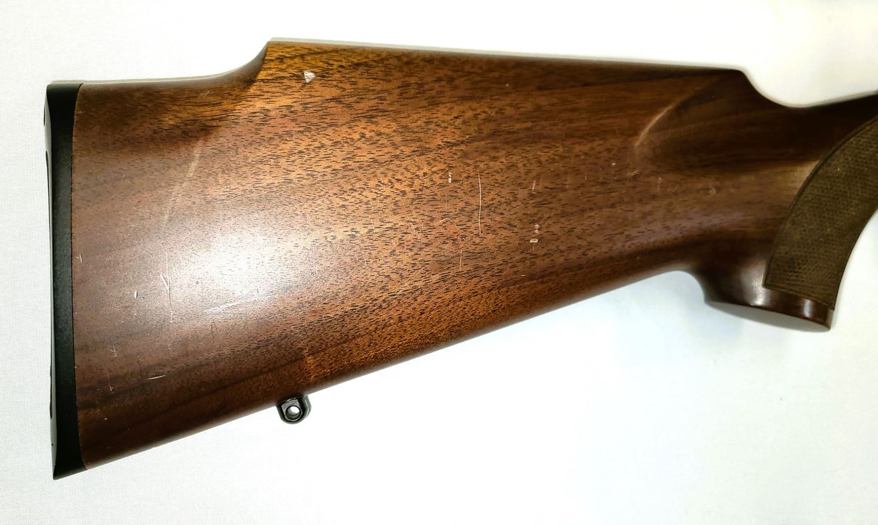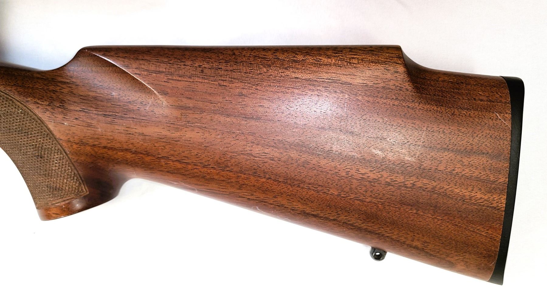 Target-style walnut stock with satin finish, raised comb and wide fore-end.