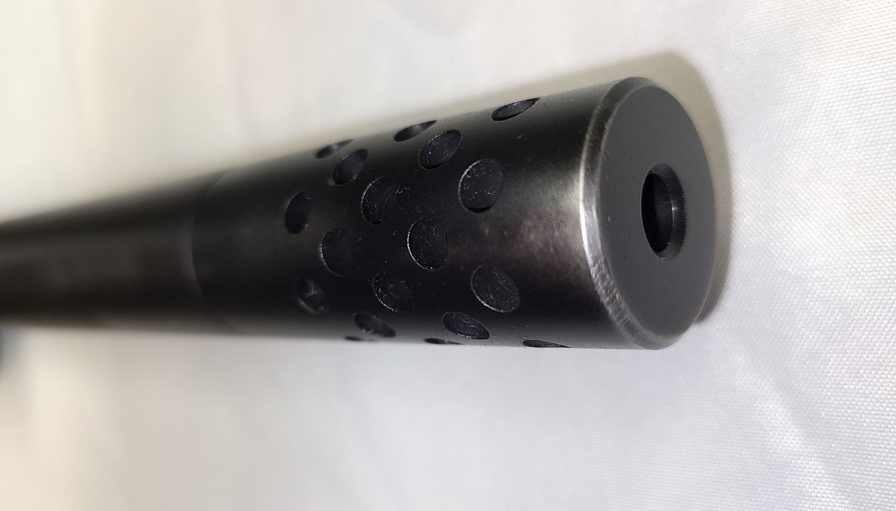 Heavy bull barrel with muzzle break is 18.5 inches long.