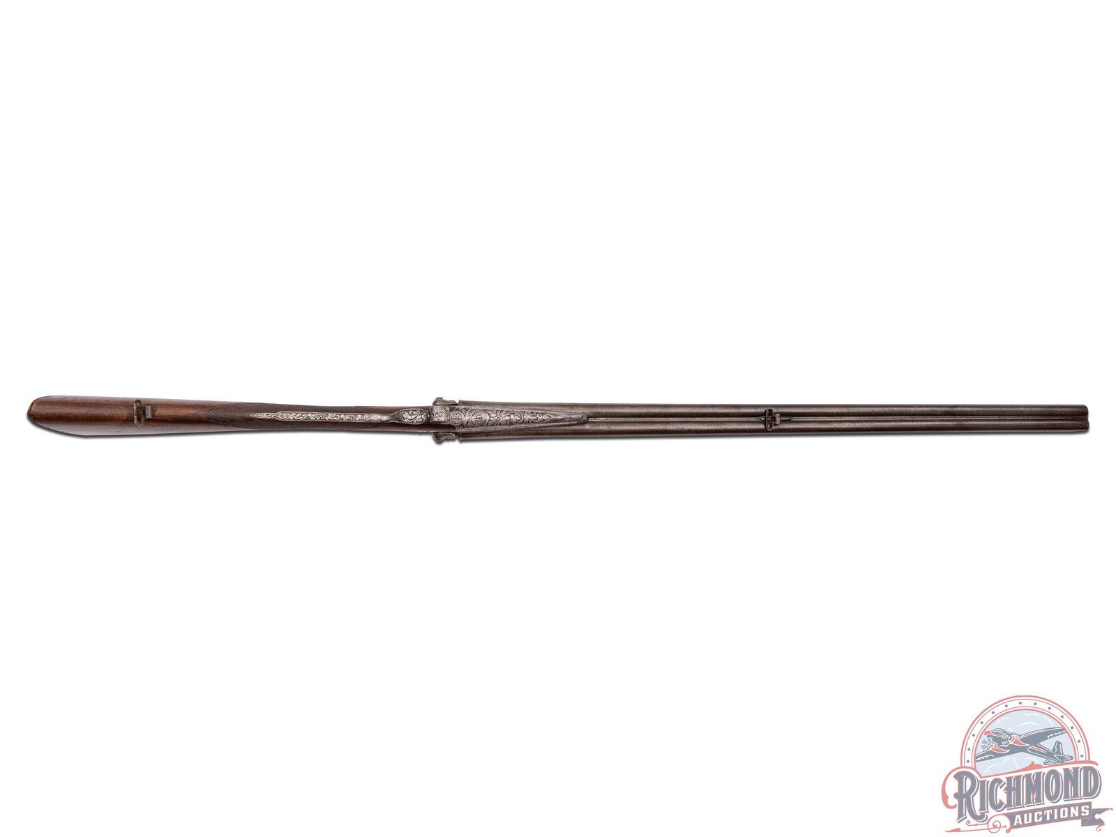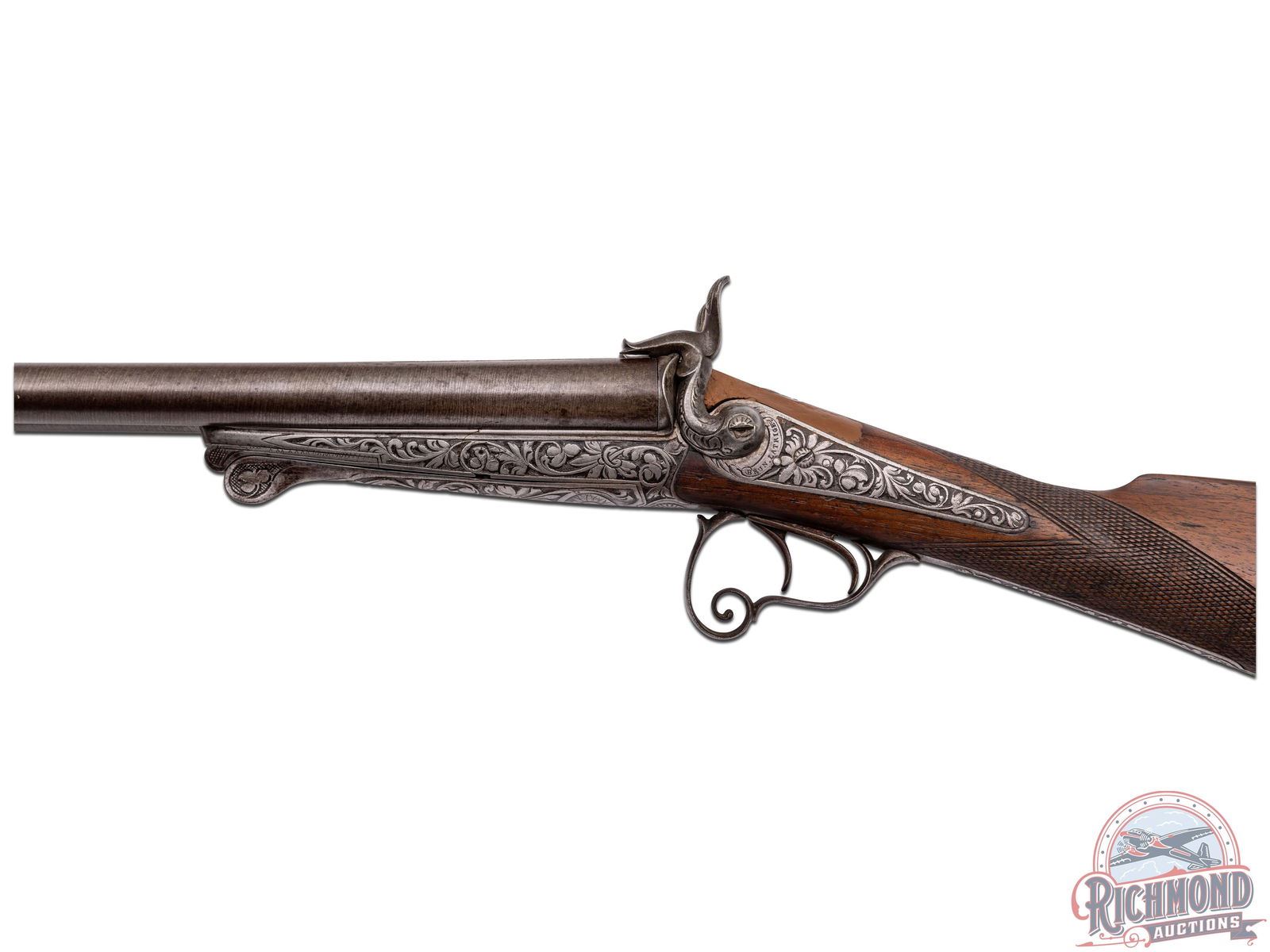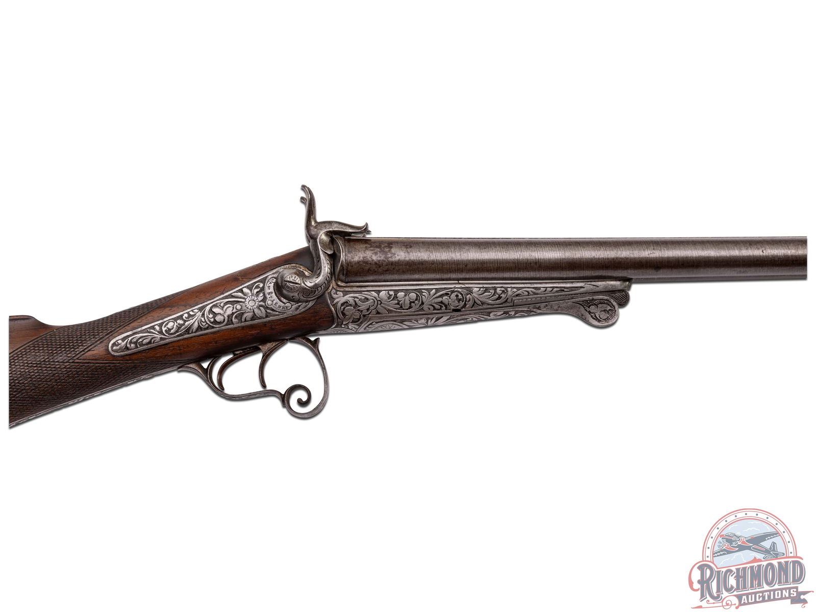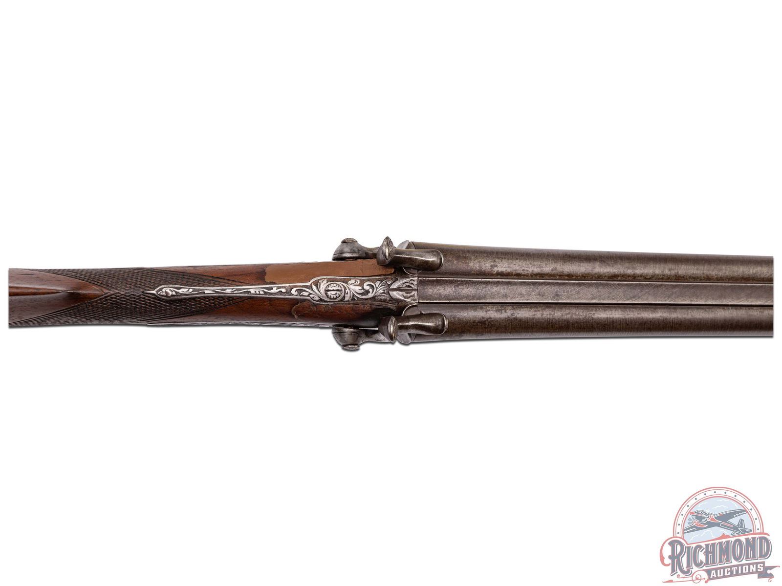 Made in St. Entienne, France by Brun Latrique, circa 1880. 29-1/2" Twist steel barrels with smooth concave rib, bead front sight, and extractors. Floral engraved underlever pinfire action with double triggers, back action external hammer locks, and shaped steel engraved trigger guard. Walnut English grip checkered stock with steel butt plate, sling swivels, and steel floral engraved opening lever. CALIBER: 24. FFL STATUS: Antique.