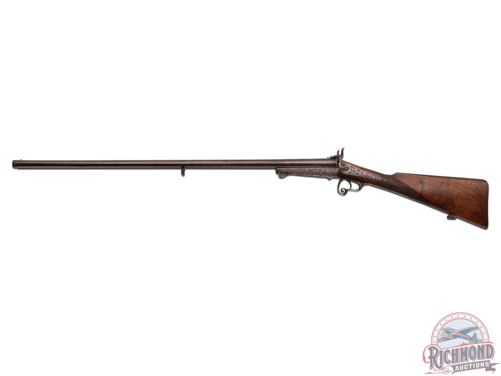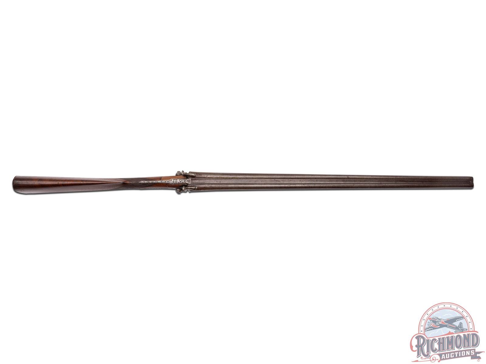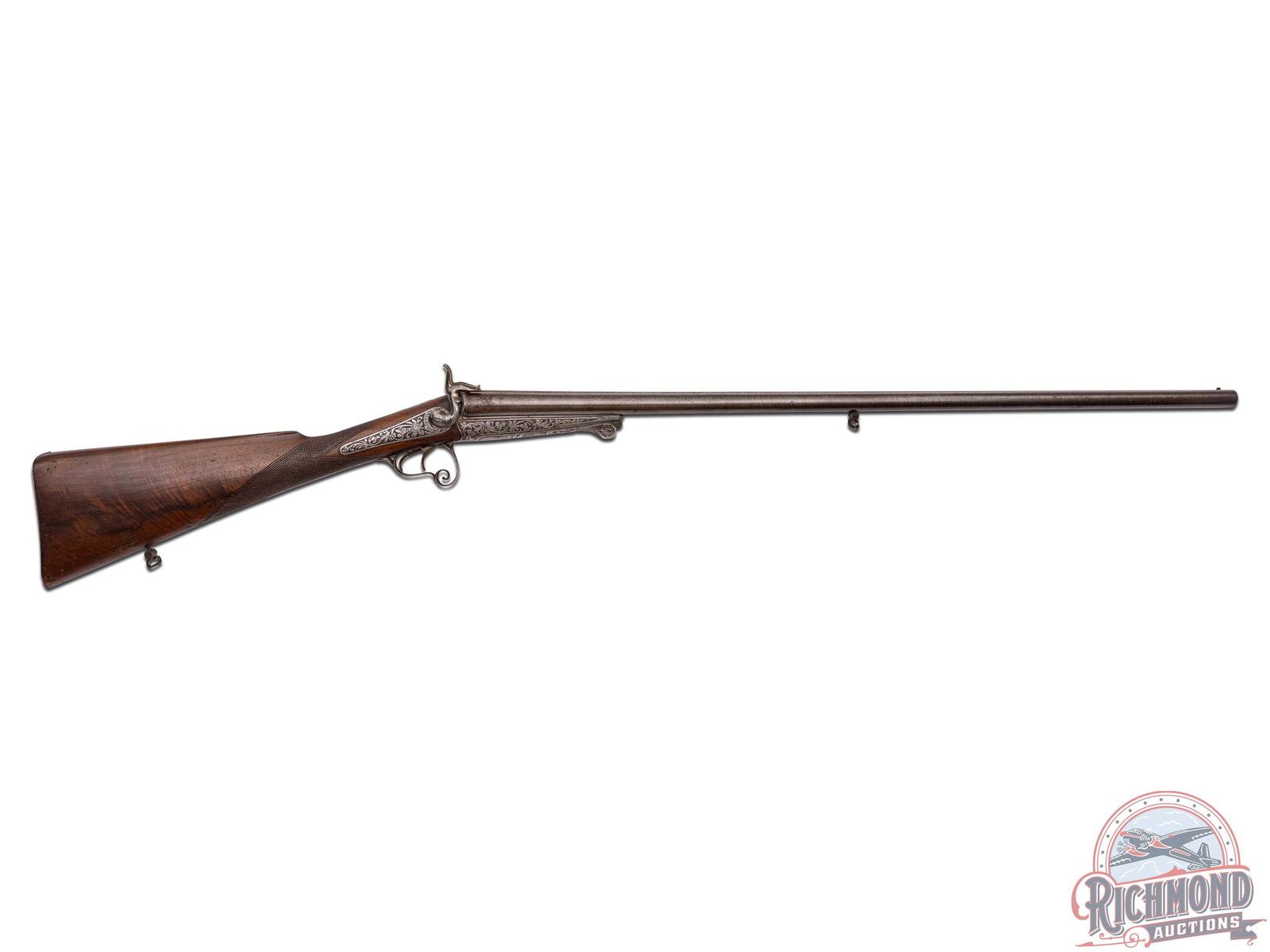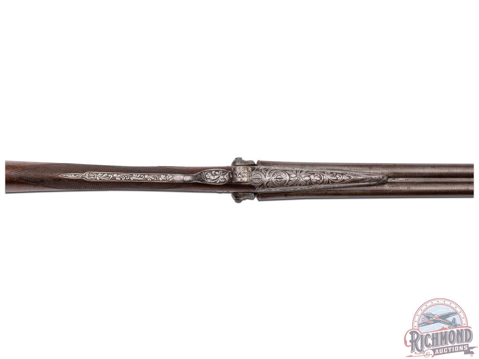 Made in St. Entienne, France by Brun Latrique, circa 1880. 29-1/2" Twist steel barrels with smooth concave rib, bead front sight, and extractors. Floral engraved underlever pinfire action with double triggers, back action external hammer locks, and shaped steel engraved trigger guard. Walnut English grip checkered stock with steel butt plate, sling swivels, and steel floral engraved opening lever. CALIBER: 24. FFL STATUS: Antique.