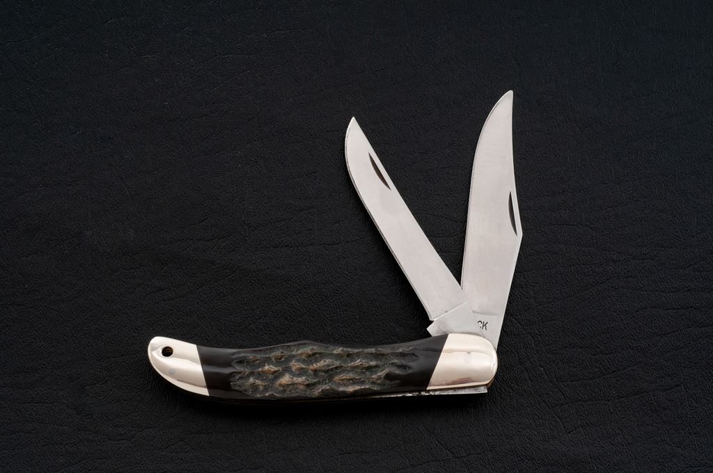 Buck 317 Trailblazer with Jigged Water Buffalo Handles, nickel silver bolsters, 4'' blades, one with three-line stamp (no date symbol), 5-1/4'' overall closed length. Condition is excellent, blades appear unused, bolsters with minor handling marks. Est.: $200-$300.
