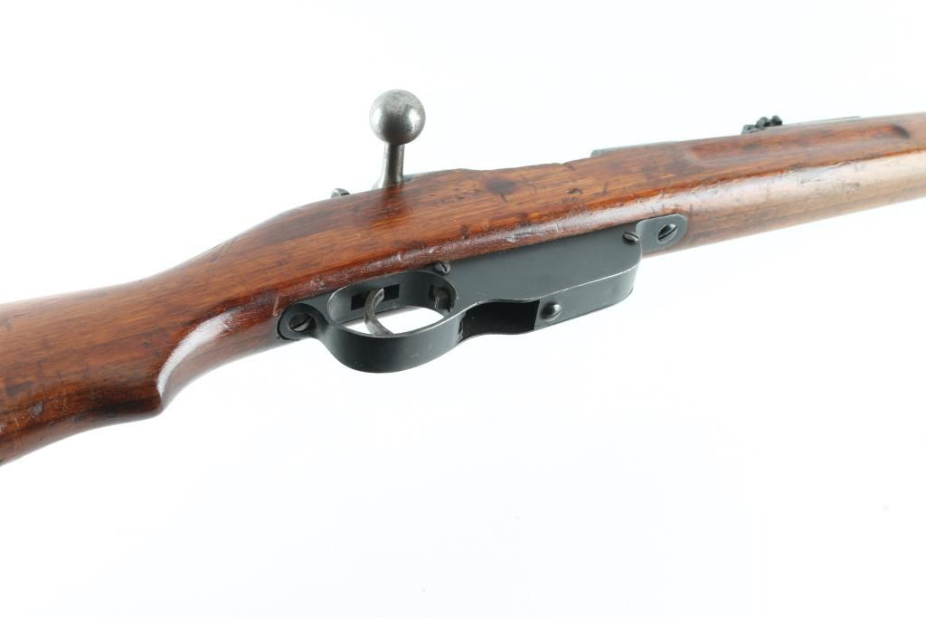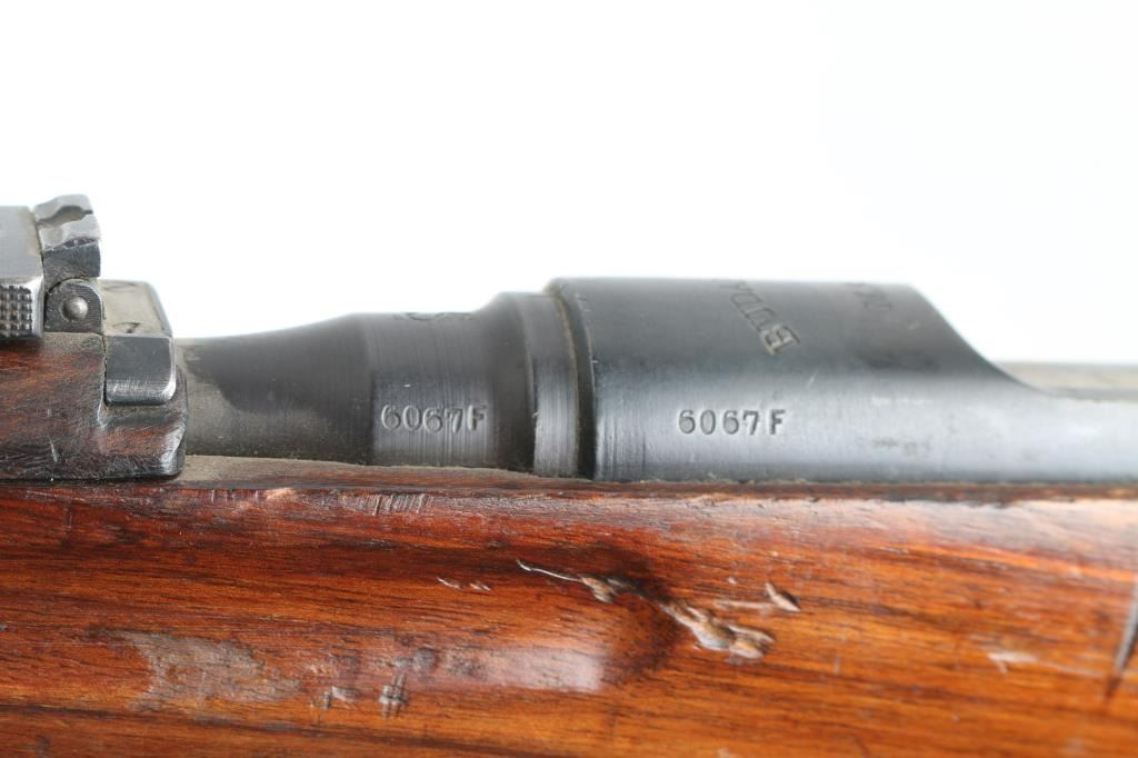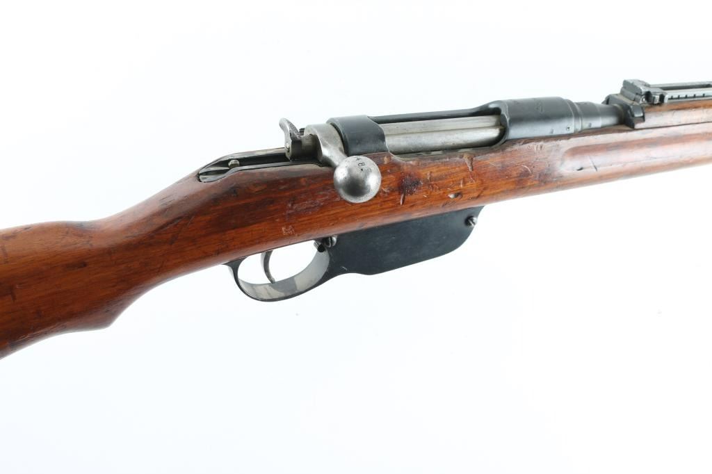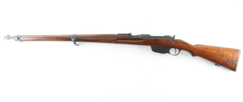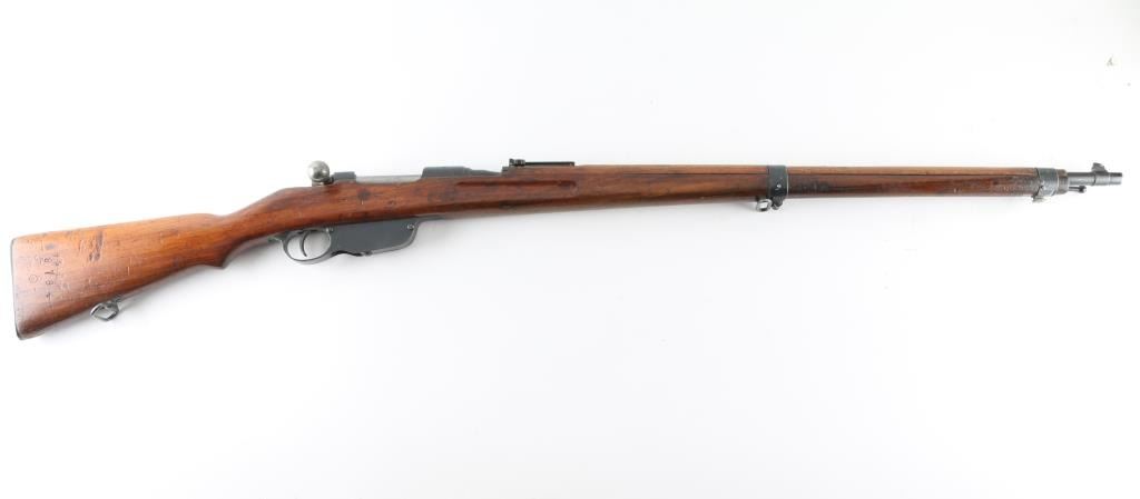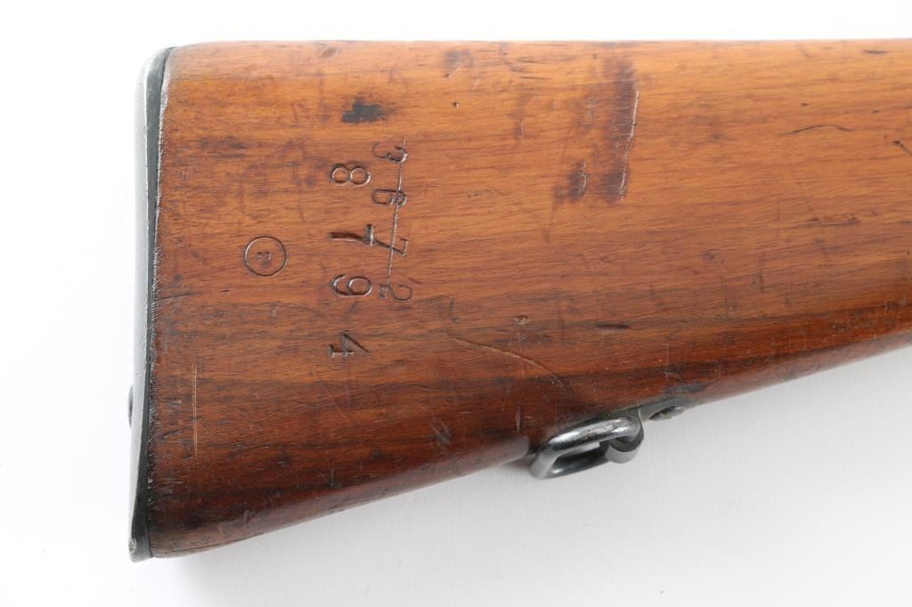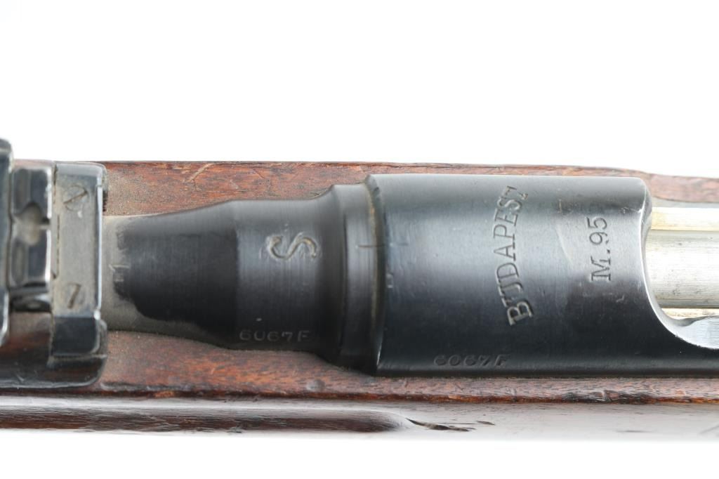 Austro-Hungarian straight pull military bolt action rifle. No import marks observed. Used in WWI, many were shortened before and during WWII, making this long rifle with 30" barrel less common. Features blued finish, bare metal bolt assembly, smooth wood stock and handguard, stacking hook, bayonet lug, blade front sight, folding ladder rear sight, manual safety, sling swivels, smooth steel buttplate. Barrel marked with large "S" for later style ammo with Spitzer bullets. Uses Mannlicher en-bloc clips, not provided. Barrel numbered to receiver. Bore is fair condition, dark and pitted throughout, with strong rifling. Retains 70% finish, with dulling and graying in may areas, handling marks, some light patina. Stock is mismatched, with two different numbers stamped into butt (neither match this rifle), fits well, good condition, many dents, has a light varnish finish, slight erosion visible on edges of finger grooves. Condition is NRA Good++ *** C&R Firearm ***