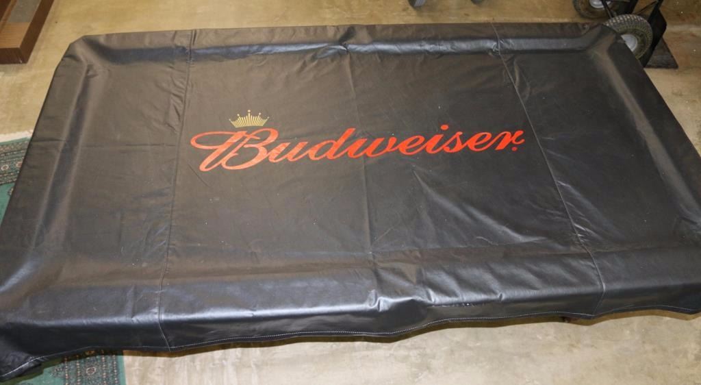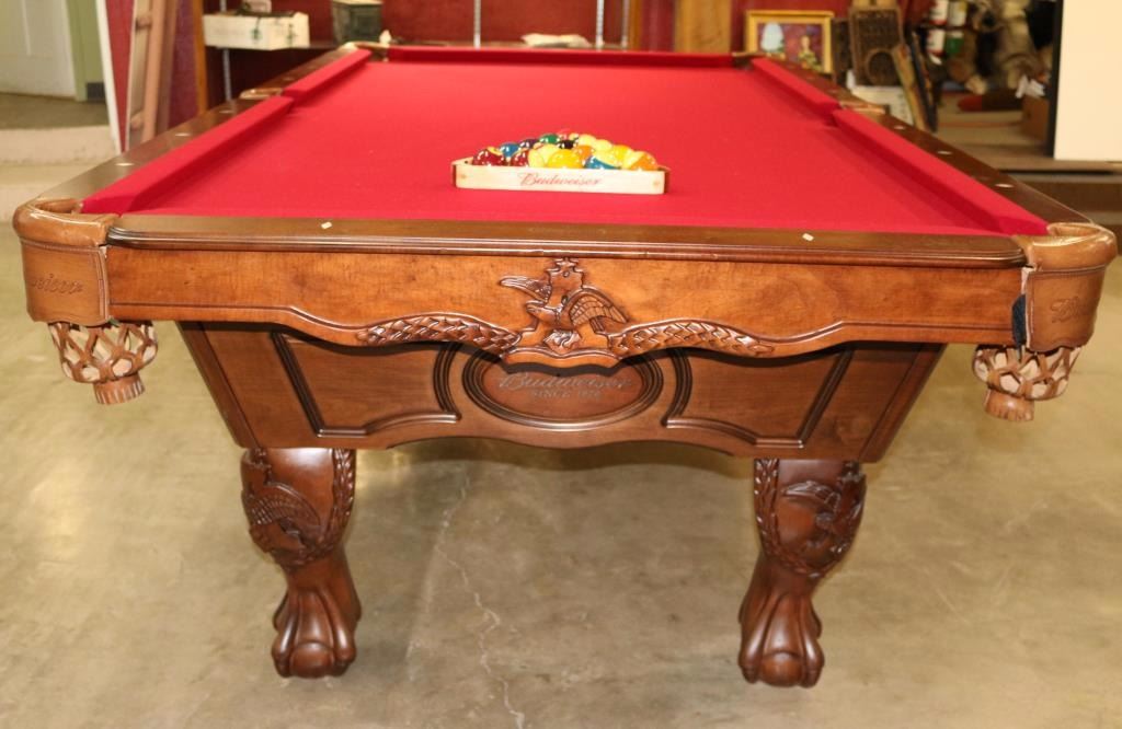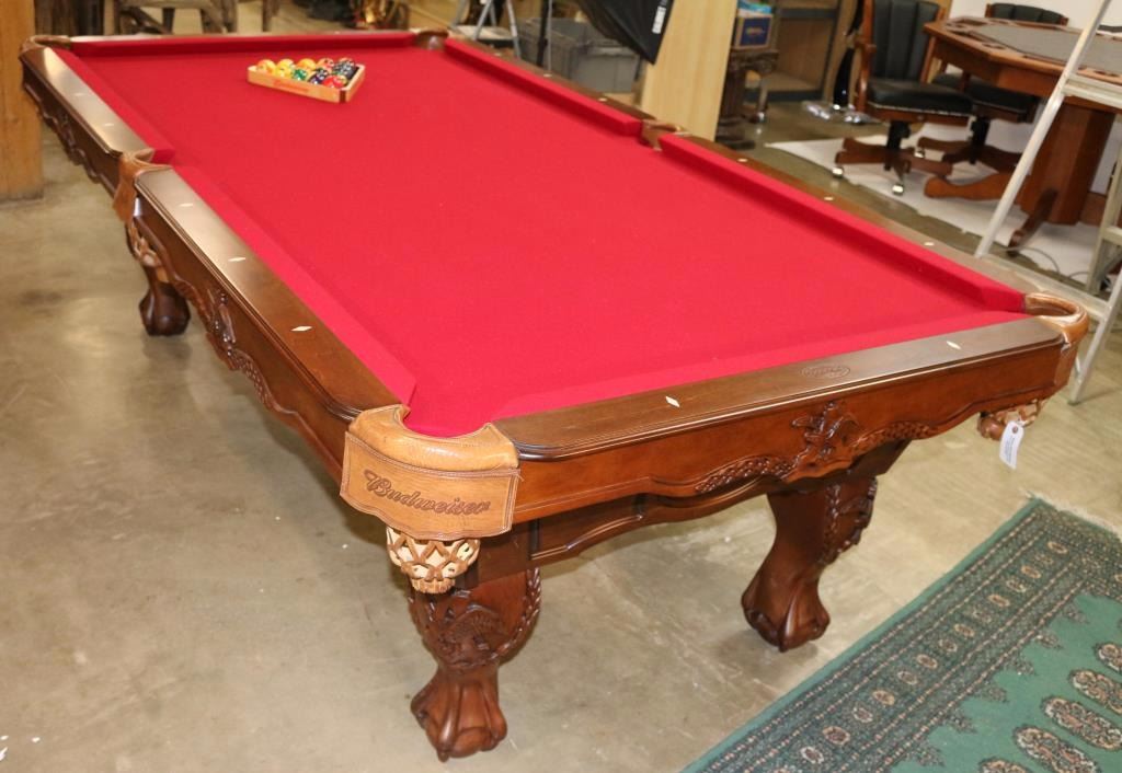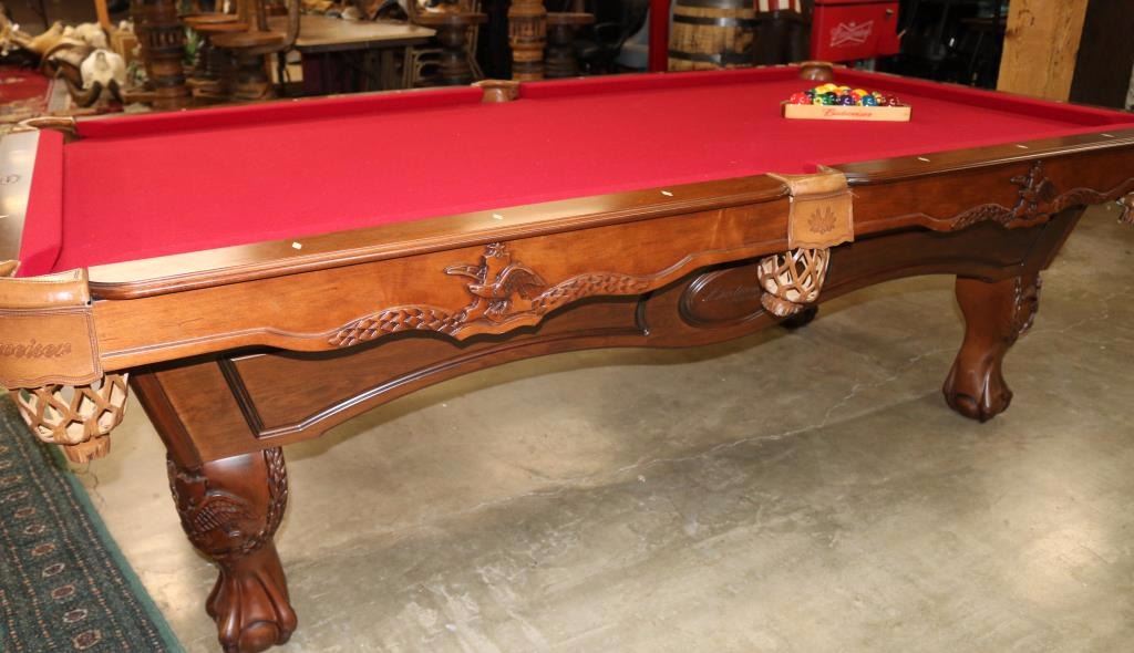 Carved legs with claw feet, eagle and letter 'A'. Pockets are brown leather with a stamped Budweiser design. Sides also have a Budweiser carving. Beautiful red felt playing surface with inlaid mother of pearl diamond side markers. Comes with a vinyl Budweiser cover. Shipping arrangements must be made by buyer due to weight and possible damage to table in shipping.