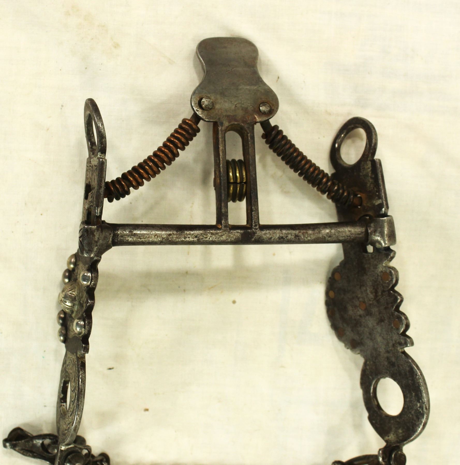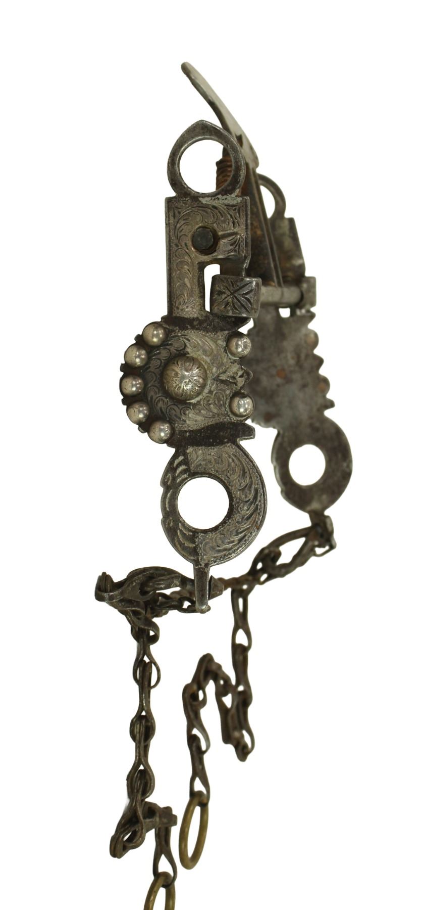 A showy early loose jaw kissing bird bit, with extensive engraved silver, spade mouthpiece and unique rein chains.