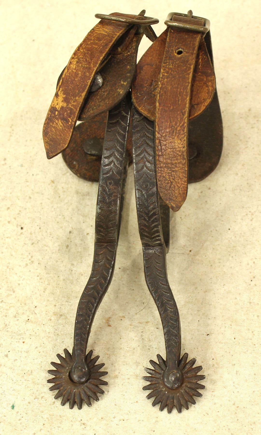 An early pair of single inlaid silver spurs with deeply engraved offsides, and nice maker's marks.