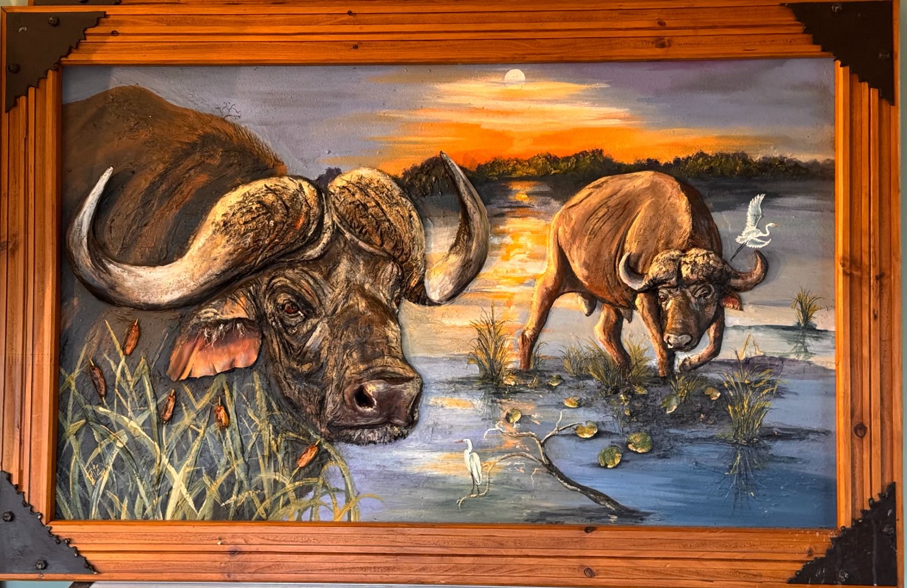 This stunning 3D Buffalo Sculpture Painting is a testament to exceptional craftsmanship, blending cutting, modeling, and artistry to create a unique masterpiece featuring Africa's most iconic cape buffalo.