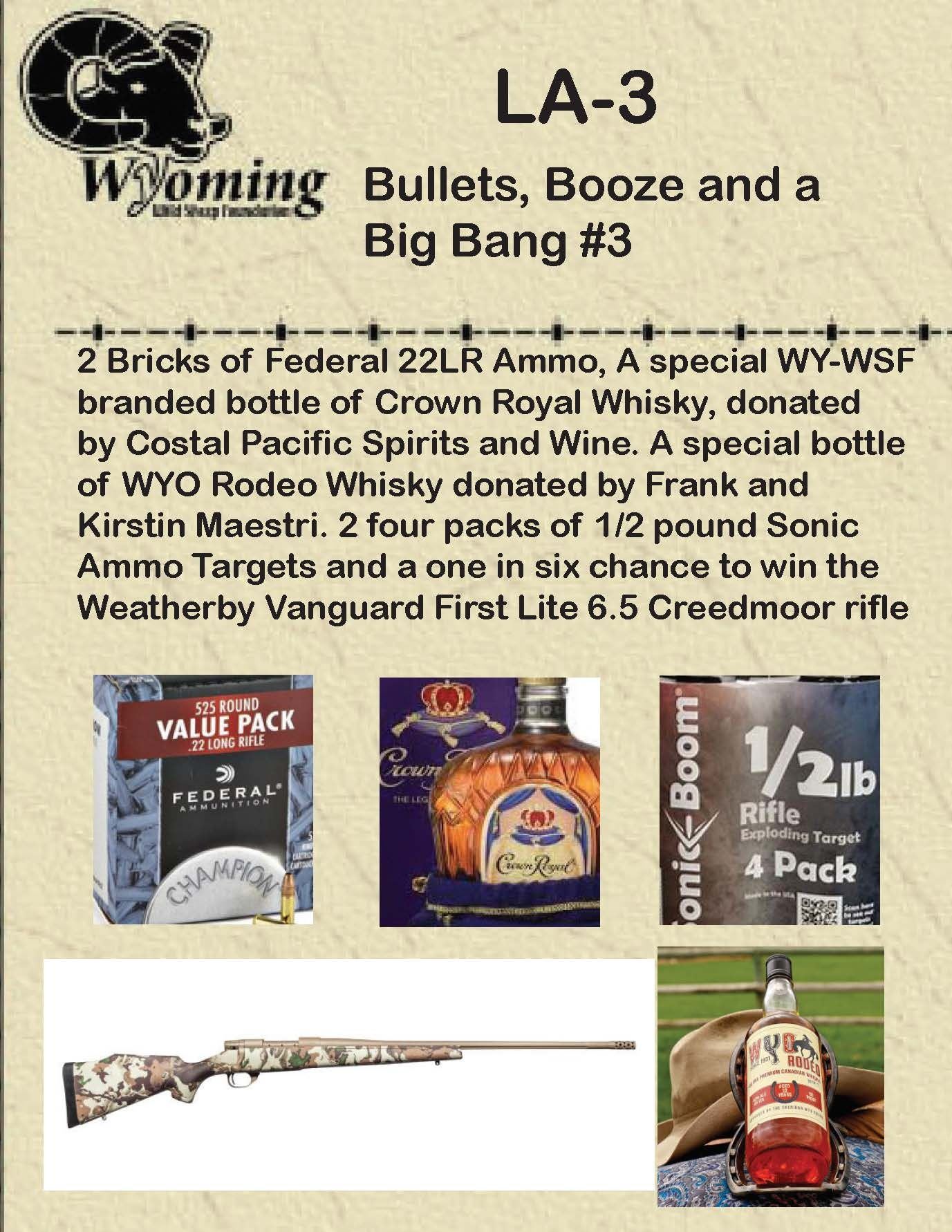2 Bricks of Federal 22LR Ammo, A special WY-WSF branded bottle of Crown Royal Whisky, donated by Costal Pacific Spirits and Wine. A special bottle of WYO Rodeo Whisky donated by Frank and Kirstin Maestri. 2 four packs of 1/2 pound Sonic Ammo Targets and a one in six chance to win the Weatherby Vanguard First Lite 6.5 Creedmoor rifle. Which is underwritten by Wyoming Outfitters and Guides Association.