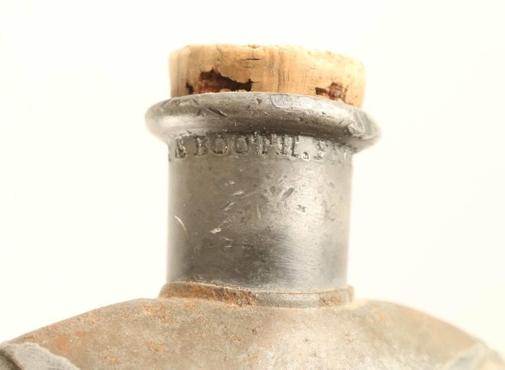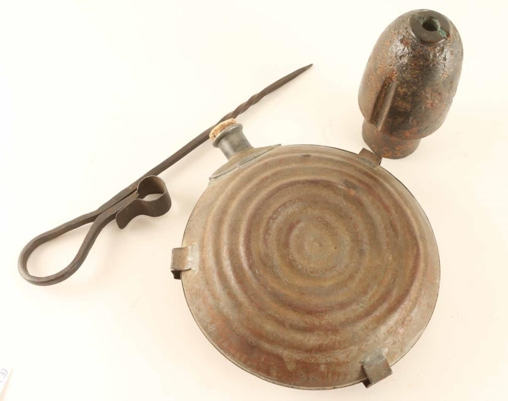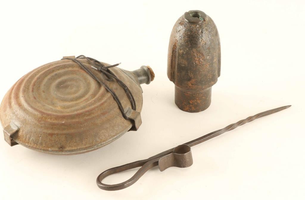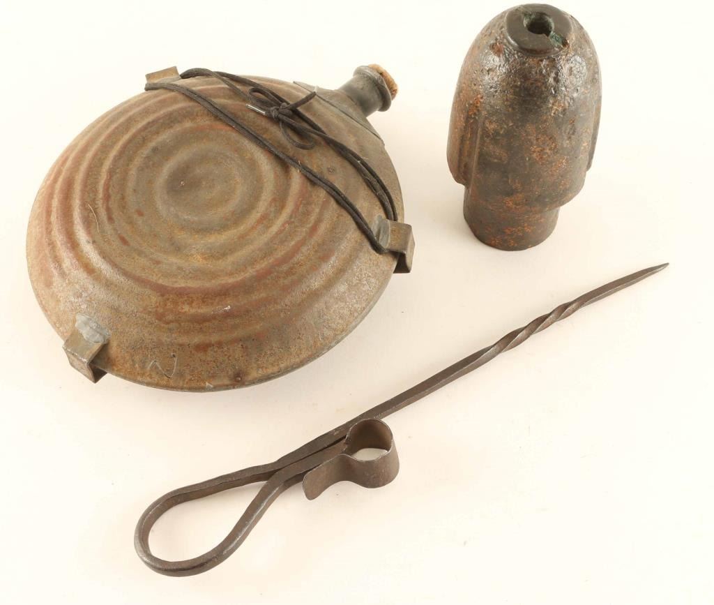 Includes Old Minors candlestick, Bullseye canteen maker marked on the lip, "HADDEN PORTER & BOOTH" , and inert artillery shell. All items show age and would make wonderful display or conversation pieces.
