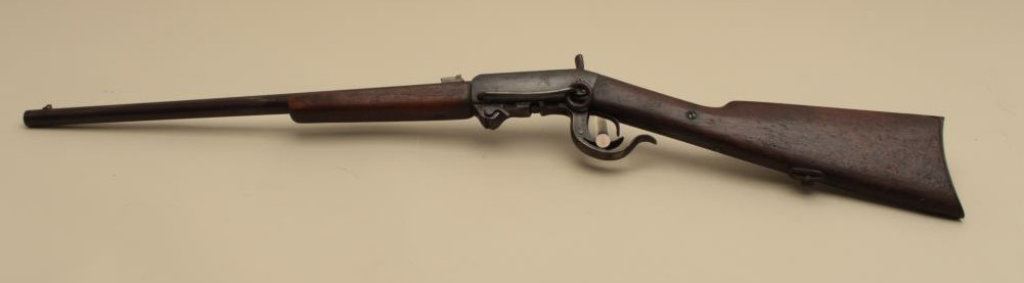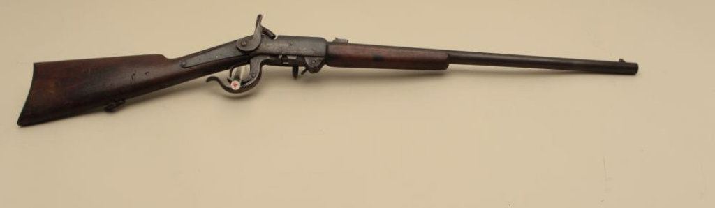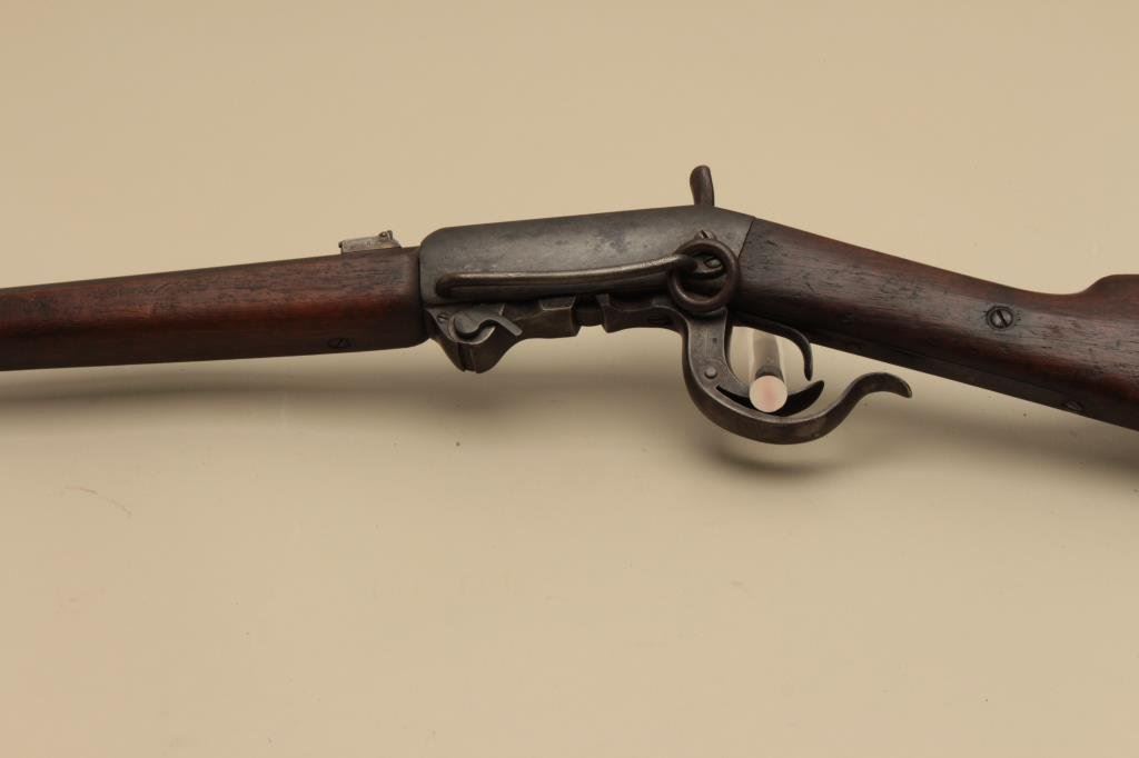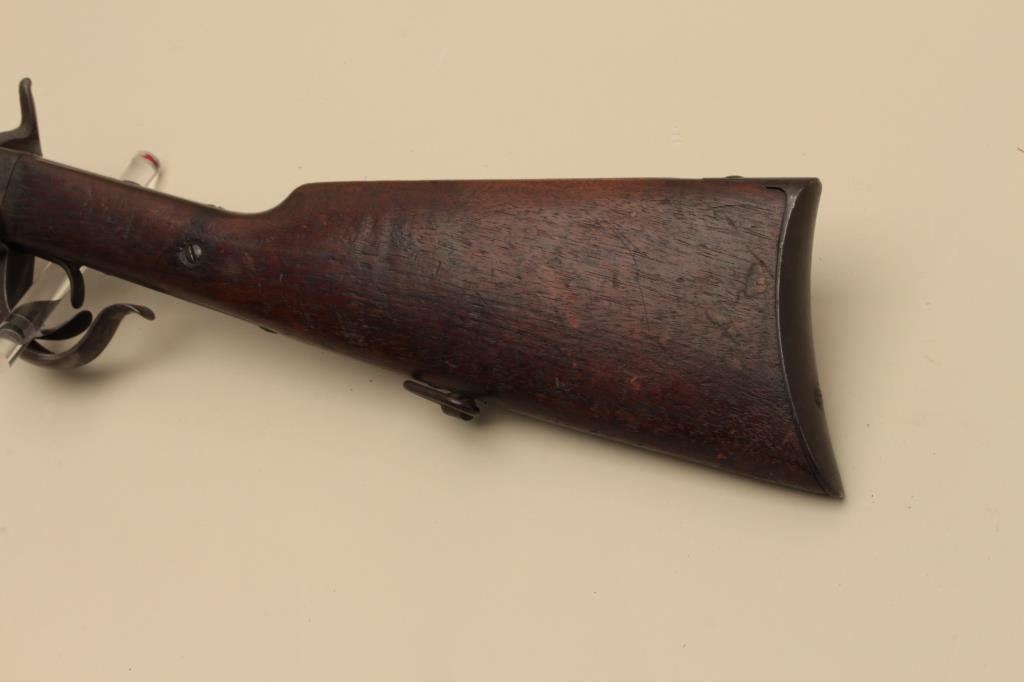 is in good overall condition with a 20” barrel. The barrel has gone entirely to plum patina with some light surface erosion. The receiver shows old, toned case hardening with the remainder gone to dark patina and a replaced hammer. The smooth wood stocks are in good condition showing wear and mars consistent with service use. The saddle ring is still present and the butt ends with a smooth steel butt plate. (Antique). Est.: $400-$800.