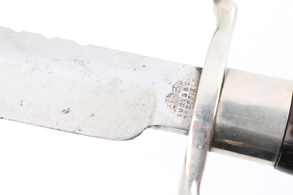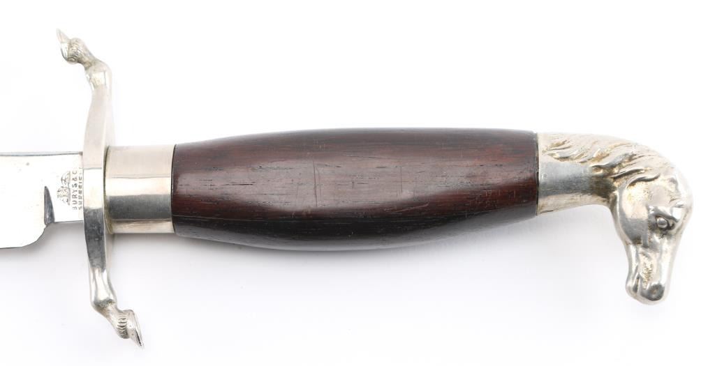 19th Century clip point Bowie knife. Features a 12 3/4" length and 1 1/4" wide blade with Roclinino Lion on pommel. German silver stamped horse head butt and horse hoofs on guard, rose wood handle grips. Brown leather embossed scabbard with German silver tip and fancy hanger w/ "Jenny Lind" style face. Very good condition with some needle point pitting. From the Joe Musso Collection.