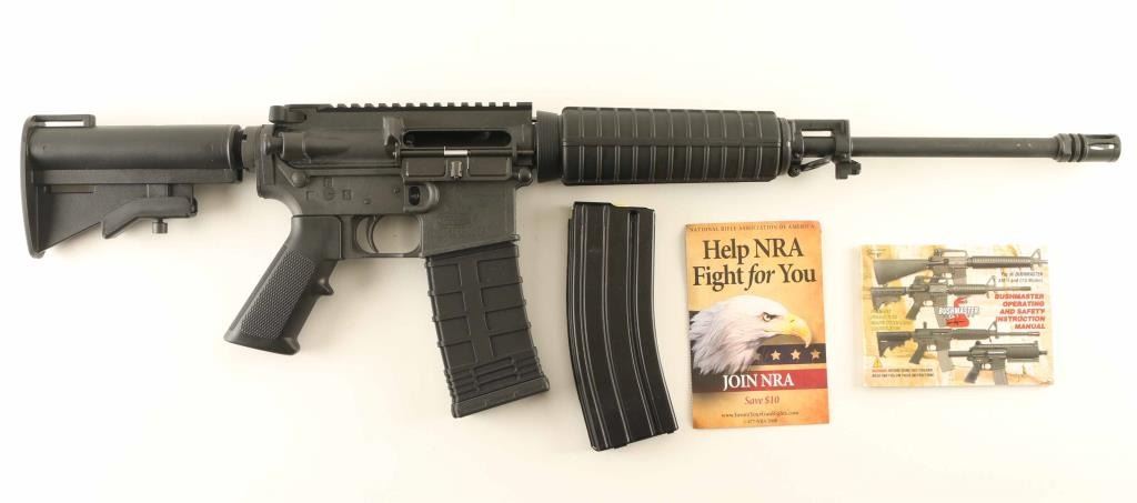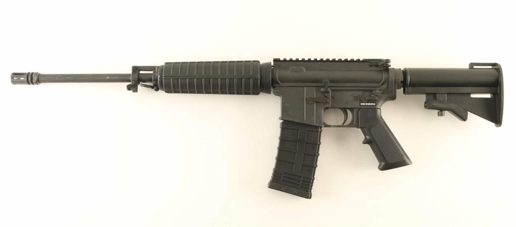 Rifle. Semi-automatic. 18" barrel, with A@ flash hider. Round hand guards. forward assist. Adjustable rear stock. Picatinny style rail on receiver. Bore appears excellent/bright. Action is crisp/tight. Metal, and polymer furniture are excellent. Comes with a Tapco 20-rd mag, a BFI 20-rd mag, manual, lock, black nylon sling. NRA Condition-Excellent. Modern Firearm.