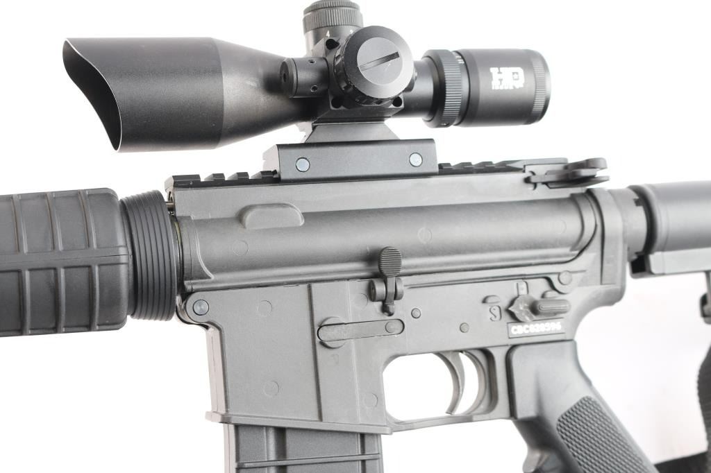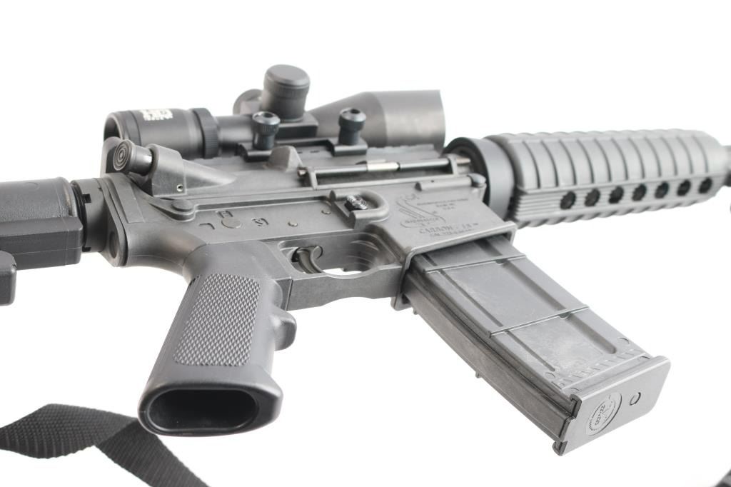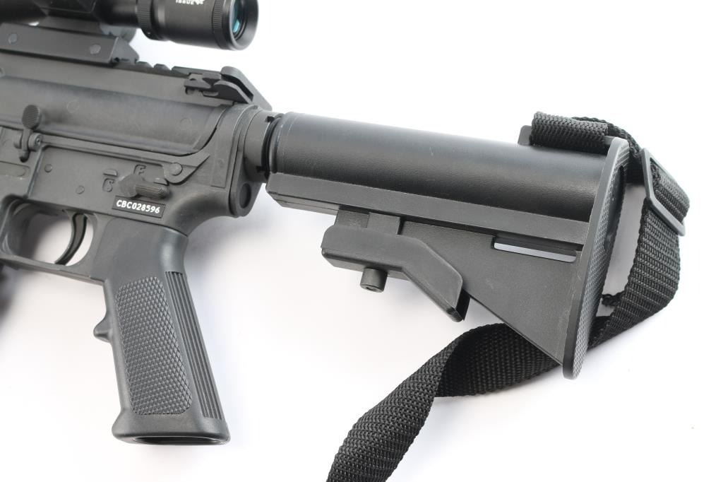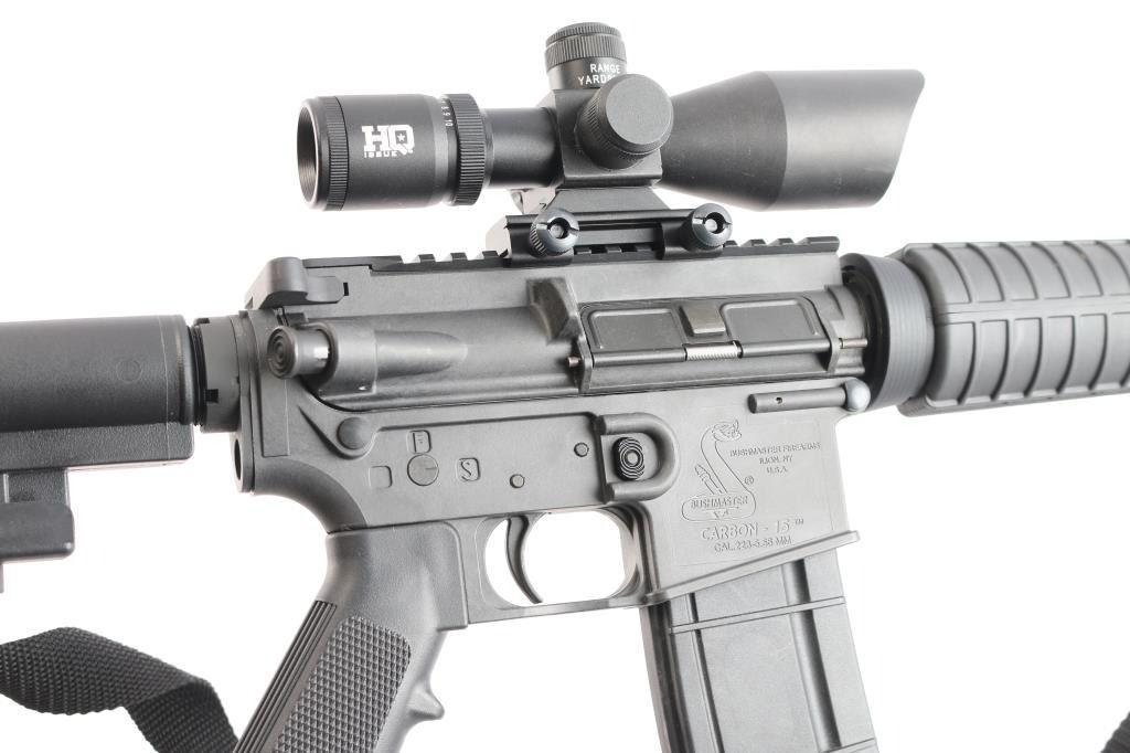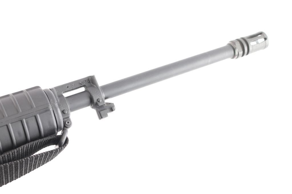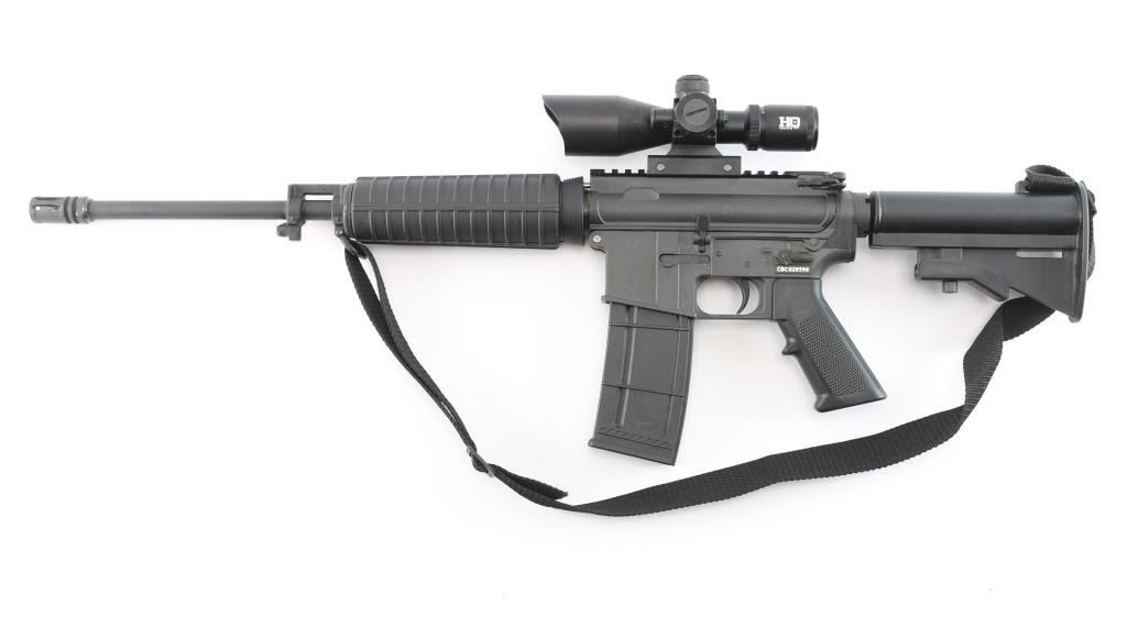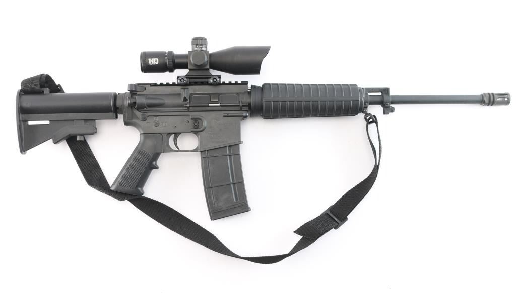AR-15 type semi-automatic rifle chambered in 5.56 NATO, light weight due to Carbon Fiber upper & lower receivers, matte black finish, A2 carbine length forearm, 4 position retractable stock, 16" pencil barrel with A2 Birdcage flash hider, 1:9 twist, bayonet lug on no-post front sight gas block, aluminum Picatinny rail section top of upper receiver with mounted HQ Issue 2.5-10X40 scope with partial mil-dot reticle and red laser (requires two AG13 batteries not installed), brass deflector and forward assist. Standard AR pistol grip, trigger, BCG and charging handle. Bore is good, scope is clear. Retains 95% of finish with faint edge wear and handling marks. Includes one IMI 30rd polymer magazine and 1 1/4" web sling. Condition is NRA Excellent. *** Modern Firearm ***.