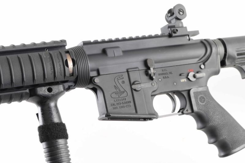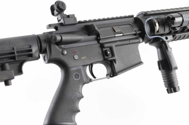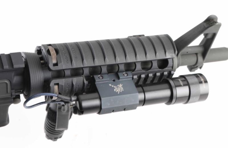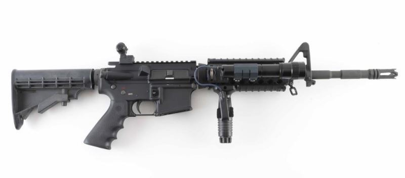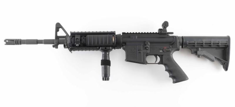 Gas operated semi-automatic AR platform modern sporting rifle chambered in 5.56x45mm NATO. Features a matte black finish, factory 14.5" (16.25" with permanently affixed - pinned & welded - flash hider) chrome lined 1/9 twist M4 profile barrel, carbine length gas system, A2 front sight/gas block with bayonet lug, forged flat-top upper receiver with forward assist, shell defector & dust cover, flip up adjustable rear peep sight attached to receiver rail, push button magazine release, manual safety, Hogue finger groove pistol grip, collapsible shoulder stock, quad rail alloy hand guard, forward sling swivel. Rifle exhibits approximately 90% of it's original finish showing scratches and other handling marks. Action is smooth, the bore is excellent, and the synthetic stocks are fine. Includes forward vertical grip, SureFire flashlight with momentary contact switch (function tests good). No magazine provided. Charging handle is missing. Missing rear sling swivel. Condition is NRA Excellent (missing charging handle) *** Modern Firearm ***