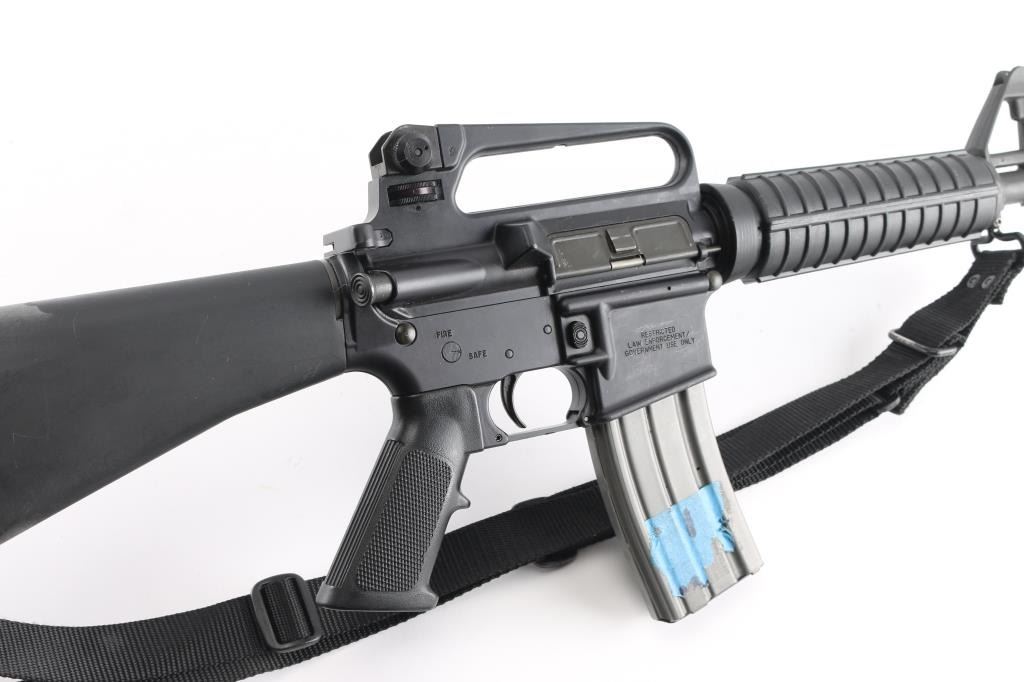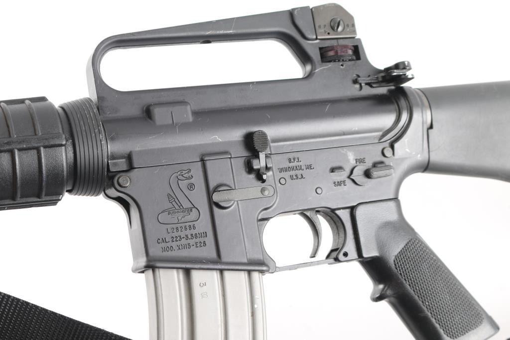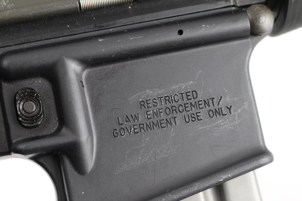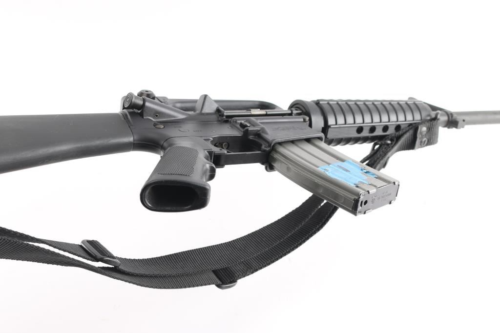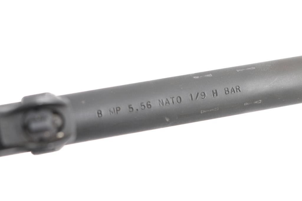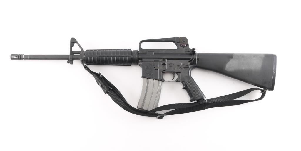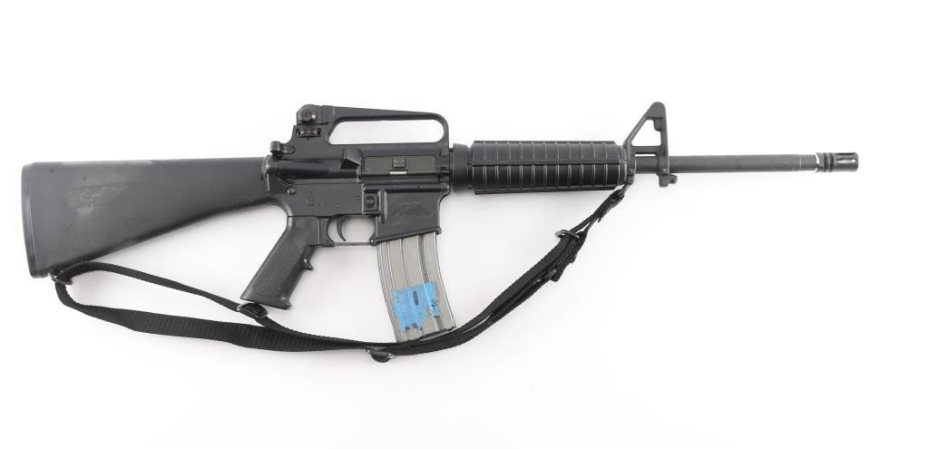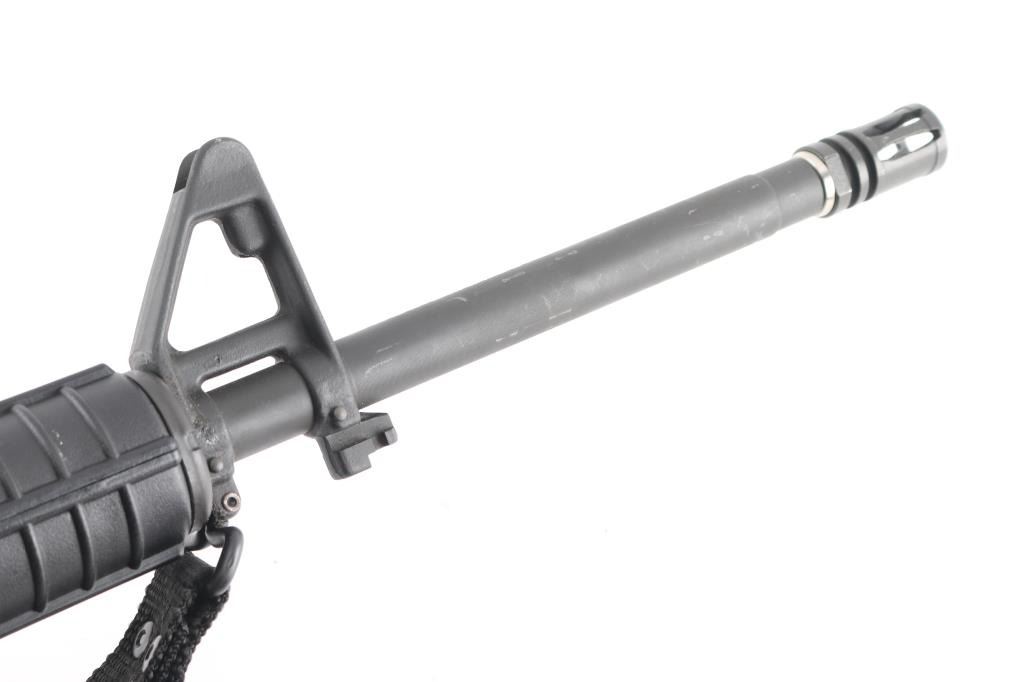 Semi-automatic AR15 platform modern sporting rifle chambered in 5.56x45mm NATO. Features a matte black finish, 16" HBAR profile barrel, 1-9 twist, threaded muzzle with bird cage flash hider, carbine length gas system, triangular front sight/gas block with bayonet lug, A2 upper receiver (with forward assist, shell defector & ejection port cover, adjustable rear peep sight), push button magazine release, manual safety, A2 style pistol grip & fixed shoulder stock with butt trap, round handguards with heat shields, sling swivels with nylon sling. Front night sight, no glow. Bore is excellent condition. Retains 90% finish with common handling marks. "165" scribed into butt plate. Polymer shows minor scratches. One magazine