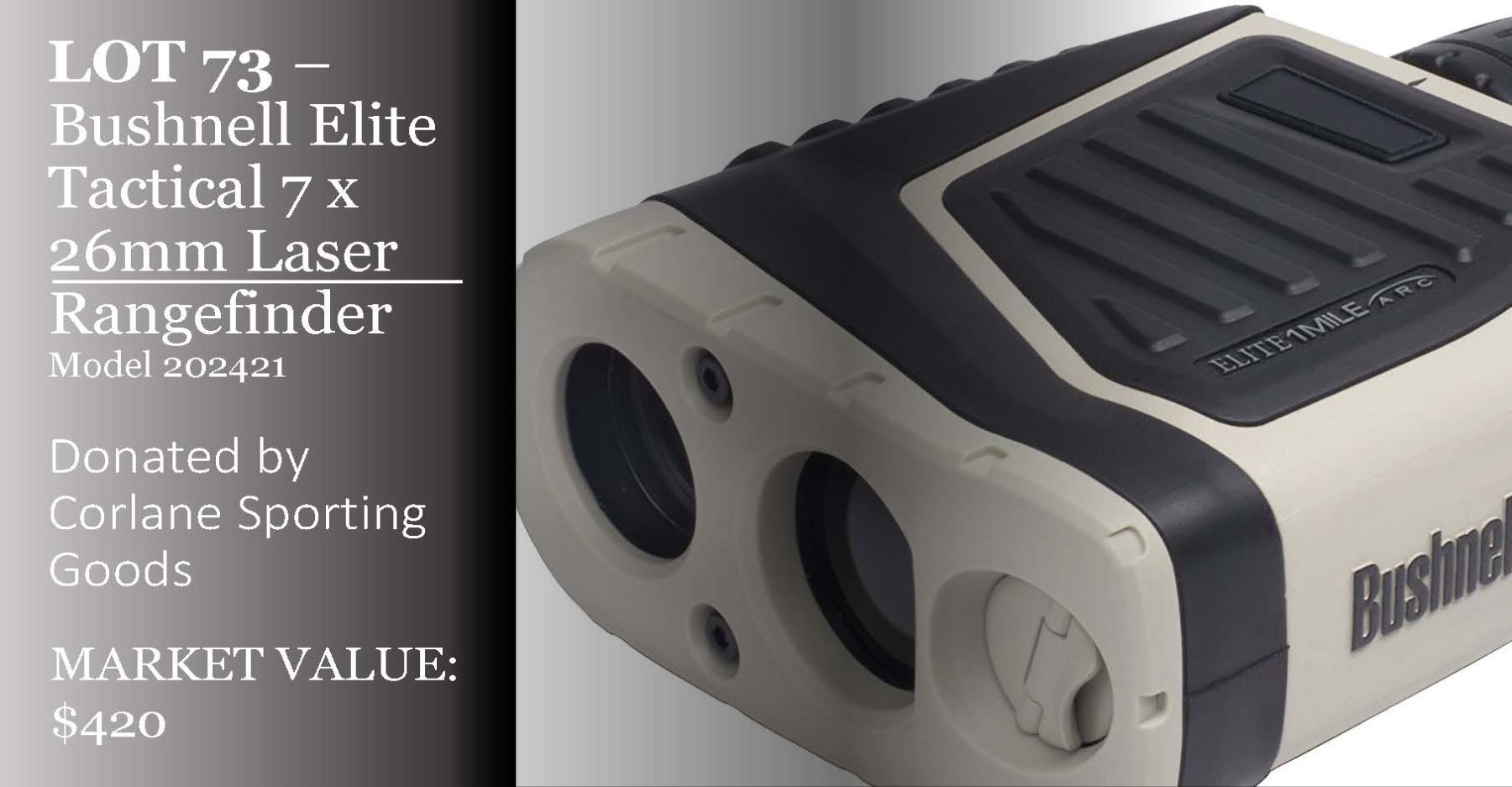 Donated by Corlane Sporting Goods This 1 Mile ARC laser rangefinder from Bushnell provides highly accurate distance measurements up to 1760 yards, along with a suite of technologies to enhance its ranging capabilities.