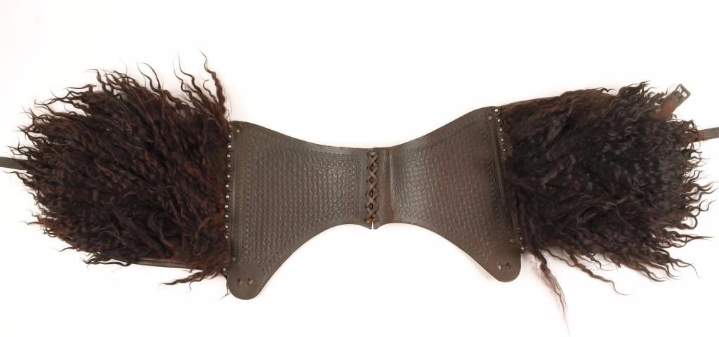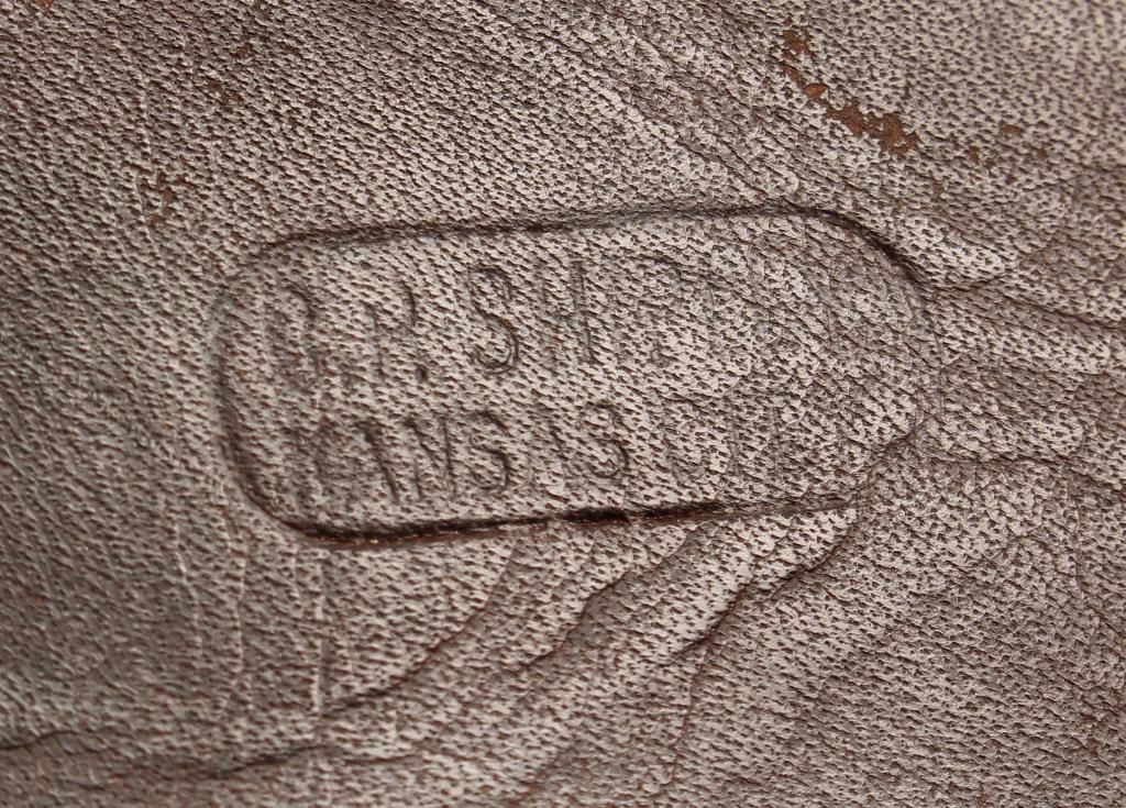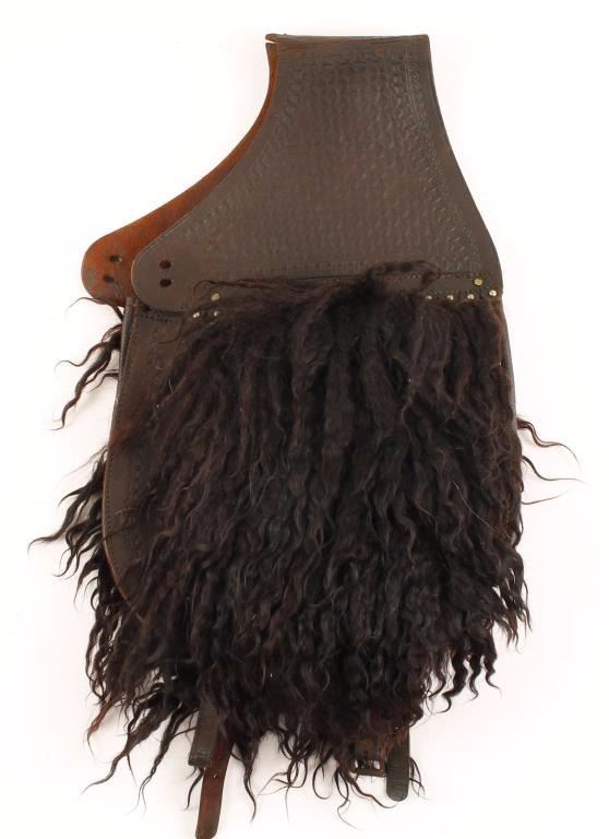Double Stamped, made in Kansas City, Decorated with spotted nickel grommets, Tops are leather with a stamped design, Circa 1900-1910. in good condition.