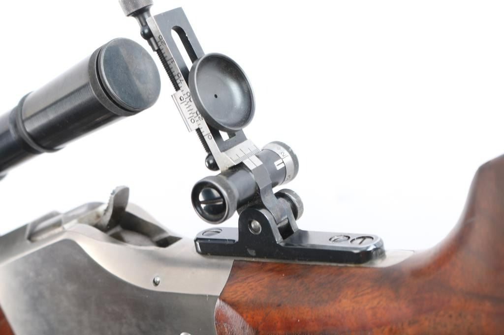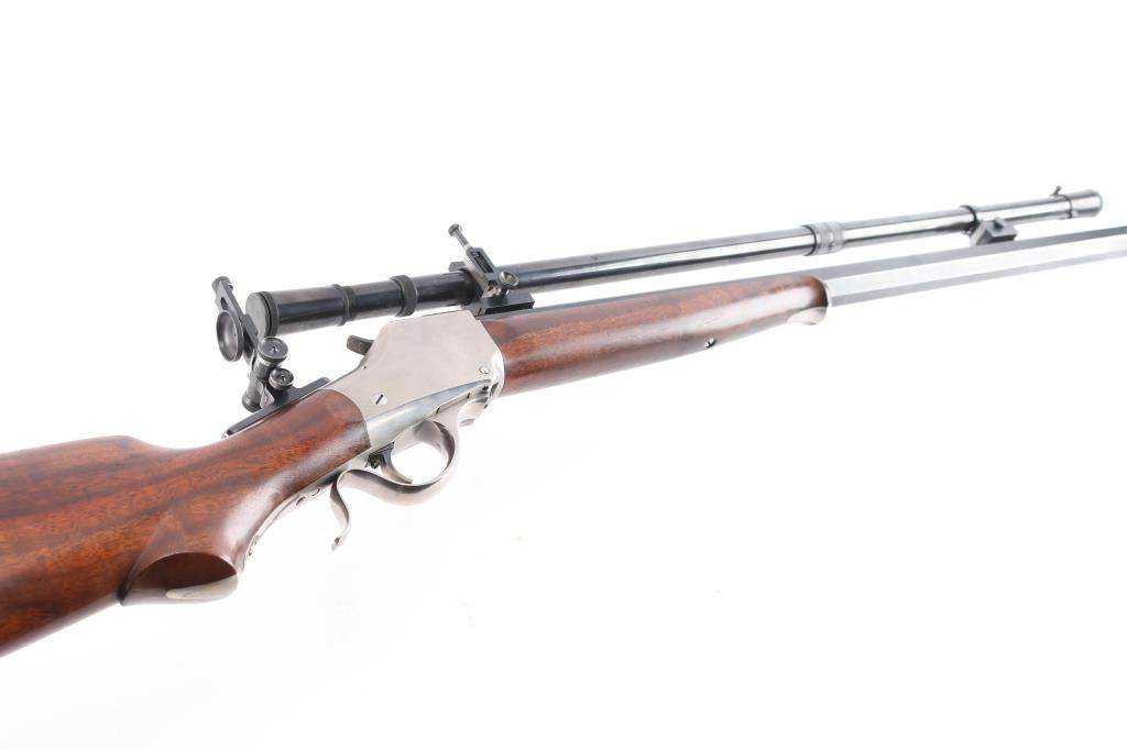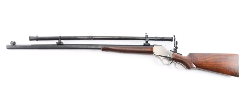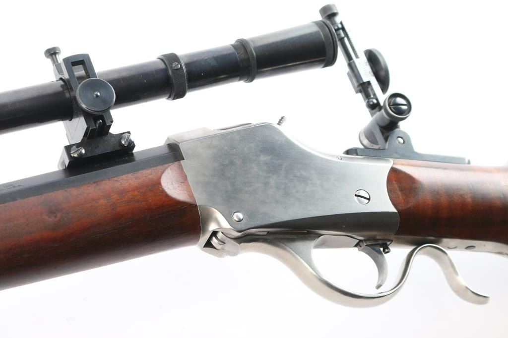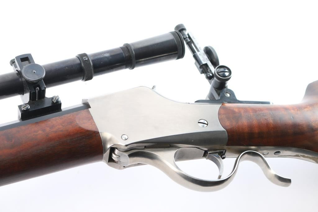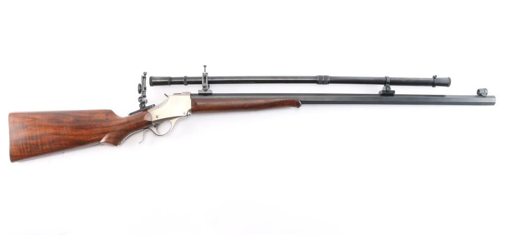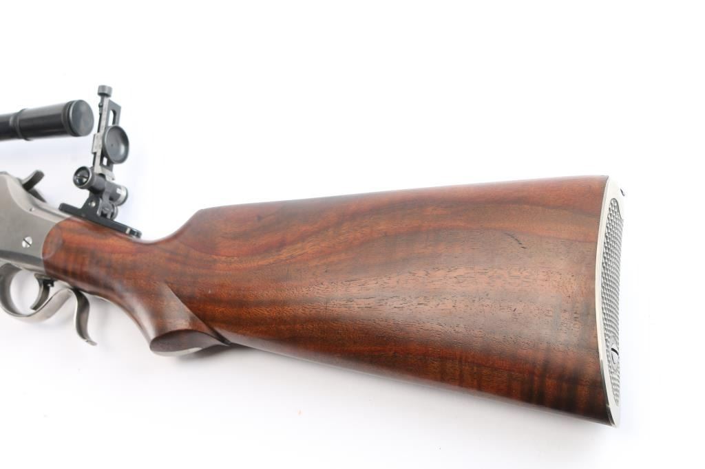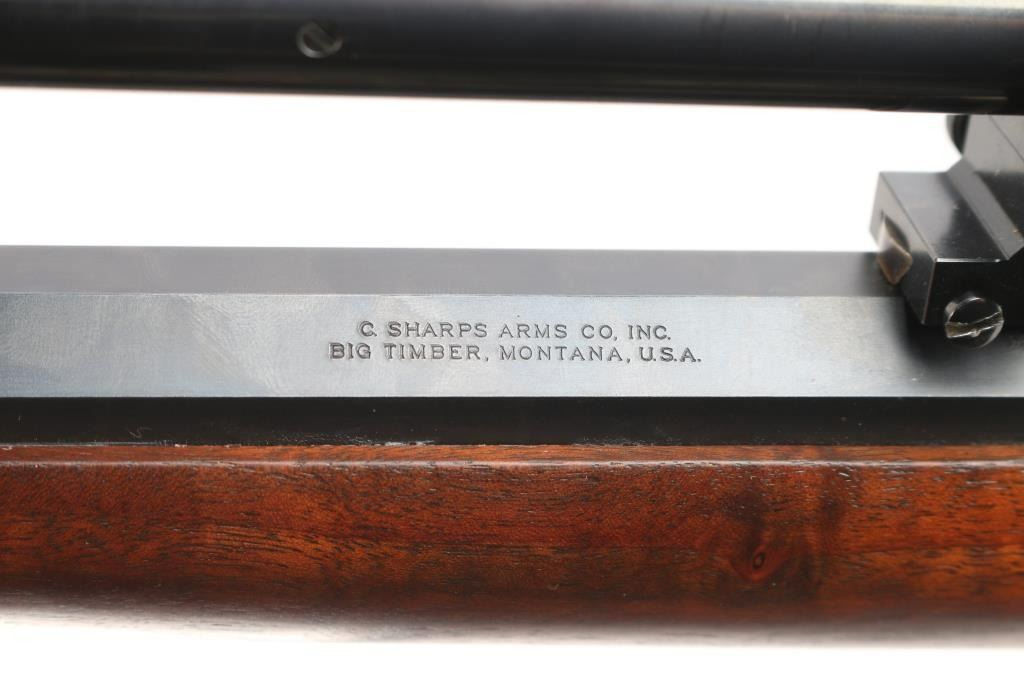 SN: 85-1345. “Old Reliable” 1885 Highwall Sporting Rifle. Consigner custom ordered this rifle with high grade wood & sights and installed the scope. Single Shot, Lever Operated, Falling Block Action, with Single adjustable Trigger. The left barrel flat is marked “Old Reliable” and “C. SHARPS ARMS CO. INC. / BIG TIMBER, MONTANA, U.S.A.” and near the receiver with ”.22 Long Rifle”. The bottom of the barrel is marked “3A” &"GM"/ Chamber is marked with the serial number & Sharps logo. 30" heavy octagonal barrel with dovetailed globe front sight with post insert, C. Sharps Vernier style tang sight with windage adjustment, a mid-range staff, and a medium sized eye disc. Montana Vintage Arms series 3000 6x 28" blued steel scope installed on top barrel flat, Parallax adjustable. Reticle adjustment for level, pope-style rib, battery stop. Malcolm-style mounts (blue steel) with front and rear windage adjustment. Smooth schaebel tipped forearm with silver inlay, smooth pistol grip buttstock with Niedner checkered steel buttplate, silver inlay in grip. Blued barrel with polished receiver/lever. Fancy walnut figured stock with sand in full finish with satin oil based seal. The bore is excellent/bright, the falling-block action is smooth and the finish & wood are excellent.