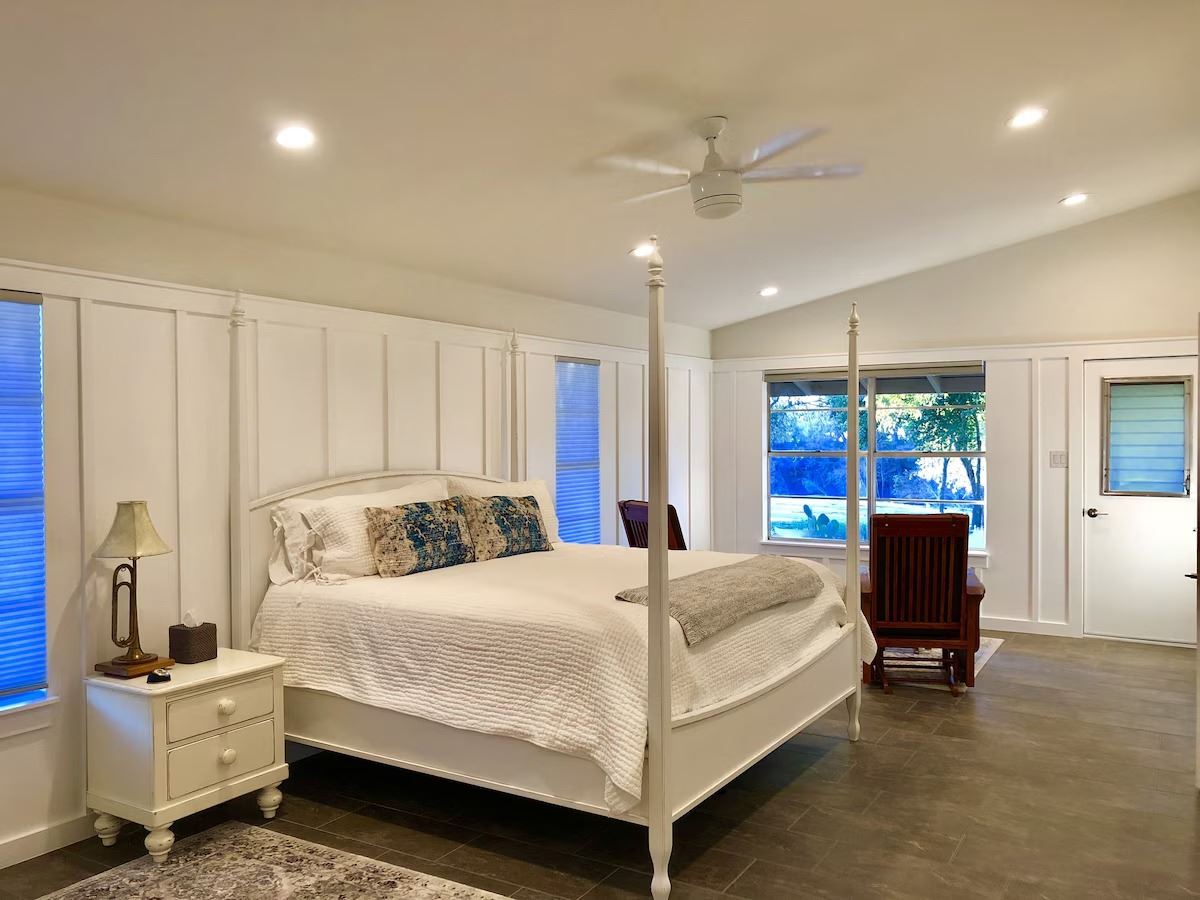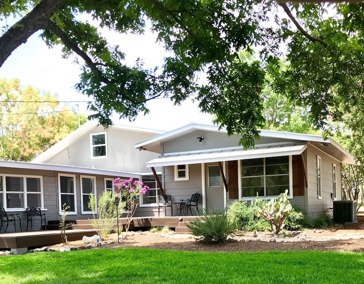Experience privacy and amenities at "Comfort Acres" on the Guadalupe River with a ranch house and a small party Barn for up to 7 people. A totally renovated 3 bedroom/3 bath 1950s ranch house overlooking the Guadalupe River on 9.5 acres with over 1200 LF of river frontage to roam, fish, kayak, swim, tube, or just relax and enjoy the breeze. Minutes from the antique town of Comfort, we are nestled just off the highway in a quiet setting full of shady pecan and oak trees. The property has an old barn that has been converted into a small "party barn" for entertaining. If you like to sit on a porch, gaze at the stars, or watch the whitetail and axis deer graze, we have over 1,000 feet of deck and porch area to enjoy! Easy access to Hill Country shopping, dining, and more! HSCF thanks Cedar Eaters of Texas for this generous donation.