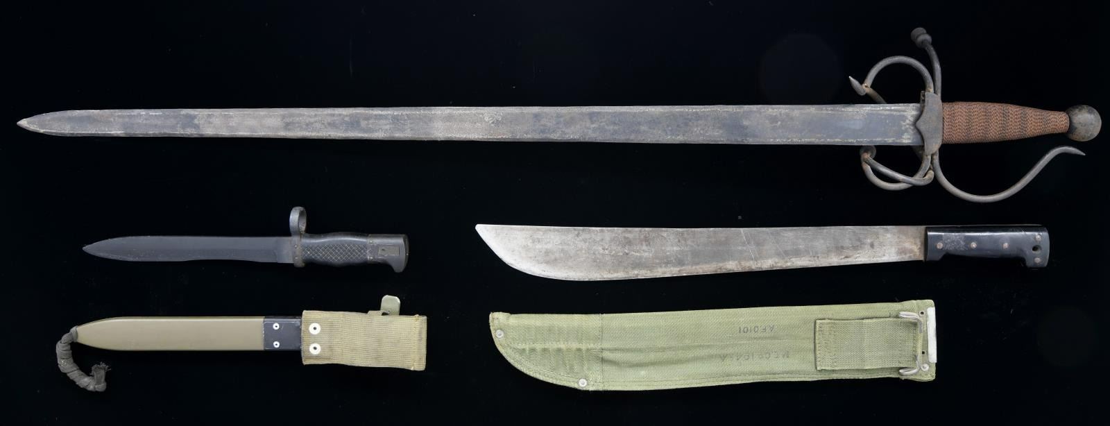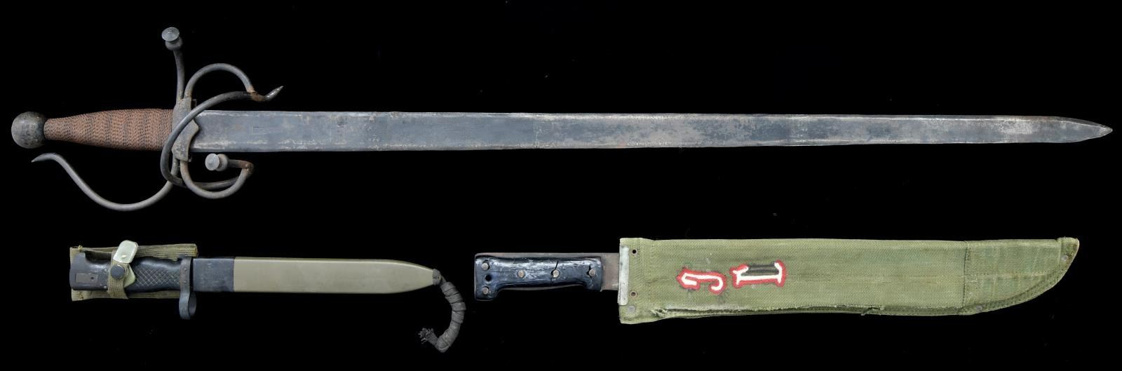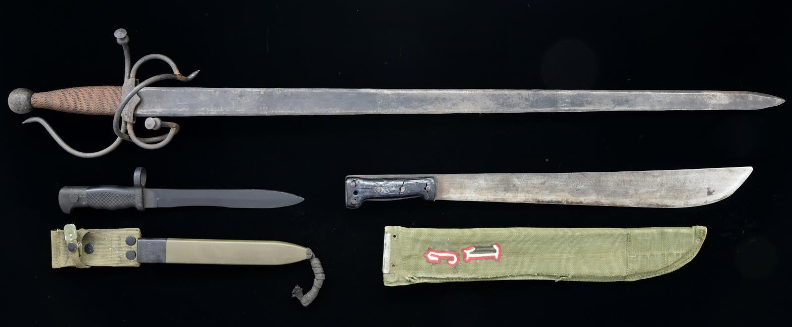1) Toledo CETME bayonet w/ scabbard. S# ET5903A. CONDITION: very good overall. 2) A.H. Bisby & Co. 1945 dated machete w/ scabbard. Scabbard has 2 painted "C". CONDITION: scabbard has large tear; good overall. Machete in fair overall w/ cleaned oxidation, left panel is shrunk, cracked & broken. 3) SPANISH COPY OF LANDSKNECHT SWORD. Overall: 42 1/2". Blade: 36". Wire grip. Steel guard. CONDITION: fair w/ corrosion, pitting & oxidation. (02-19533/MD). $125-225.