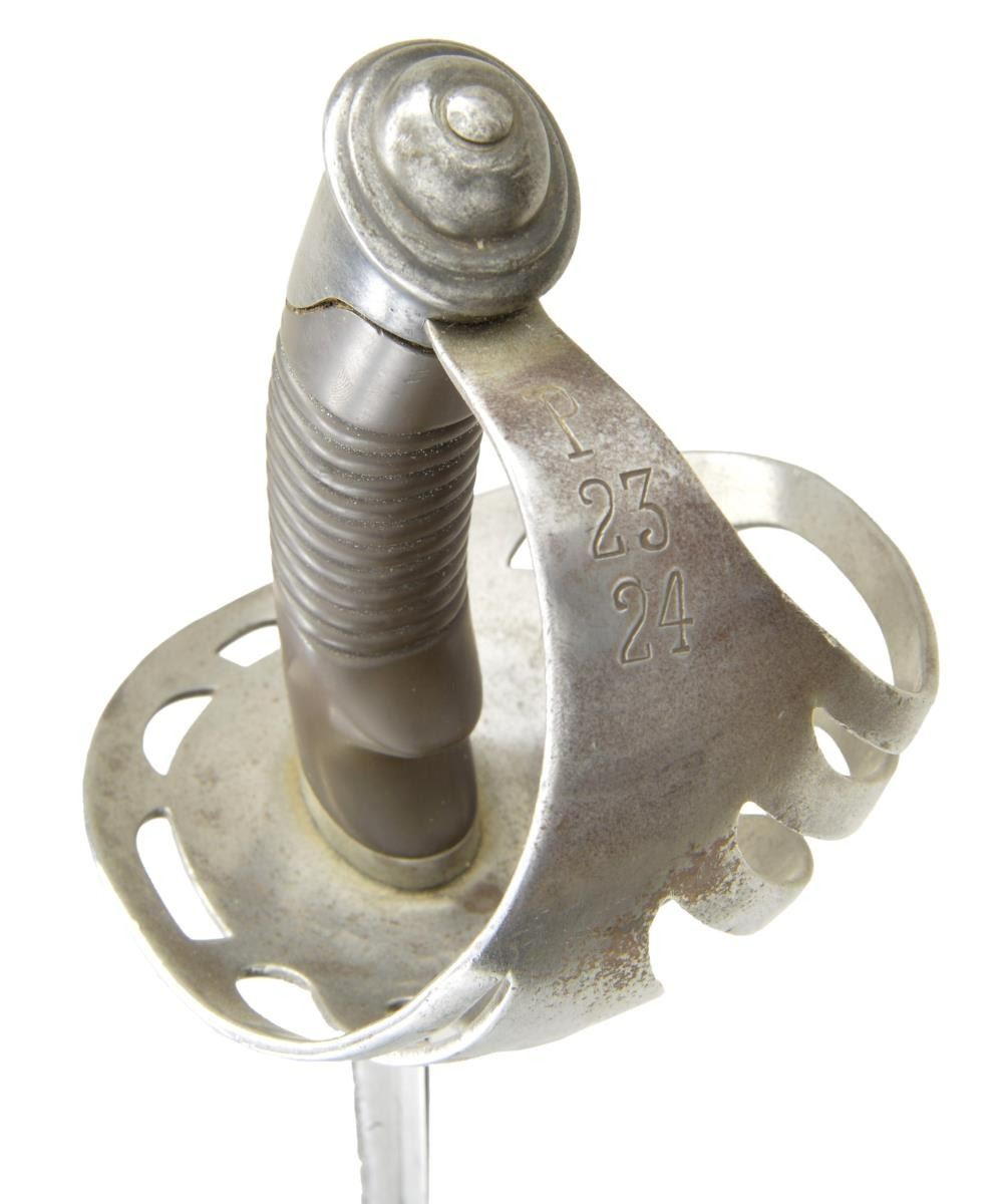 Overall length: 40 1/2". Blade length: 33 3/8”. Plain blade with a single wide deep fuller. Blade is stamped near the hilt with a shield & star on one side, and a “B” & “C” in circles on the other. The blade is marked on the spine “Manufacture d’armes de Chatellerault JH”. Large steel basket guard with 12 cutouts of various sizes. Pommel is of a modified Phrygian helmet style. Grip is dark brown composite material with a ridge for the first finger. Steel scabbard. CONDITION: blade has a medium gray patina with areas of cleaned light pitting. The hilt has a medium to dark patina, and the grip is undamaged. Scabbard has several shallow dents and has a cleaned oxidized finish. (02-19381/BF). $250-400.