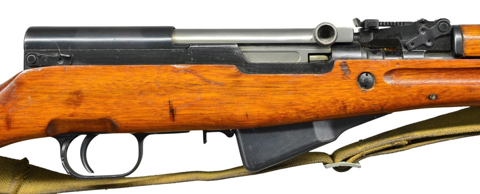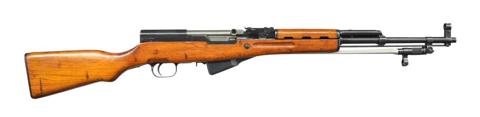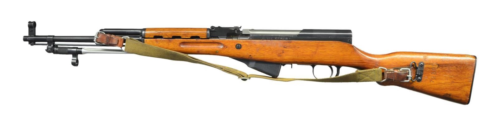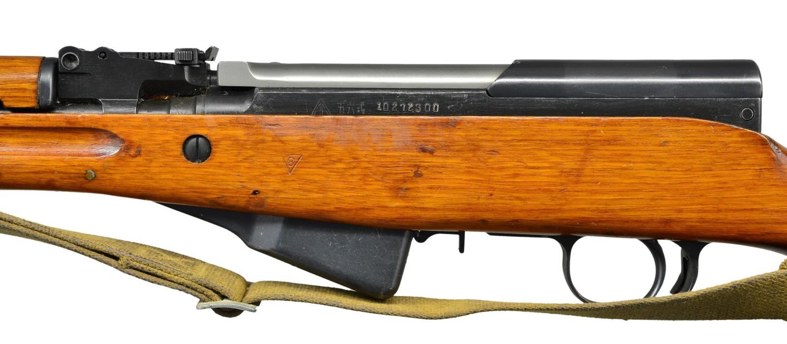 Cal. 7.62x39. S# 10272300. Bbl. 20". All visible matching numbers. Left side of receiver has Triangle 26 (Jianshe) arsenal marking & serial number. No import markings found possible Vietnam bringback but no paperwork. Tangent rear sight graduated to 1000m. Post front sight w/ hood. Folding spike bayonet w/ 11 1/2" blade. Asian hardwood stock set w/ canvas Com Bloc sling. Cleaning rod present. CONDITION: stock set retains much arsenal finish w/ some flaking, scattered dings, scratches & handling wear. Metal retains 75% arsenal rework blue w/ some pitting on magazine, scattered fading & edge wear. Very good bright bore. PROVENANCE: From the Lifelong Collection of Glen E. Mattox. (23-106/MJC). MODERN. $300-500.