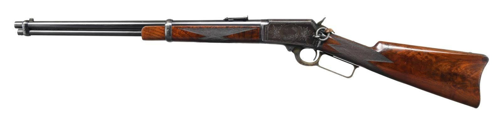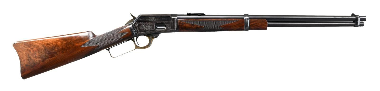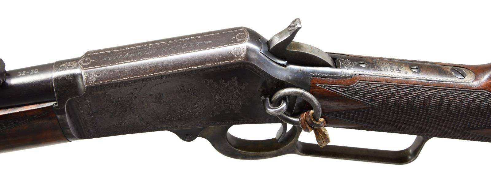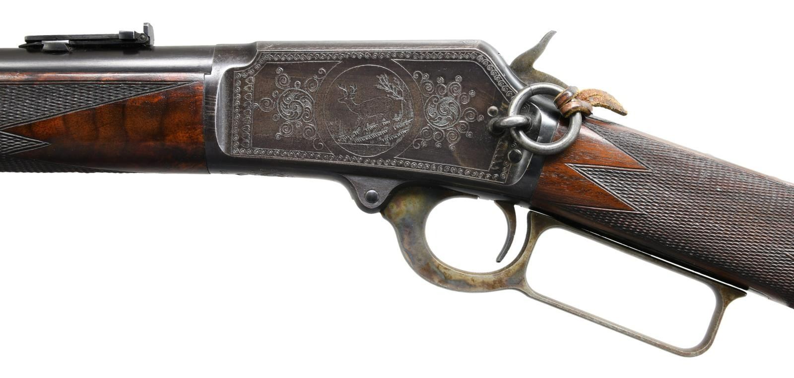 SADDLE RING CARBINE. Cal. 32-20. S# 174732 signifying that this rare carbine was manufactured in 1898 during the time that Conrad Ulrich was engraving for the company. Very few 1894 rifles were engraved and saddle ring carbines are rarely encountered. We believe that there are as few as 5 known examples in this configuration. The 20” carbine barrel holds a full-length magazine with a Barleycorn front sight and a carbine leaf rear sight held with two barrel bands. It is mounted on saddle ring action that is hand engraved in a no. 1 pattern featuring a vignette of a white-tailed buck standing on a hillside woodland scene on the left side. The engraved panel is surrounded with fine scroll that is bordered with a wavy line and fancy scroll with heart embellishments. Complimenting engraving is found on the right side of the receiver with matching borders. The top & bottom of the receiver, top tang, & bolt have nicely executed complimenting engraving. It has a figured fancy walnut stock that is checkered in factory B pattern hand checkering and ended with a steel carbine buttplate and carbine forearm. CONDITION: Overall, very fine with the barrel and magazine retain 95% of their original factory blue with a duller appearance to the magazine tube showing light scratches and scattered mild handling marks. The frame retains a very high percentage of patinaed factory blue with fading in the carry area. Blued components show some minor edge wear and a few mild handling marks. Lever has vivid case coloring that has faded to silver on the outer surfaces. Bolt and loading gate retains much of its original finish. The stock maintains the original finish with some light wear to the points of the checkering and minor handling marks there is a minor repair to miniscule chips at the lower tang. The bore is bright and shiny with sharp rifling. PROVENANCE: William Blount Collection of Extraordinary Marlins. (01-25292/ZAL) ANTIQUE. $20,000- 30,000.