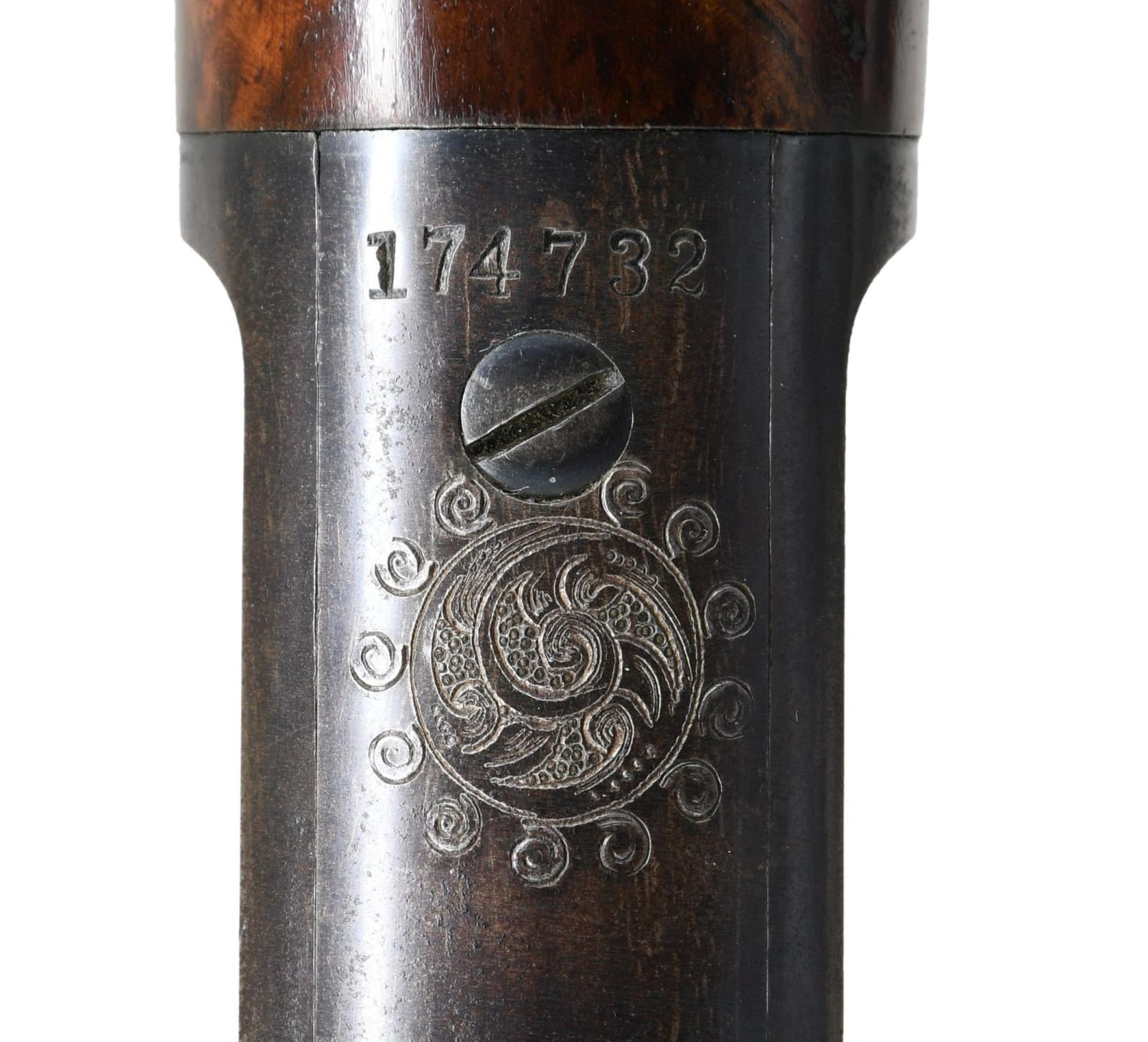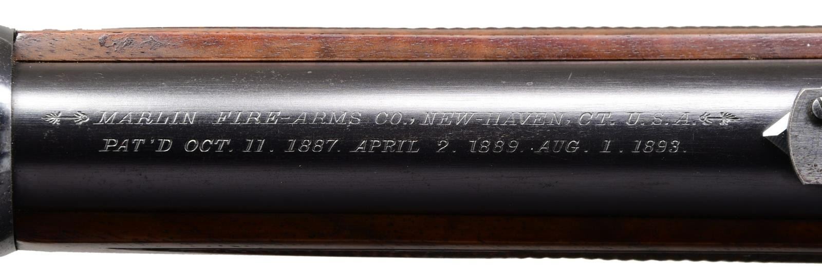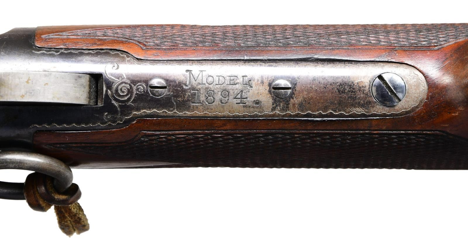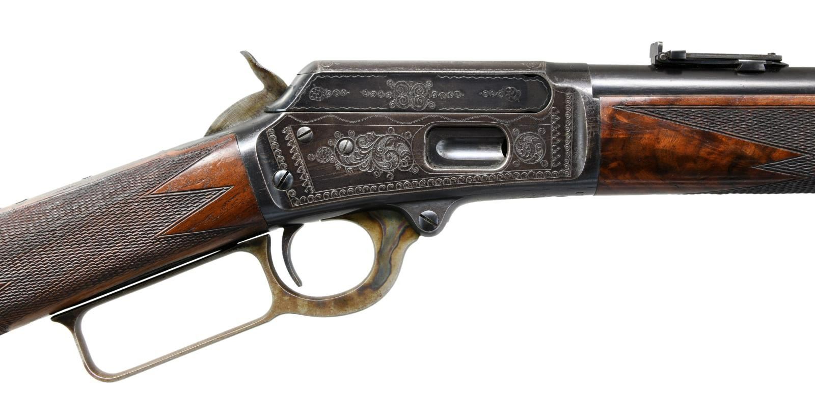 SADDLE RING CARBINE. Cal. 32-20. S# 174732 signifying that this rare carbine was manufactured in 1898 during the time that Conrad Ulrich was engraving for the company. Very few 1894 rifles were engraved and saddle ring carbines are rarely encountered. We believe that there are as few as 5 known examples in this configuration. The 20” carbine barrel holds a full-length magazine with a Barleycorn front sight and a carbine leaf rear sight held with two barrel bands. It is mounted on saddle ring action that is hand engraved in a no. 1 pattern featuring a vignette of a white-tailed buck standing on a hillside woodland scene on the left side. The engraved panel is surrounded with fine scroll that is bordered with a wavy line and fancy scroll with heart embellishments. Complimenting engraving is found on the right side of the receiver with matching borders. The top & bottom of the receiver, top tang, & bolt have nicely executed complimenting engraving. It has a figured fancy walnut stock that is checkered in factory B pattern hand checkering and ended with a steel carbine buttplate and carbine forearm. CONDITION: Overall, very fine with the barrel and magazine retain 95% of their original factory blue with a duller appearance to the magazine tube showing light scratches and scattered mild handling marks. The frame retains a very high percentage of patinaed factory blue with fading in the carry area. Blued components show some minor edge wear and a few mild handling marks. Lever has vivid case coloring that has faded to silver on the outer surfaces. Bolt and loading gate retains much of its original finish. The stock maintains the original finish with some light wear to the points of the checkering and minor handling marks there is a minor repair to miniscule chips at the lower tang. The bore is bright and shiny with sharp rifling. PROVENANCE: William Blount Collection of Extraordinary Marlins. (01-25292/ZAL) ANTIQUE. $20,000- 30,000.