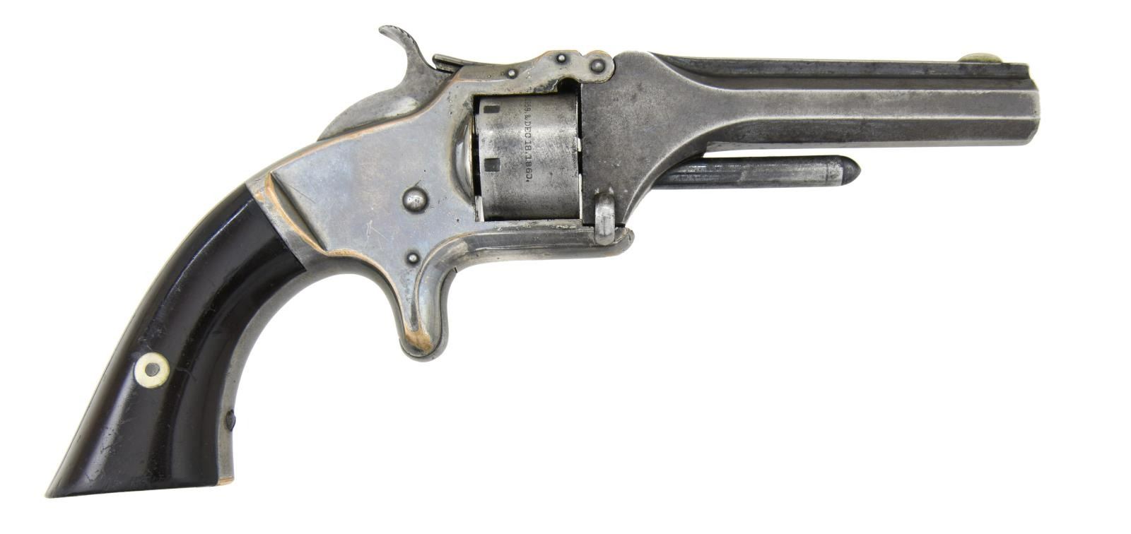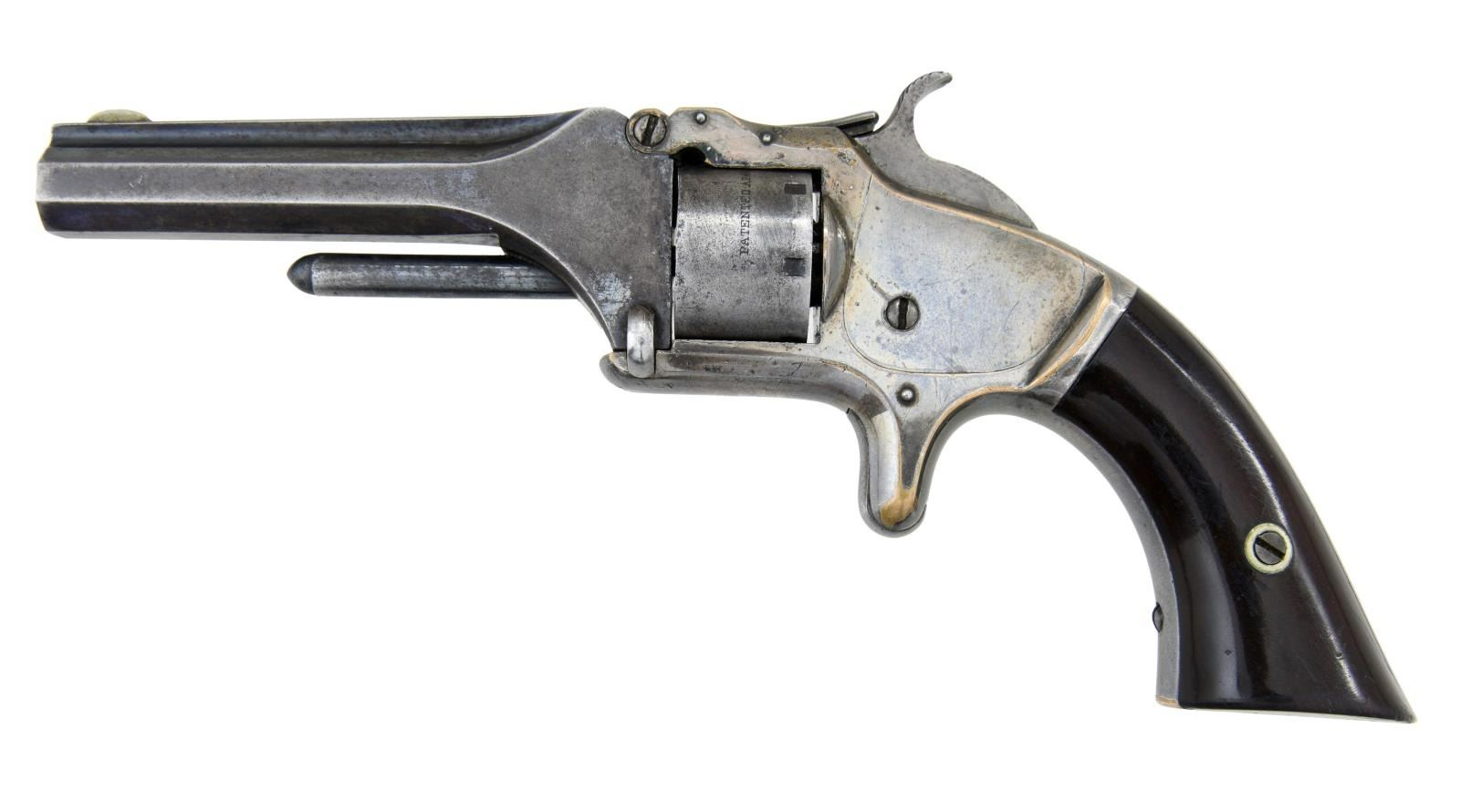 REVOLVER. Cal. 22 RF (22 Short). S# 44430 (1860-1868). Bbl. 3 1/4" w/ rib. rounded blade front sight. 7 Shot cyl. 2 Piece rosewood grips. CONDITION: blue fading to gray patina showing light marks, pinprick oxidation & edge wear. Silver plating on frame has dark tarnish, fading along edges, peeling around cyl. & several marks on butt. Very good grip varnish w/ marks on butt, scratches & wear spots. Good bore w/ distinct rifling & light pitting throughout. (01-22632/MD). ANTIQUE. $200-400.