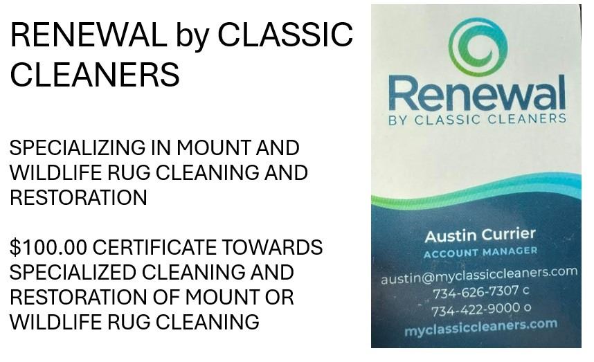 Get that Big Game Trophy Restored to like it just same from the Taxi Shop! Use this $100 certificate towards a Wildlife Rug Cleaning or Mouse RestorationDonated by Austin - Classic Cleaners