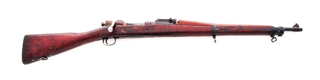 CMP Shipped U.S. Model 1903 Bolt Action Rifle, by Springfield, #1451389, .30-06 cal., 24'' HS barrel dated 9-44, blue finish, straight wrist non-finger groove walnut stock and upper handguard, with receipt from Anniston, AL, dated 4-29-2002. In modern DCM shipping box. Condition is very good, covered with cosmoline. Action shows plum-colored refinish to blue components. Stock with moderate bruising. Hi-Standard barrel is fine. Est.: $450-$650. (C&R)